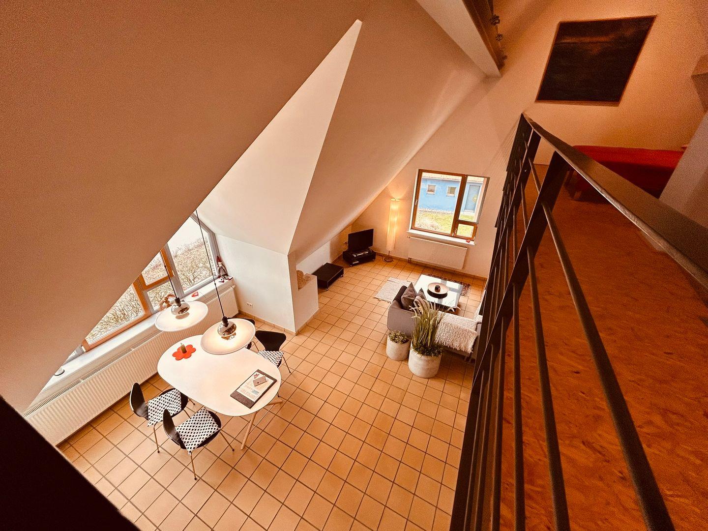 Die Ferienwohnung verfügt über drei geschmackvoll eingerichtete Schlafzimmer, die alle eine ruhige Atmosphäre ausstrahlen und perfekte Rückzugsorte nach einem erlebnisreichen Tag bieten. Die zwei Badezimmer mit Dusche garantieren Komfort für alle Gäste. Die Küche ist mit allen notwendigen Geräten ausgestattet, darunter ein Kühlschrank, eine Spülmaschine, eine Mikrowelle und eine Kaffeemaschine, sodass Sie problemlos Ihre Lieblingsgerichte zubereiten können. Entdecken Sie einen großzügigen Wohnbereich im Loftstil, der mit einer Deckenhöhe von 8 Metern eine luftige Atmosphäre schafft und mit gemütlichen Sitzmöbeln zum Verweilen einlädt. Der separate Essbereich am großen Panoramafenster bietet einen herrlichen Ausblick und lädt zu gemeinsamen Mahlzeiten ein.