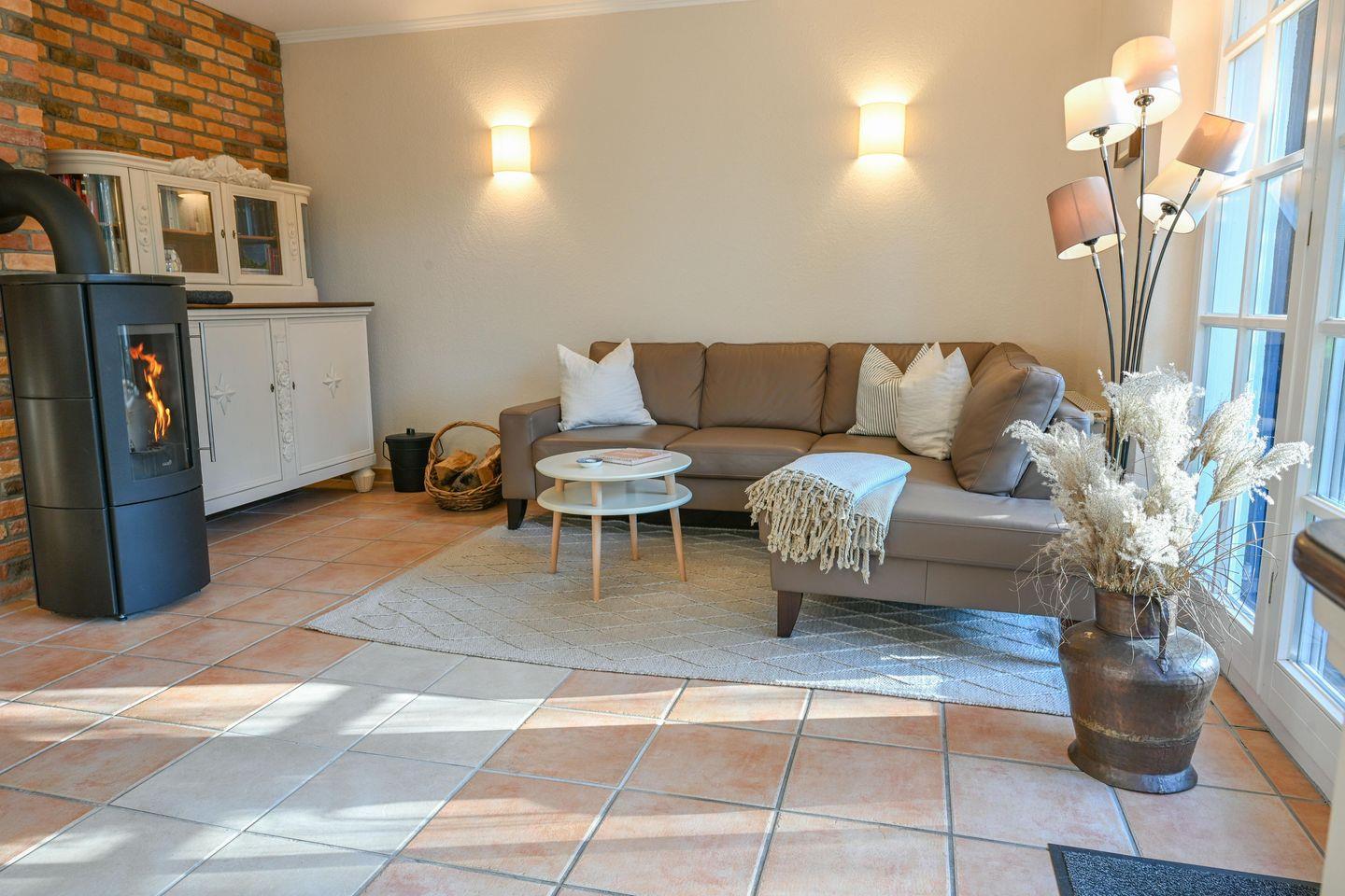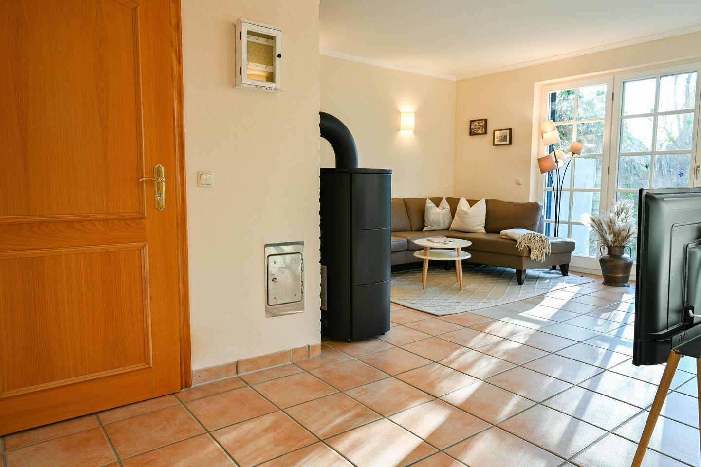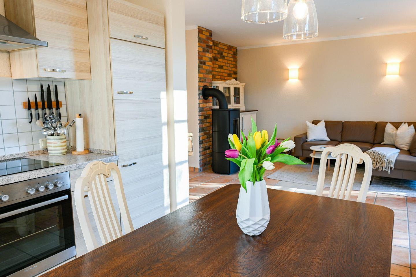 Die Ferienwohnung bietet Platz für bis zu 4 Personen. Sie hat einen offenen Wohnbereich mit einer gemütlichen Sofalandschaft, Flat-TV und Kamin. Die angrenzende offene Küche mit Essplatz ist voll ausgestattet. Es gibt zwei Schlafzimmer (Doppelbett 180x200cm/ Tagesbett mit zwei Matratzen 80x200cm) und ein Badezimmer mit Dusche und WC. Alle Fenster sind mit Insektenschutzgittern ausgestattet. Vom Wohnzimmer aus lädt die Terrasse mit eigenem Strandkorb und Gartenmöbeln zum Entspannen ein.