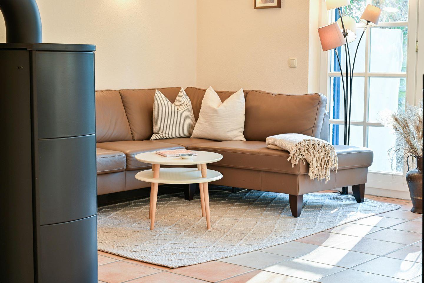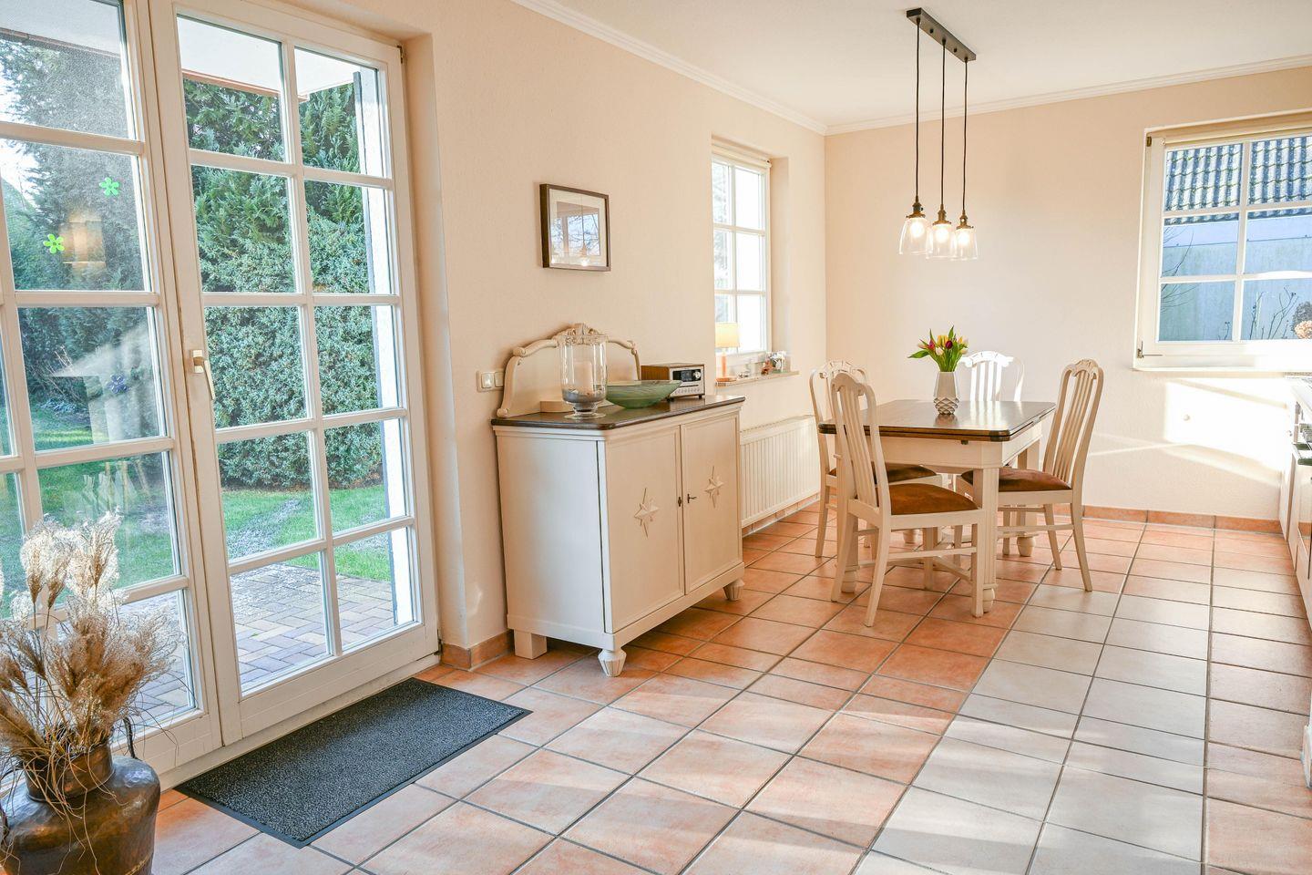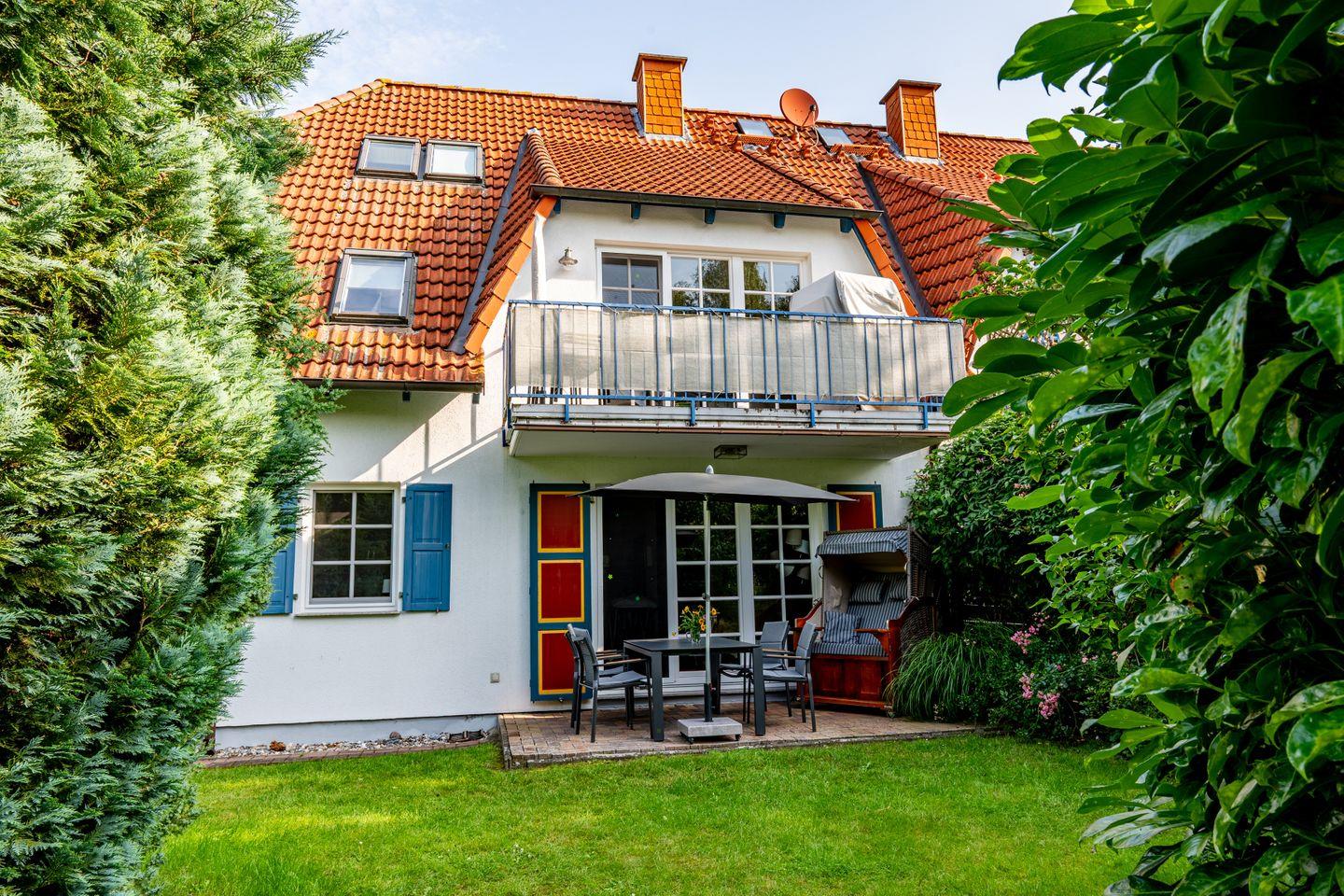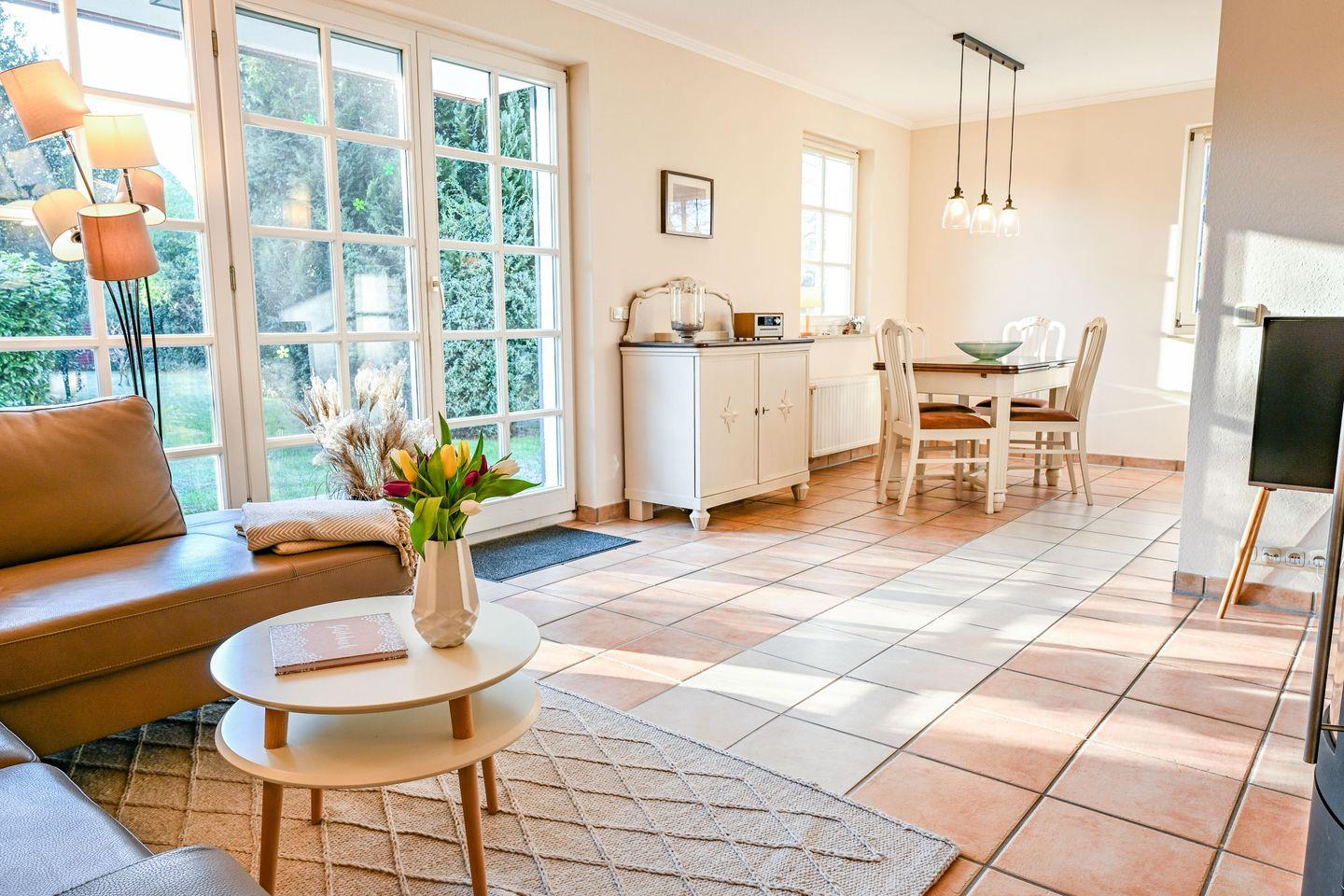 Die Ferienwohnung bietet Platz für bis zu 4 Personen. Sie hat einen offenen Wohnbereich mit einer gemütlichen Sofalandschaft, Flat-TV und Kamin. Die angrenzende offene Küche mit Essplatz ist voll ausgestattet. Es gibt zwei Schlafzimmer (Doppelbett 180x200cm/ Tagesbett mit zwei Matratzen 80x200cm) und ein Badezimmer mit Dusche und WC. Alle Fenster sind mit Insektenschutzgittern ausgestattet. Vom Wohnzimmer aus lädt die Terrasse mit eigenem Strandkorb und Gartenmöbeln zum Entspannen ein.