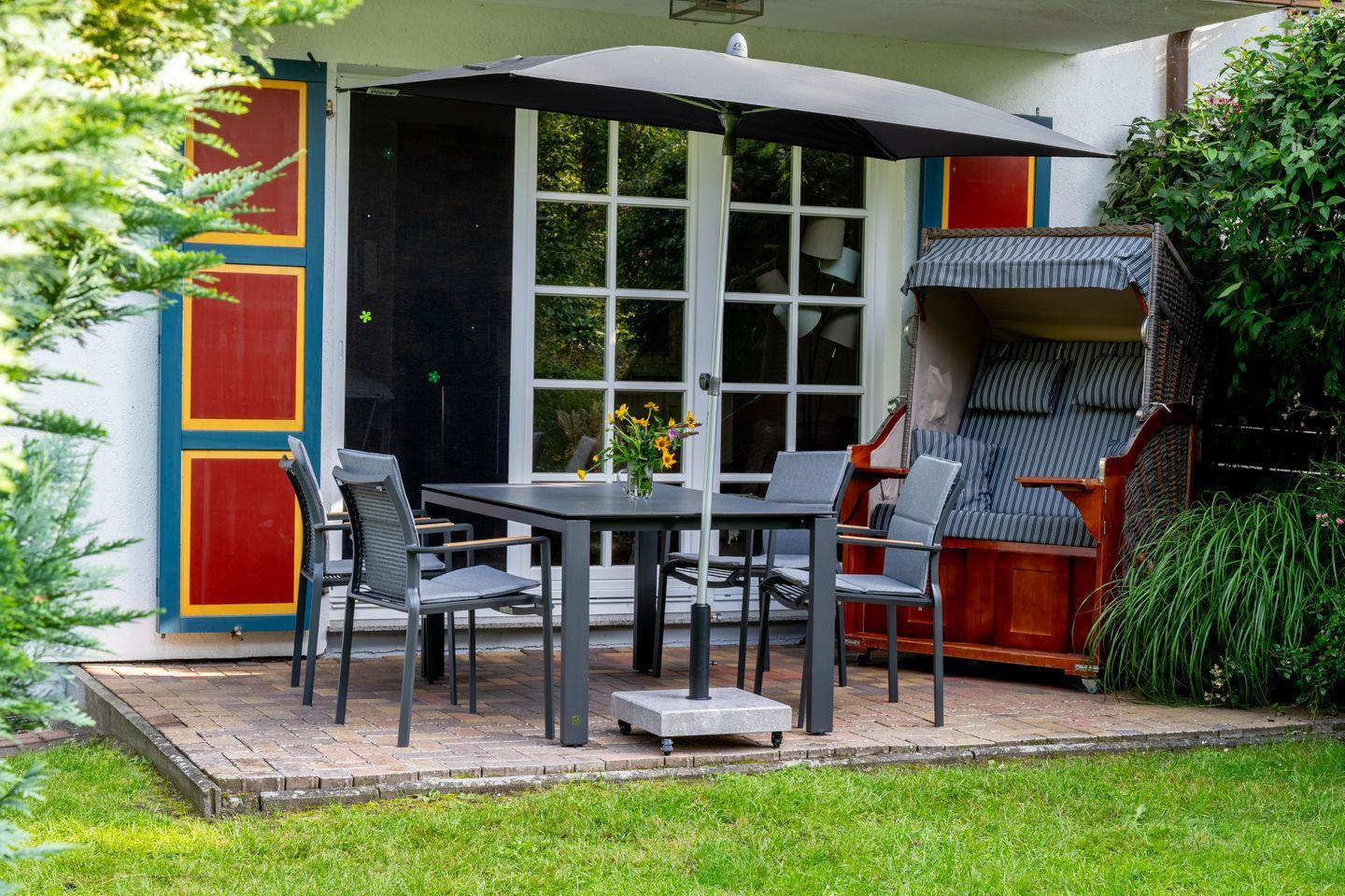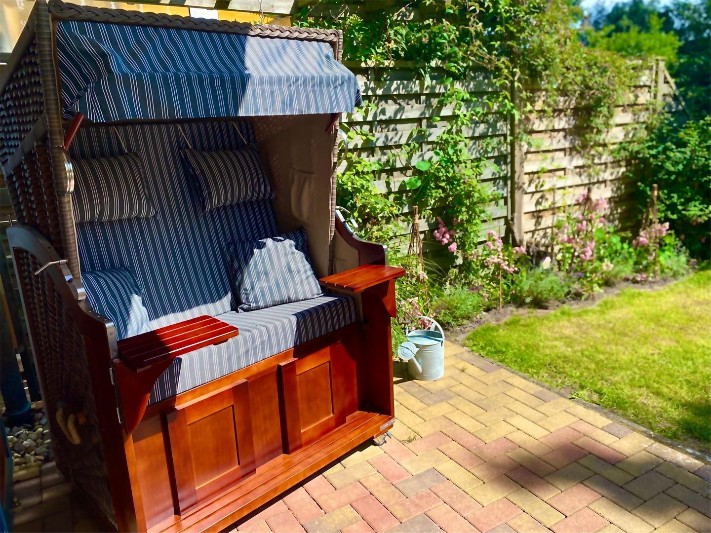 Der Garten bietet ruhige windgeschützte Sitzmöglichkeiten, eine Liegewiese und eine Grillecke. Er kann von allen Gästen genutzt werden. Für mitgebrachte Fahrräder gibt es einen abschließbaren Schuppen. Ein Parkplatz steht zur Verfügung, wobei auf Wunsch auch ein zweiter Parkplatz möglich ist.