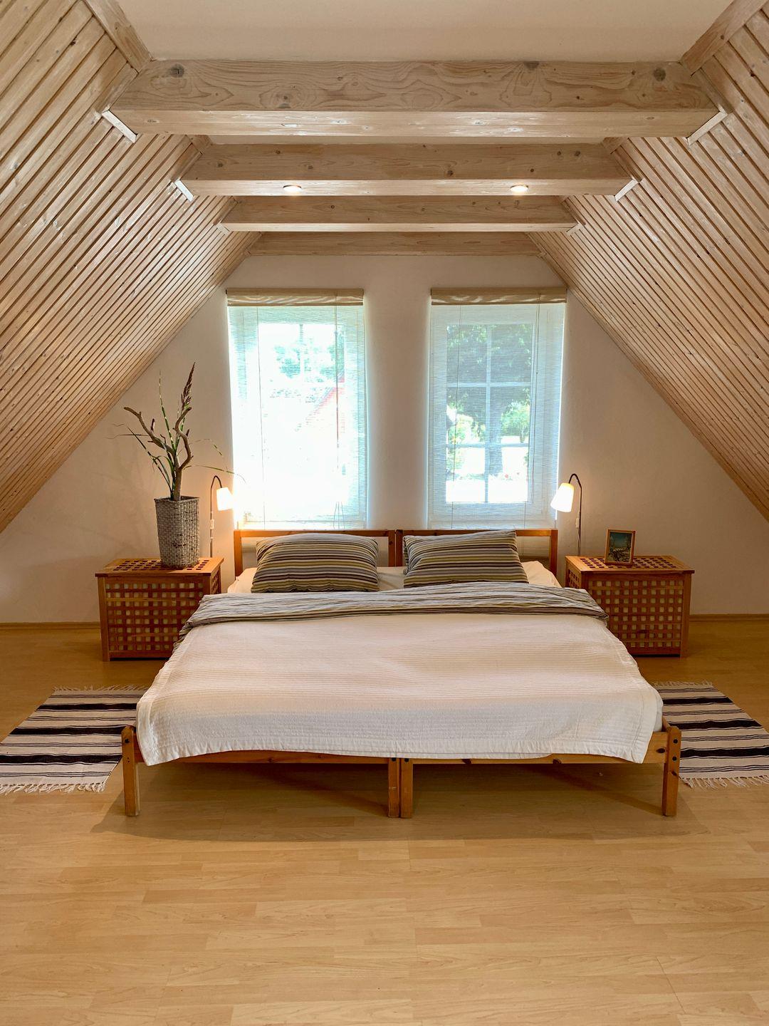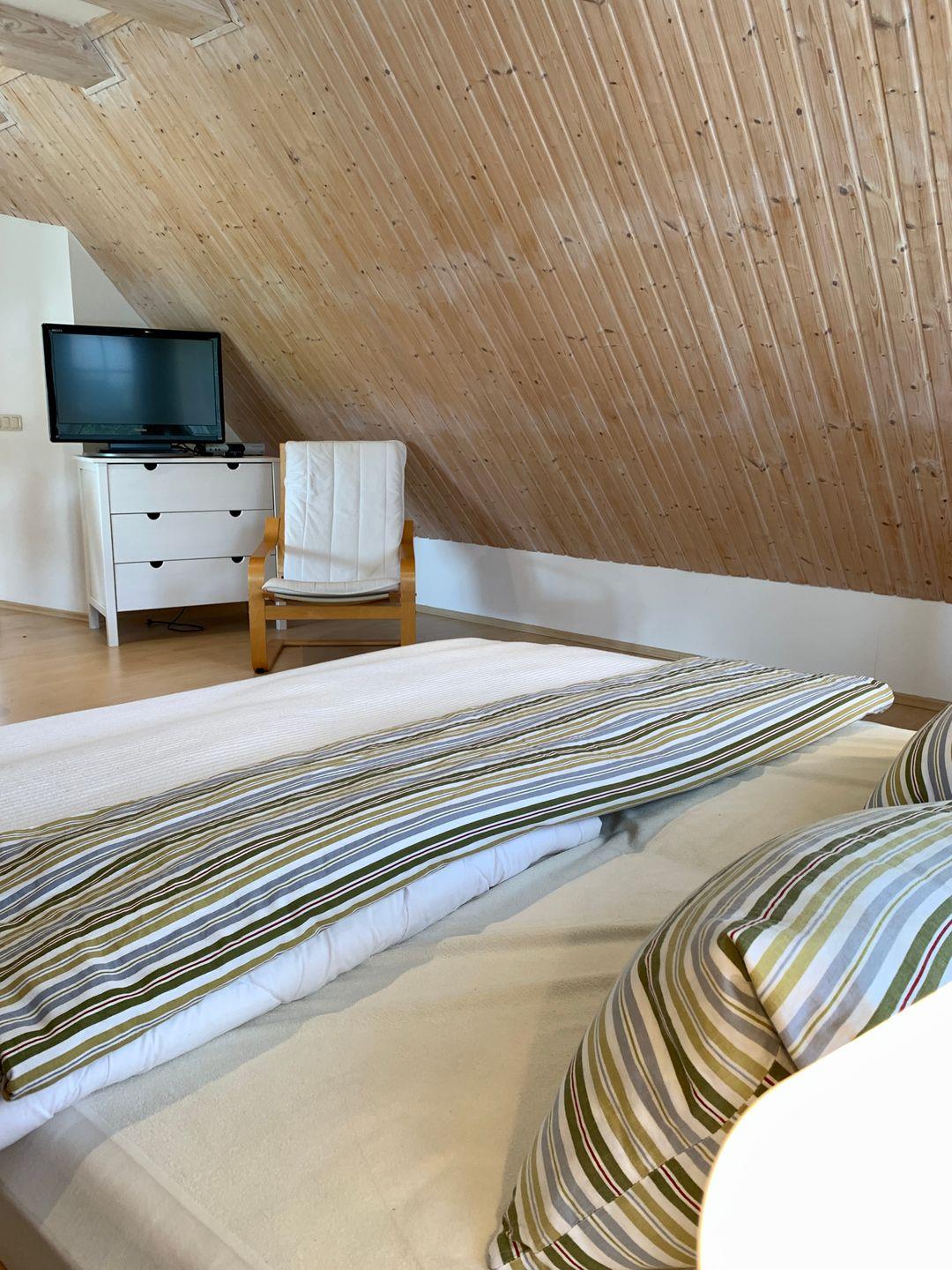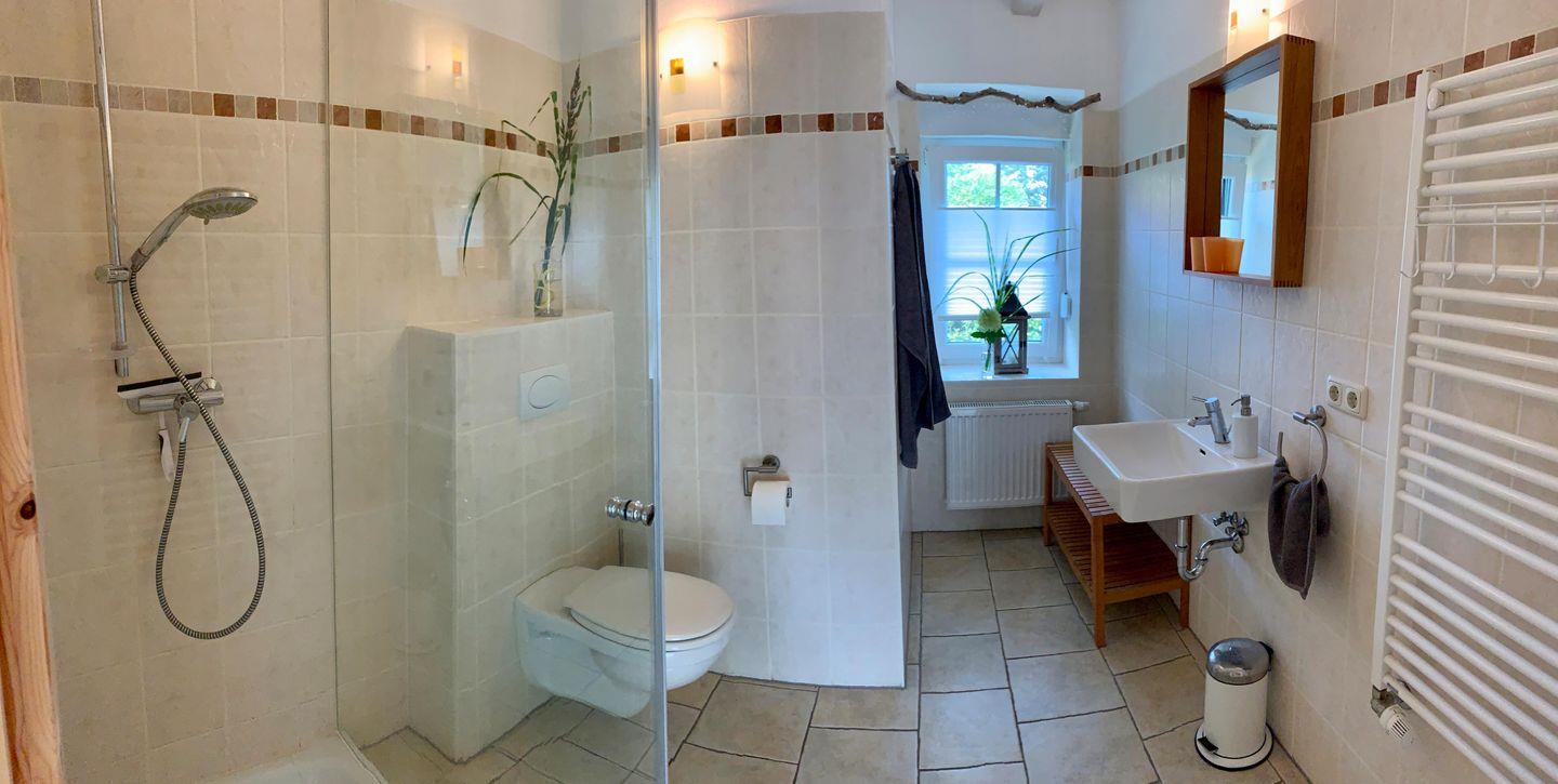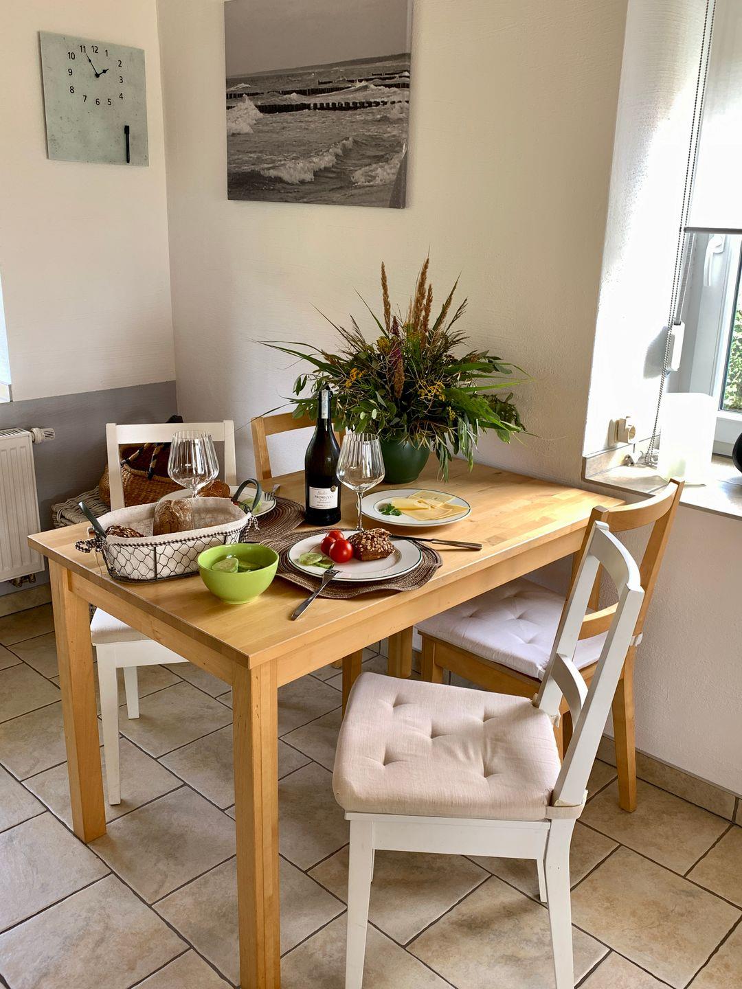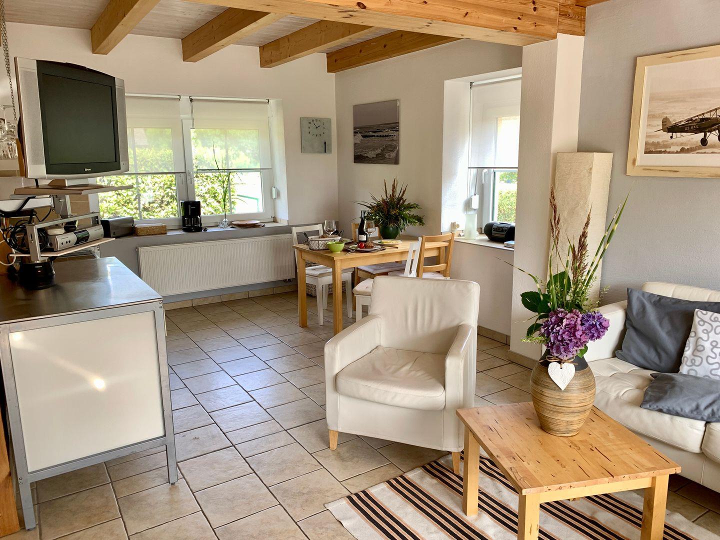 Diese Maisonettewohnung befindet sich auf einem Grundstück mit großer Rasenfläche und freiem Blick zum Bodden. Im Erdgeschoss lädt die offene Küche, sowie der liebevoll eingerichtete Wohn-/Essbereich zum Verweilen ein. Ebenfalls im Erdgeschoss befindet sich eines der zwei Badezimmer welches mit einer Dusche ausgestattet ist. Im Obergeschoss entspannen Sie sich in einem großen Schlafzimmer mit Doppelbett.