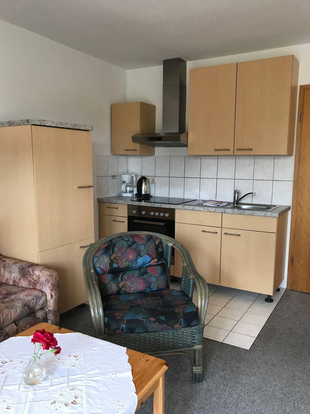Im Wohnbereich ist eine Küchenzeile und ein Eßplatz integriert .