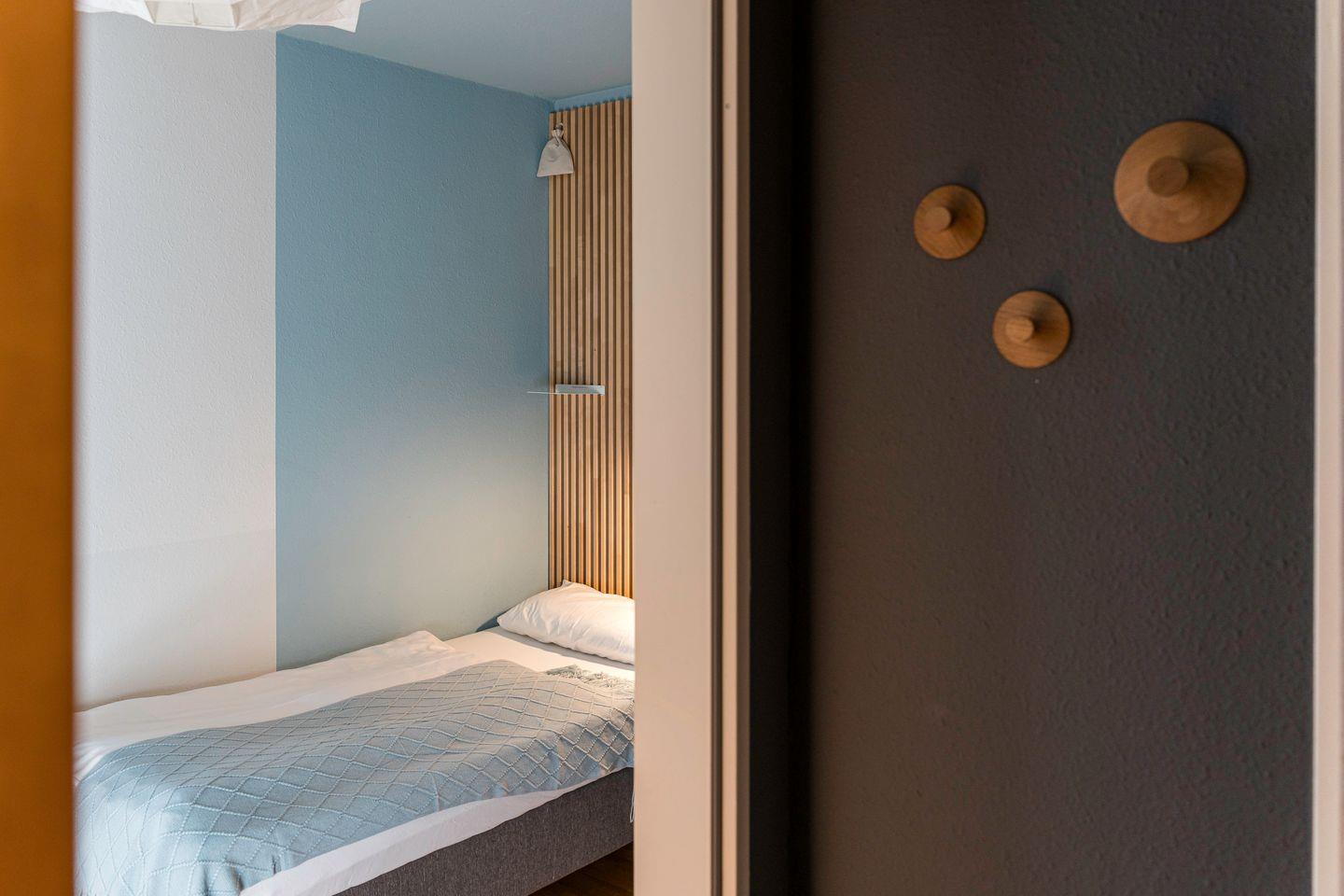 Die barrierefreie Erdgeschosswohnung eignet sich für Menschen mit eingeschränkter Mobilität und bietet Komfort in einem modernen, puristischen skandinavischen Design. Mit einem harmonischen Farbkonzept und einer durchdachten Raumgestaltung lädt die Wohnung zu einem erholsamen Aufenthalt ein. Sie verfügt über ein Schlafzimmer mit zwei getrennten Betten, ein Wohnzimmer mit einem Schlafsofa, eine offene Küchenzeile und ein modernes, rollstuhlgeeignetes Bad. Die angrenzende Terrasse bietet am Morgen sonnige Stunden und lädt zum entspannten Start in den Tag ein.