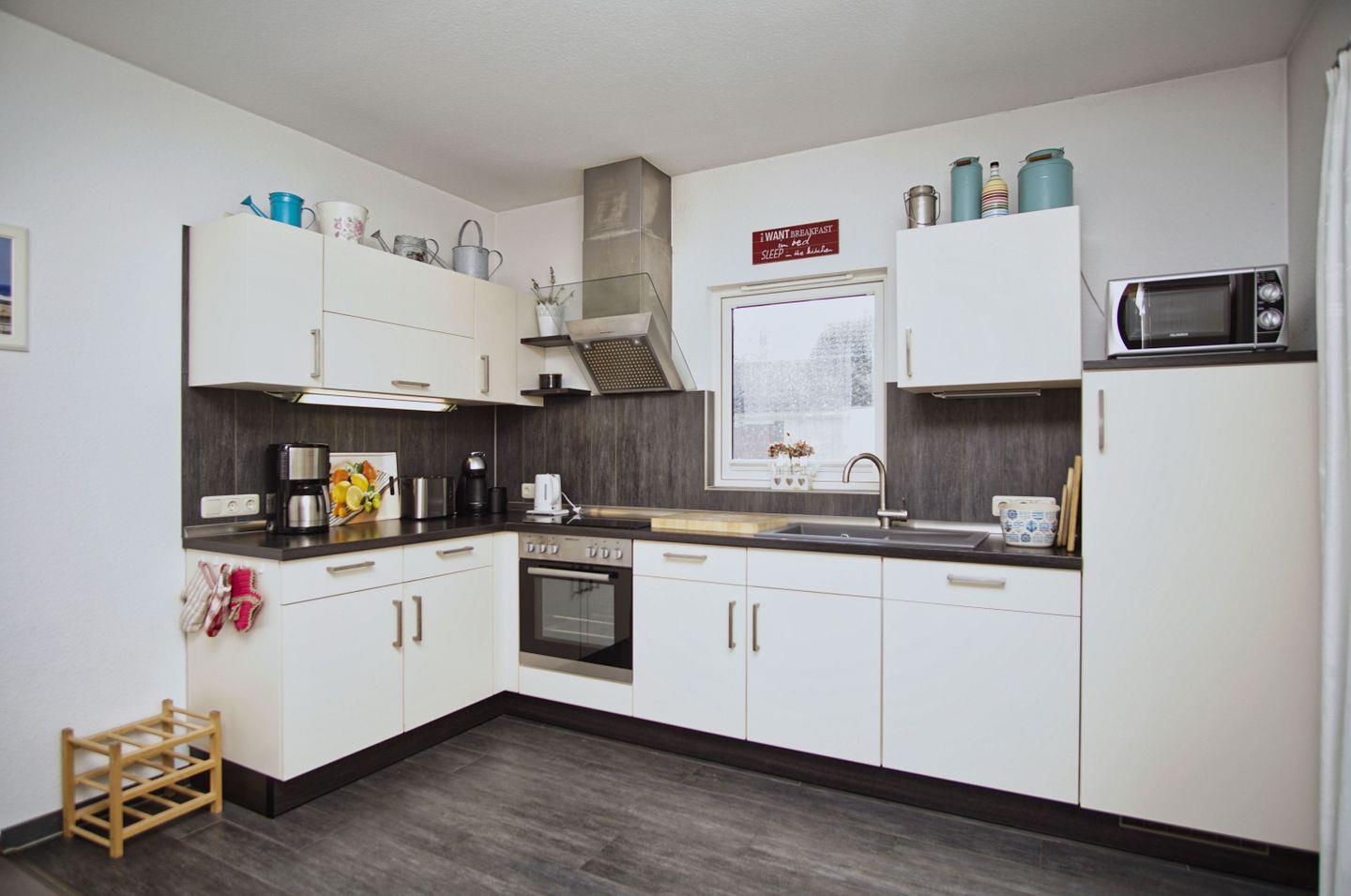 KÜCHE // offene Küche, 4-Platten Ceranfeld, Kühlschrank mit Gefrierfach, Backofen, Mikrowelle, Toaster, Wasserkocher, Kaffeemaschine, reichlich Besteck, Geschirr und Küchenutensilien ++