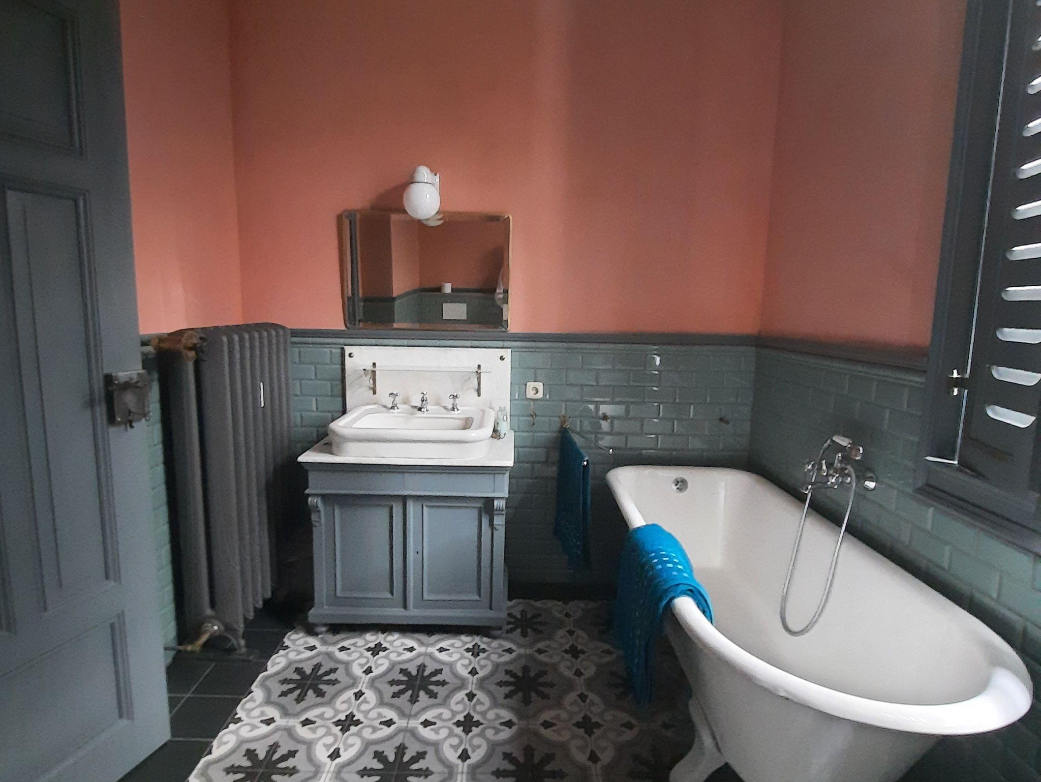 Die Fußböden sind mit historischem Parkett bzw. Dielenbelag versehen. Das Bad ist im gründerzeitlichen Stil mit Fliesenboden, freistehender Badewanne und Waschmaschine.