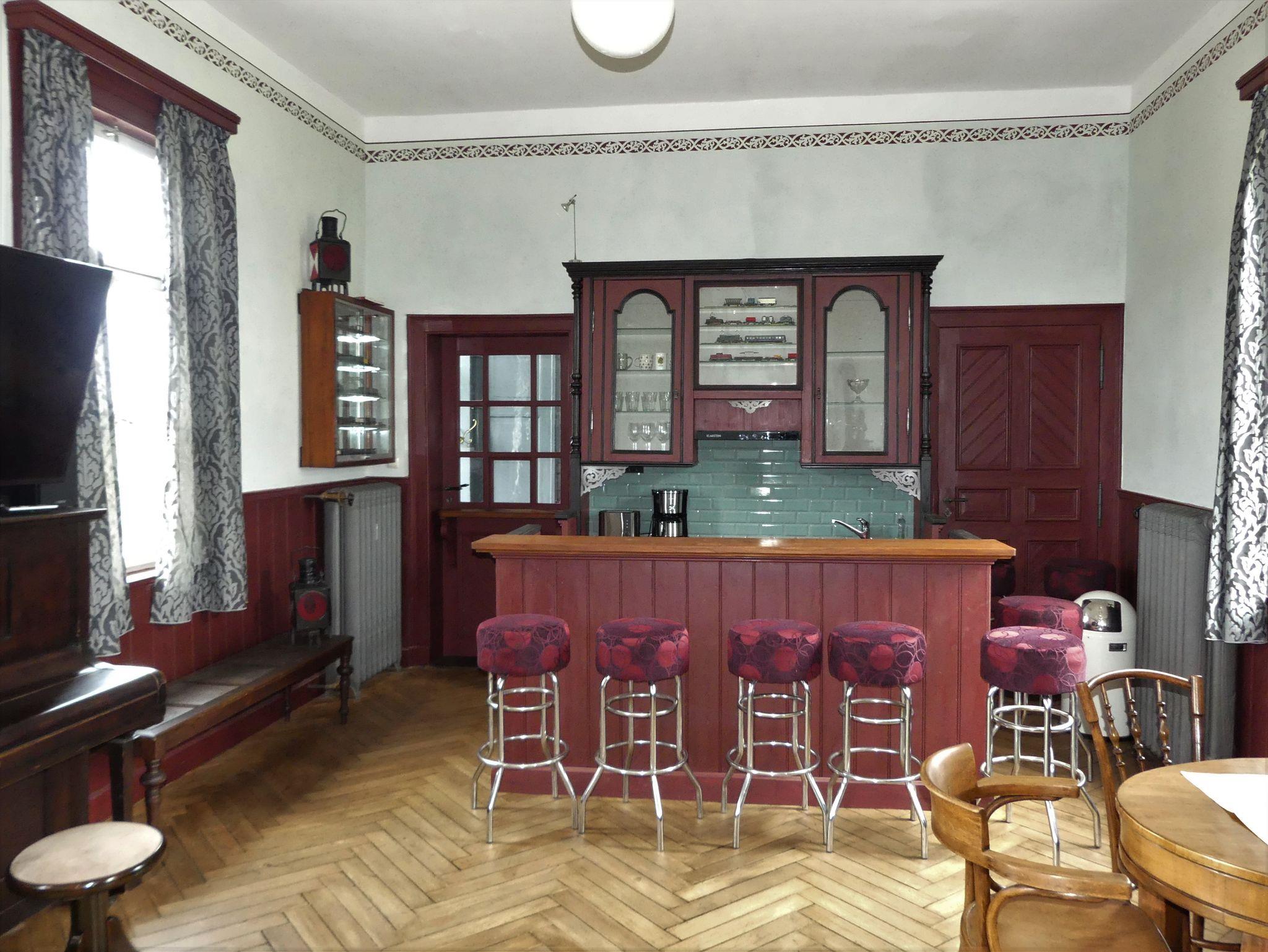 Erdgeschossige, größtenteils historisch eingerichtete, 60 Quadratmeter große Ferienwohnung im ehemaligen Bahnhof Wiesenfeld, einem ehemaligen Stationsgebäude der Werra-Eisenbahngesellschaft von 1892 an der Strecke von Coburg nach Bad Rodach.