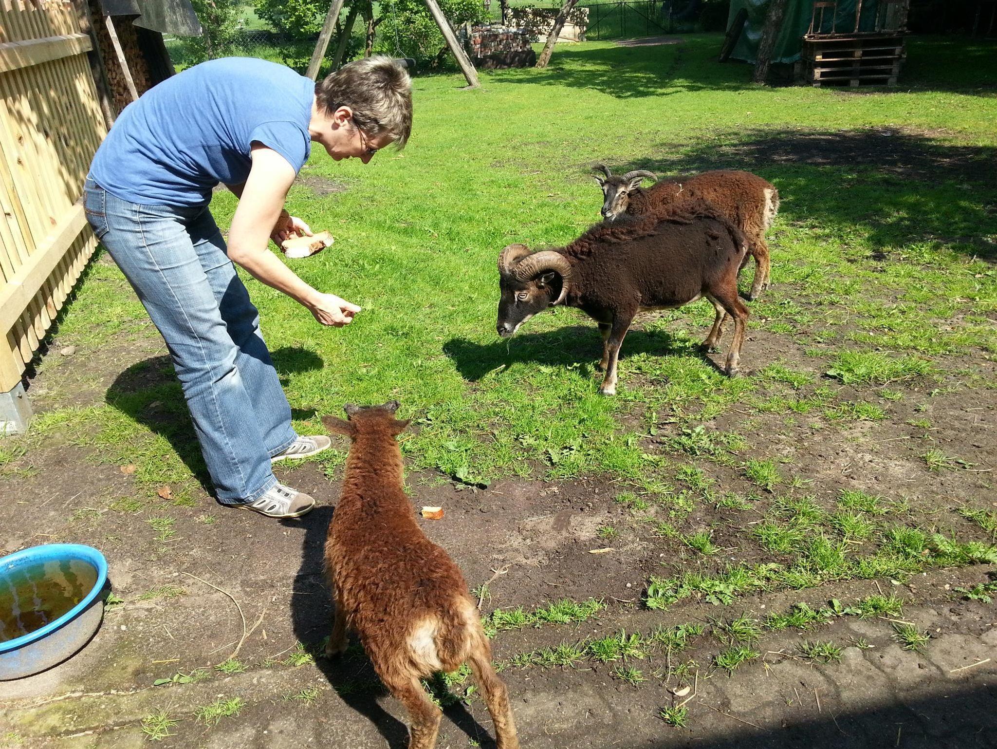 Wir haben viele Tiere: Pferde, Schafe, Hühner und Enten, Katzen und Meerschweinchen.
