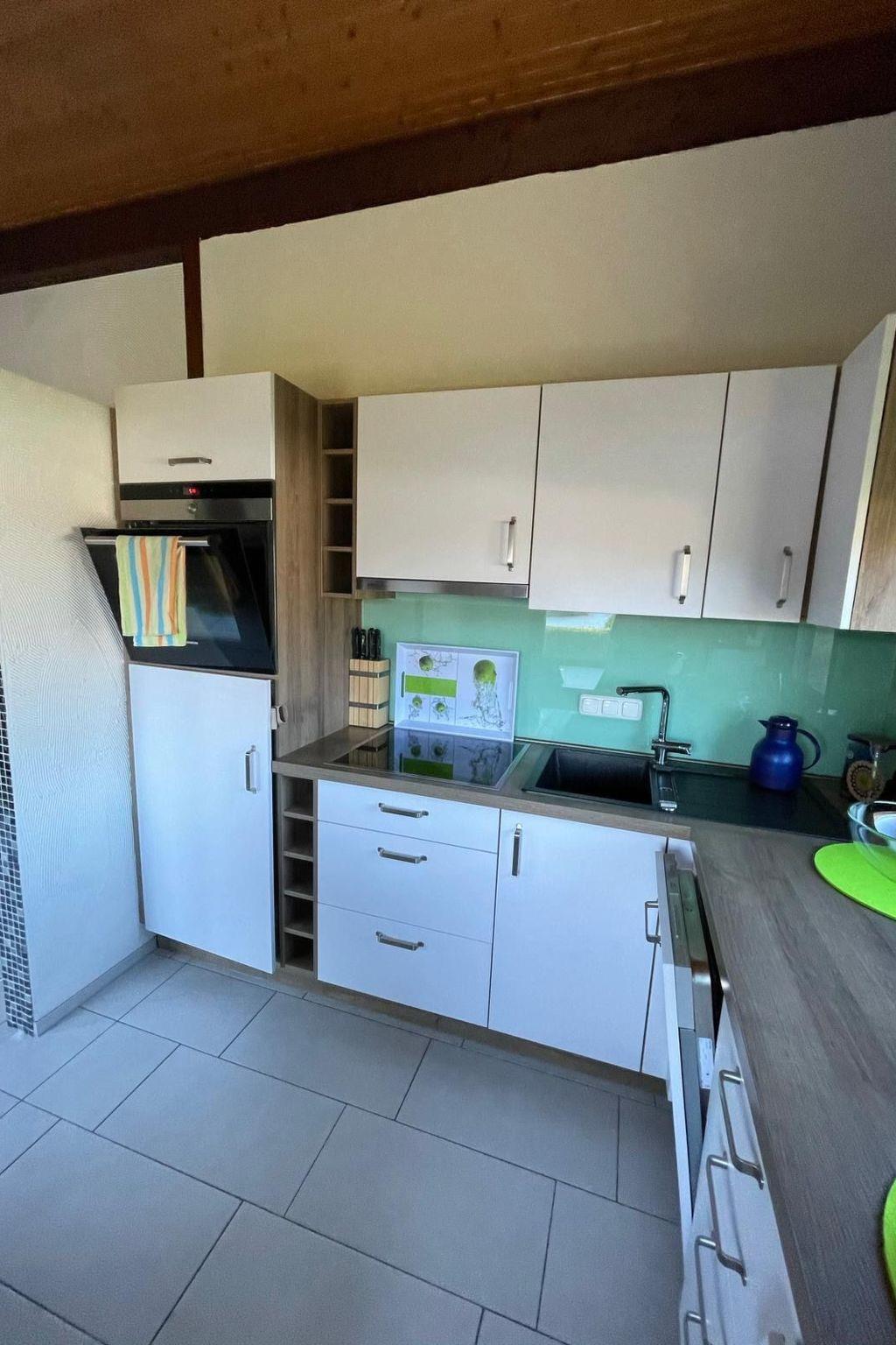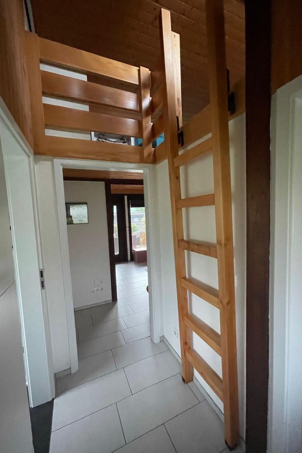 The fully equipped semi-detached house leaves nothing to be desired: The kitchen with integrated dining table has all technical appliances (oven, fridge, microwave, dishwasher, coffee machine, toaster, kettle) as well as a washing machine. In addition to the bedroom with king-size bed (1.60 x 2.00 m), there is another sleeping option on the sofa bed in the gallery, which can be reached via an integrated ladder. The gallery, which does not reach standing height, is nevertheless a fully usable space with a desk and chair by the window and shelves, and the living room, from which the whole house can be heated with a pellet stove, has two cosy sofas, one of which can be used as a sofa bed. The existing TV is equipped with a large flat screen and the bathroom with a large shower was renovated in 2016, as was the entire house.