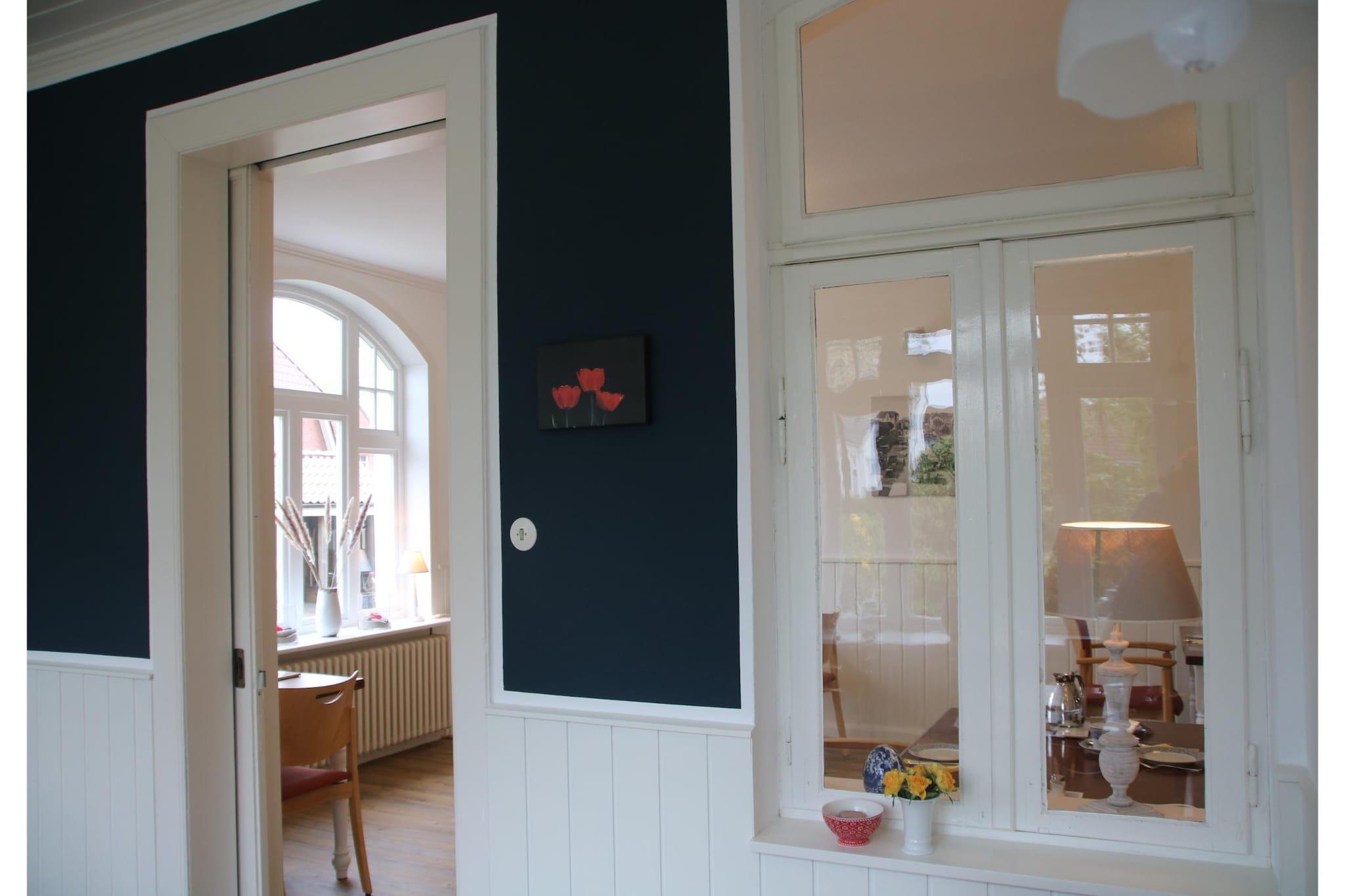 Dette rummelige feriehus i Wyk på Föhr tilbyder cirka 300 m² boligareal til op til 18 personer, hvilket gør det perfekt til store familier eller vennegrupper. Huset kan prale af moderne bekvemmeligheder, masser af komfort og en ideel beliggenhed på den populære Nordsøø. I stueetagen finder du en lys stue/spisestue med tv, et komfortabelt siddeområde og et stort spisebord. Det fuldt udstyrede køkken har komfur, ovn, mikrobølgeovn, kaffemaskine, elkedel, brødrister og to køleskabe/frysere – ideelt til at servere mange gæster. På de øverste etager finder du i alt 11 soveværelser, alle med private badeværelser (bruser, toilet, håndvask, hårtørrer) og tv. Uanset om det er enkelt- eller dobbeltværelser, vil alle finde deres eget private tilflugtssted her. Faciliteterne inkluderer også vaskemaskine, tørretumbler, rigelig parkering og en have, der er perfekt til afslapning. Beliggenheden i Wyk er ideel: butikker, restauranter, stranden og havnen er alle inden for rækkevidde. Nyd uforglemmelige dage på Föhr i et feriehus, der på perfekt vis kombinerer plads, komfort og privatliv.