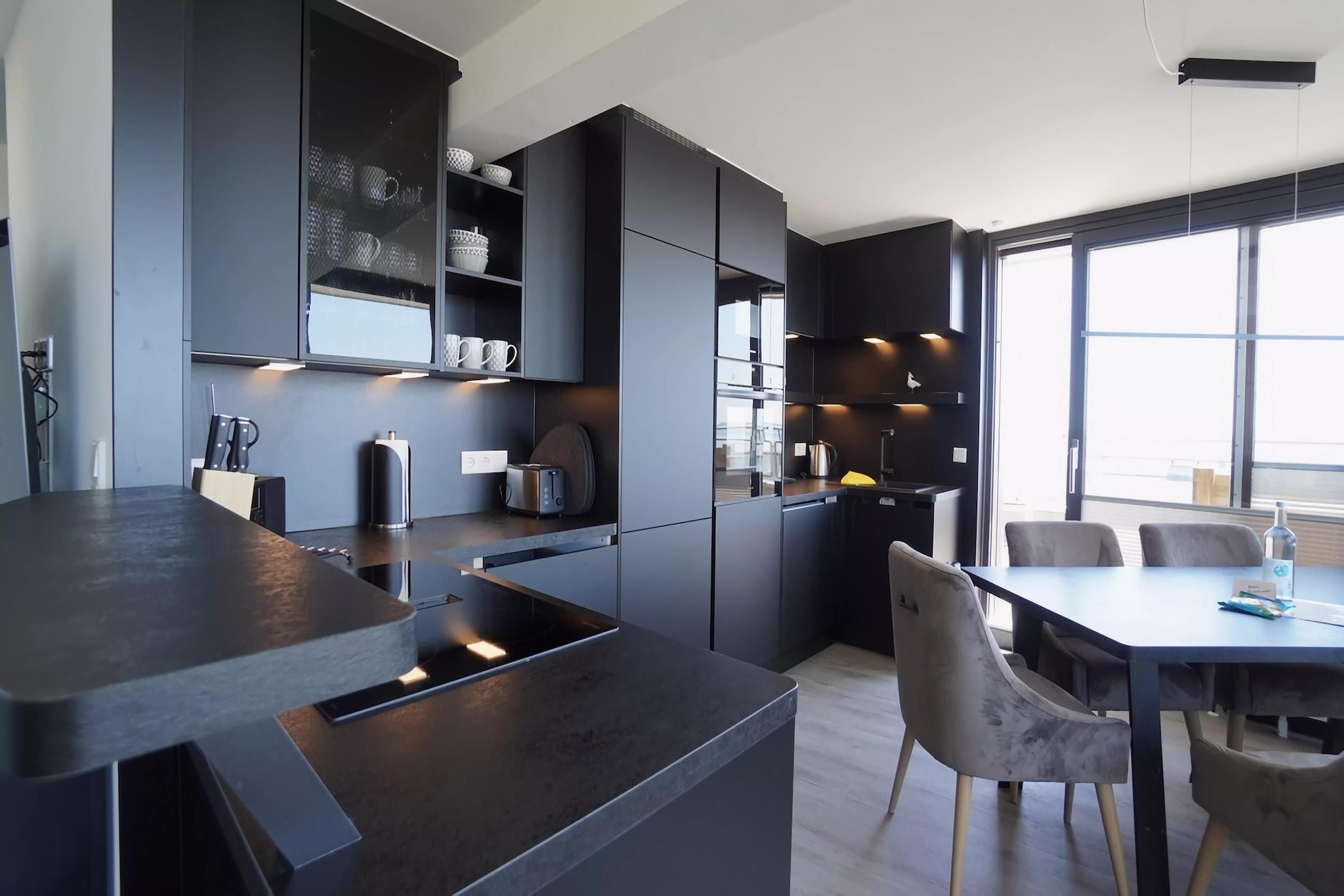 På 4. etage: (åbent køkken(kogeplade(Komfur med fire kogeplader, induktion), elkedel, brødrister, emhætte, kaffemaskine, ovn, mikrobølgeovn, opvaskemaskine , køleskab(+ fryser), Blender), stue / spisestue(Fjernsyn(fladskærm, Smart-TV), spisebord, sofahjørne, radio, Netflix), soveværelse(dobbeltseng(160 x 200 cm)), soveværelse(enkeltseng(80 x 200 cm), enkeltseng(80 x 200 cm)), soveværelse(enkeltseng(90 x 200 cm)), badeværelse(radio, tørretumbler, bruser, håndvask, toilet, vaskemaskine, føntørrer)) sauna(deles med andre gæster, betalt), varme, terrasse, havemøbler, solstole, parkering, swimmingpool(deles med andre gæster), elevator, Solcreme, Vaskeripakke mod et gebyr