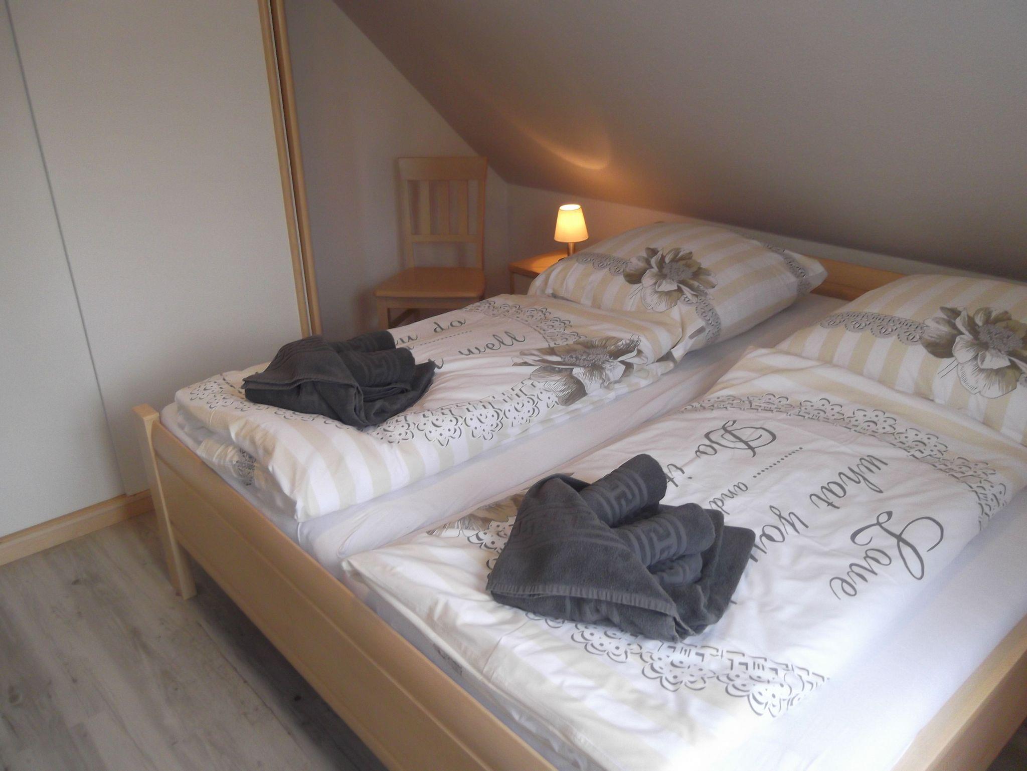 Die helle 45 m² große Obergeschoßwohnung bietet Platz für 2 bis 4 Personen und liegt in einer ruhigen Seitenstraße. Das Objekt verfügt über ein Schlafzimmer mit einem Doppelbett und einem Schlafzimmer mit 2 Einzelbetten. Die separate Küche hat einen kleinen Sitzplatz für zwei Personen, ein Wohnzimmer und ein Duschbad. Im Keller befindet sich eine Waschmaschine und ein Trockner, die Sie gerne nutzen können.
