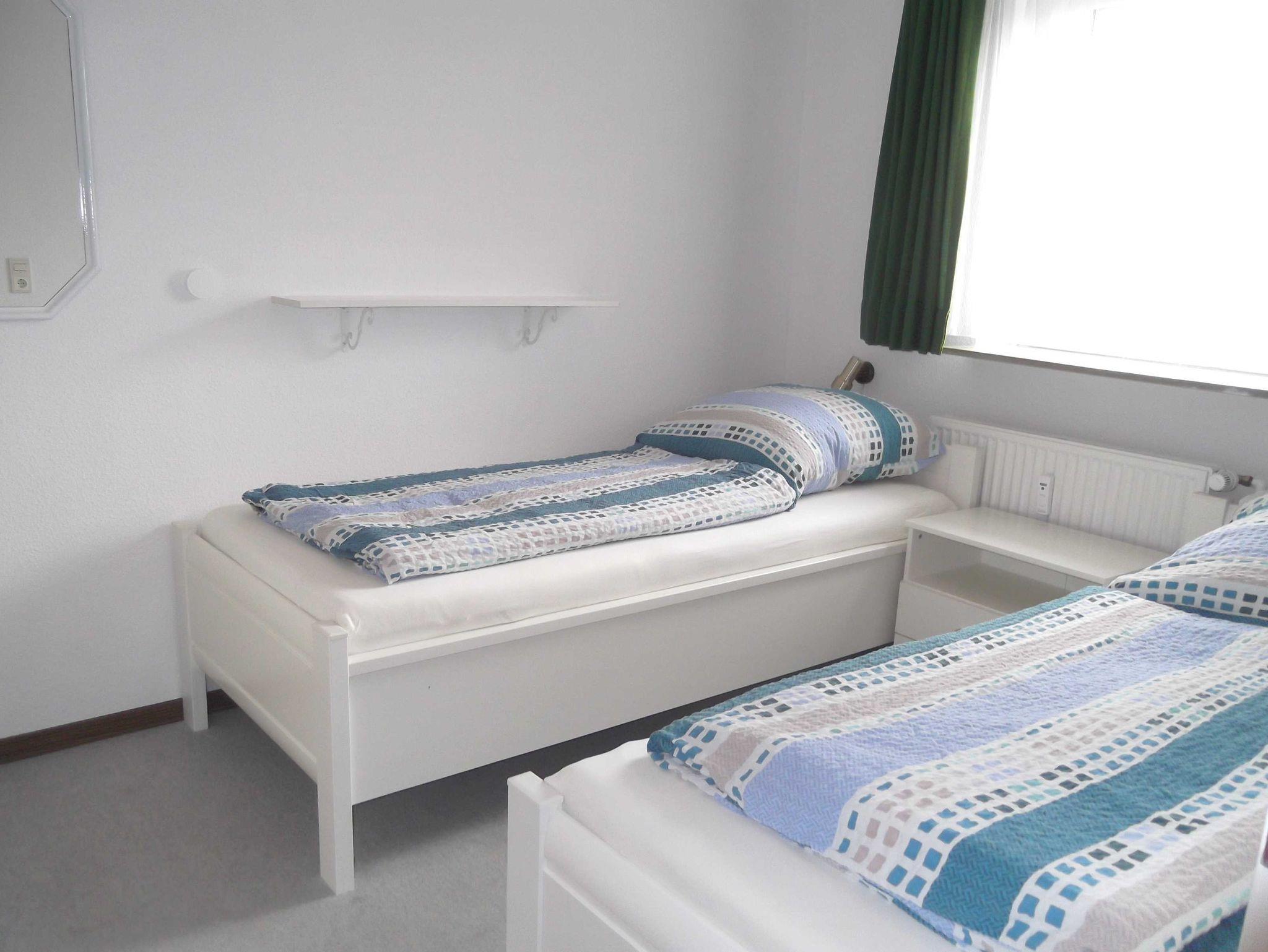 1 Schlafraum mit zwei Einzelbetten, 1 Wohnraum, 1 offene Küche, 1 Badezimmer mit Dusche.