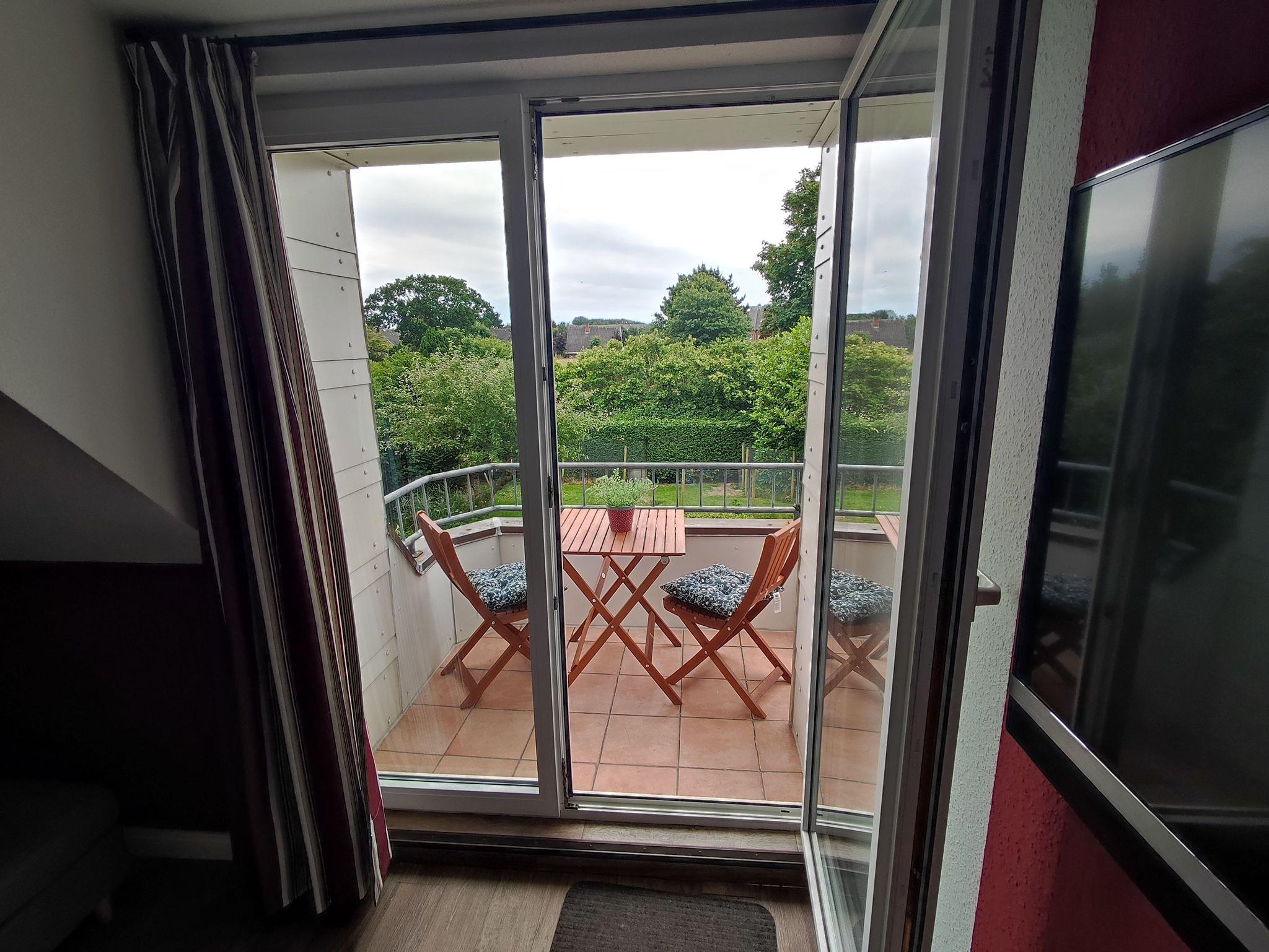 Balkon: Nach Süd-Süd-West ausgerichtet mit Tisch und zwei Stühlen.