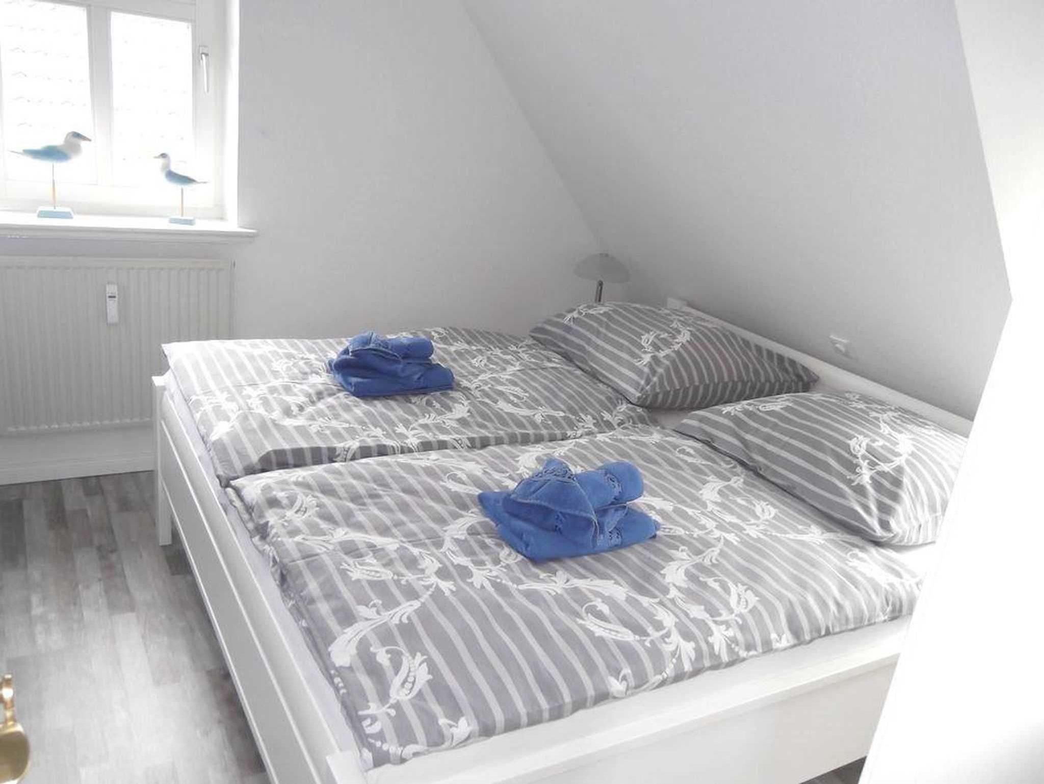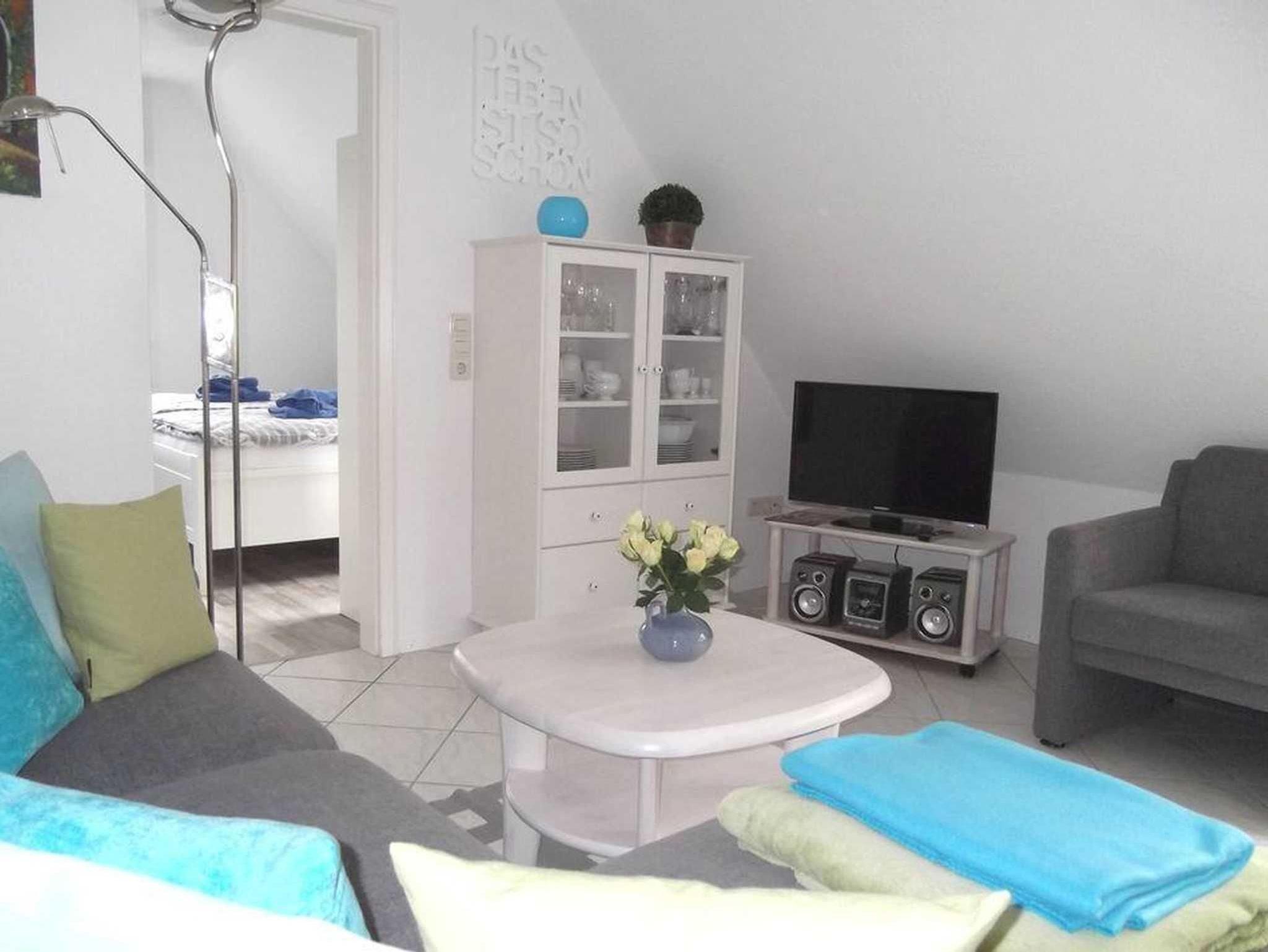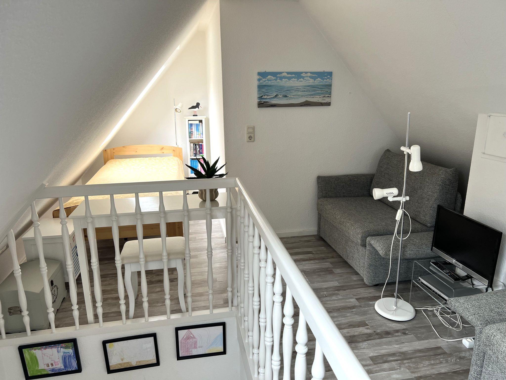 Die helle und geschmackvoll eingerichtete 45 m² große Obergeschoßwohnung befindet sich in einem Mehrfamilienhaus in der Nähe vom Südstrand und bietet Platz für bis zu drei Personen. Das Objekt verfügt über ein separates Schlafzimmer mit einem Doppelbett, einer gemütlichen Wohnküche und einem Duschbad. Die dritte Schlafgelegenheit in Form eines Schlafsessels befindet sich auf der Galerie im Dachgeschoss.