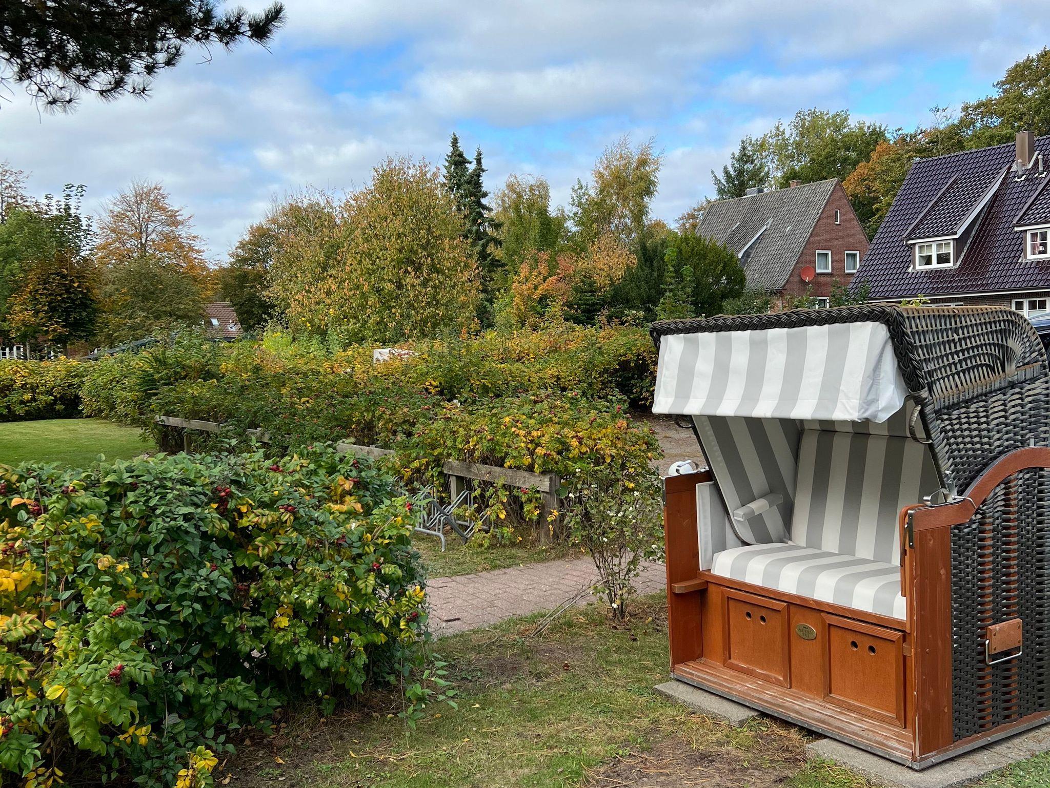 Außenbereich: Parkplatz, Strandkorb auf Terrasse und Gartenmöbeln.