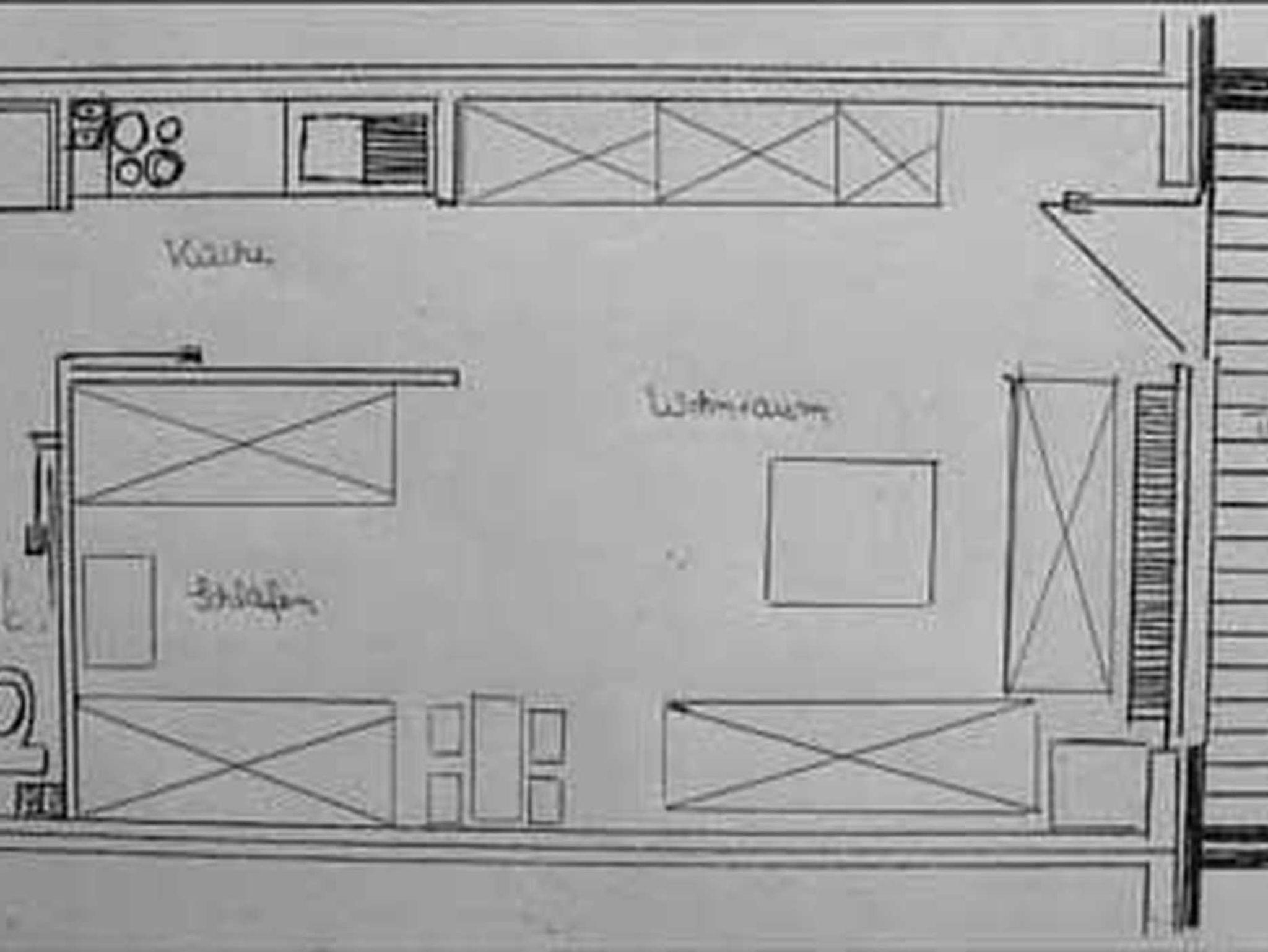 1 kombinierter Wohn-/Schlafraum, 1 integrierte Küchenzeile, 1 Badezimmer mit Dusche.