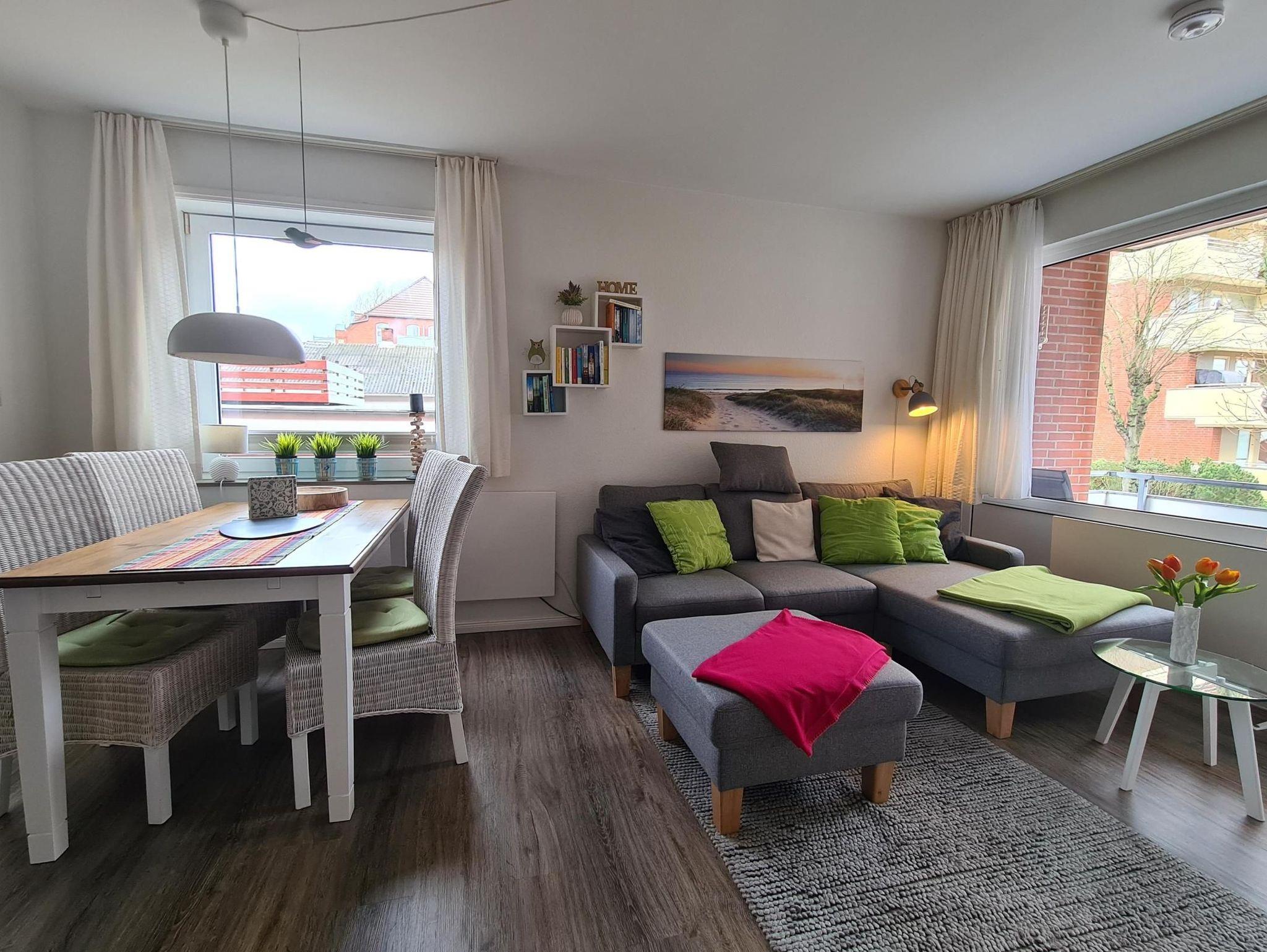 Hell und modern präsentiert sich die Wohnung Olandblick im ruhigen Teil des Sandwall direkt in Wyk.Sie befindet sich in der ersten Etage, ist ca. 43m2 groß und hat einen möblierten Balkon mit Blick auf die Nordsee und die Hallig Oland.Die Kurpromenade mit ihren Geschäften und Restaurants ist von hier aus sehr gut zu Fuß zu erreichen. Gleichzeitig liegt sie nur einen 2minütigen Spaziergang vom Strand entfernt.Die Wohnung bietet Platz für 2-3 Personen, verfügt über ein geschmackvolles, neu renoviertes Schlafzimmer mit gemütlichem Doppelbett und ein freundlich eingerichtetes Wohnzimmer mit einem Flachbild TV und einer Schlafcouch.Die offene und voll ausgestattete Küchenzeile liegt direkt gegenüber des schicken Eßbereichs.Im Badezimmer befindet sich eine Dusche und eine Waschmaschine. Außerdem stehen ein Föhn und ein Schminkspiegel zur Verfügung.Zur Wohnung gehört ein PKW-Stellplatz, der sich hinter dem Haus befindet.