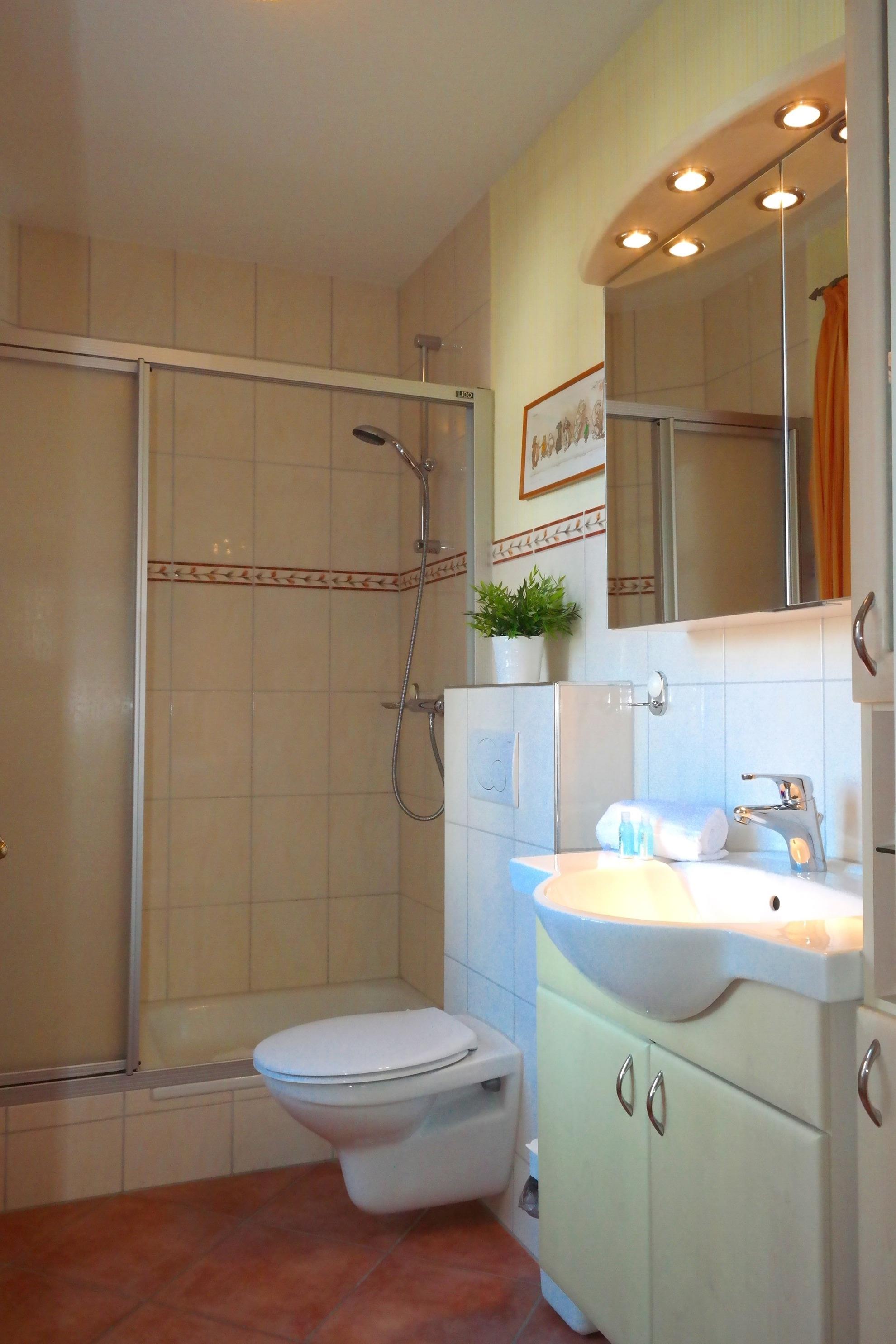 Die Wohnung 1 befindet sich in der 1. Etage und hat eine Größe von ca. 48 qm und und kann mit 2-3 Personen belegt werden. Sie hat 1 Wohn- und 1 Schlafzimmer, 1 Duschbad und eine neue, moderne Küche mit Sitzecke. Alle Räume sind hell und geschmackvoll ausgestattet. Zu der Wohnung gehört ferner ein großer Balkon.