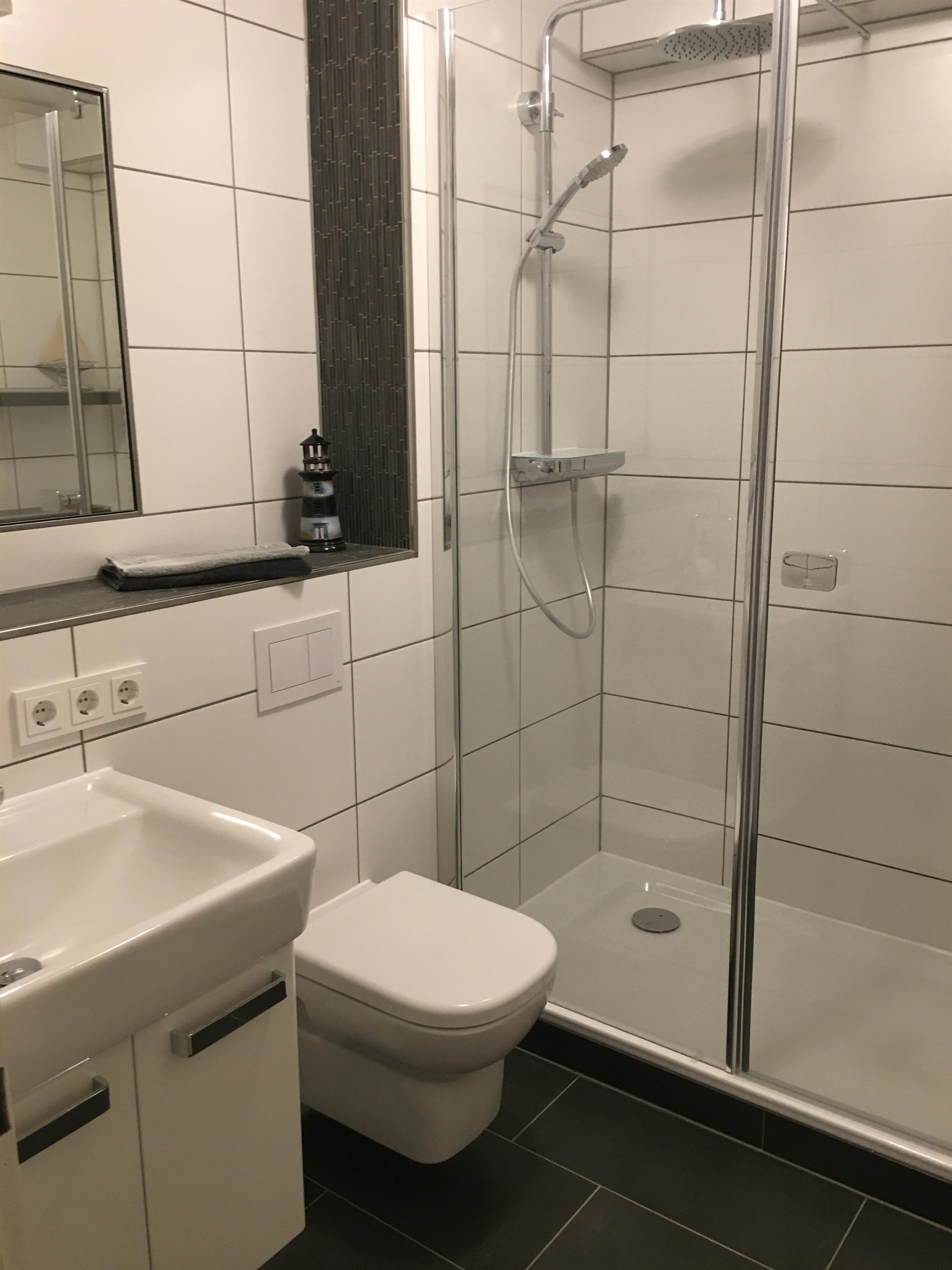 Seit dem Umbau des Bades, gibt es eine richtig angenehme Dusche. Leider hat der ältere Mensch keine Möglichkeit, sich festzuhalten. Auch der Duschhocker begrenzt die Möglichkeit, sicher aufzustehen.