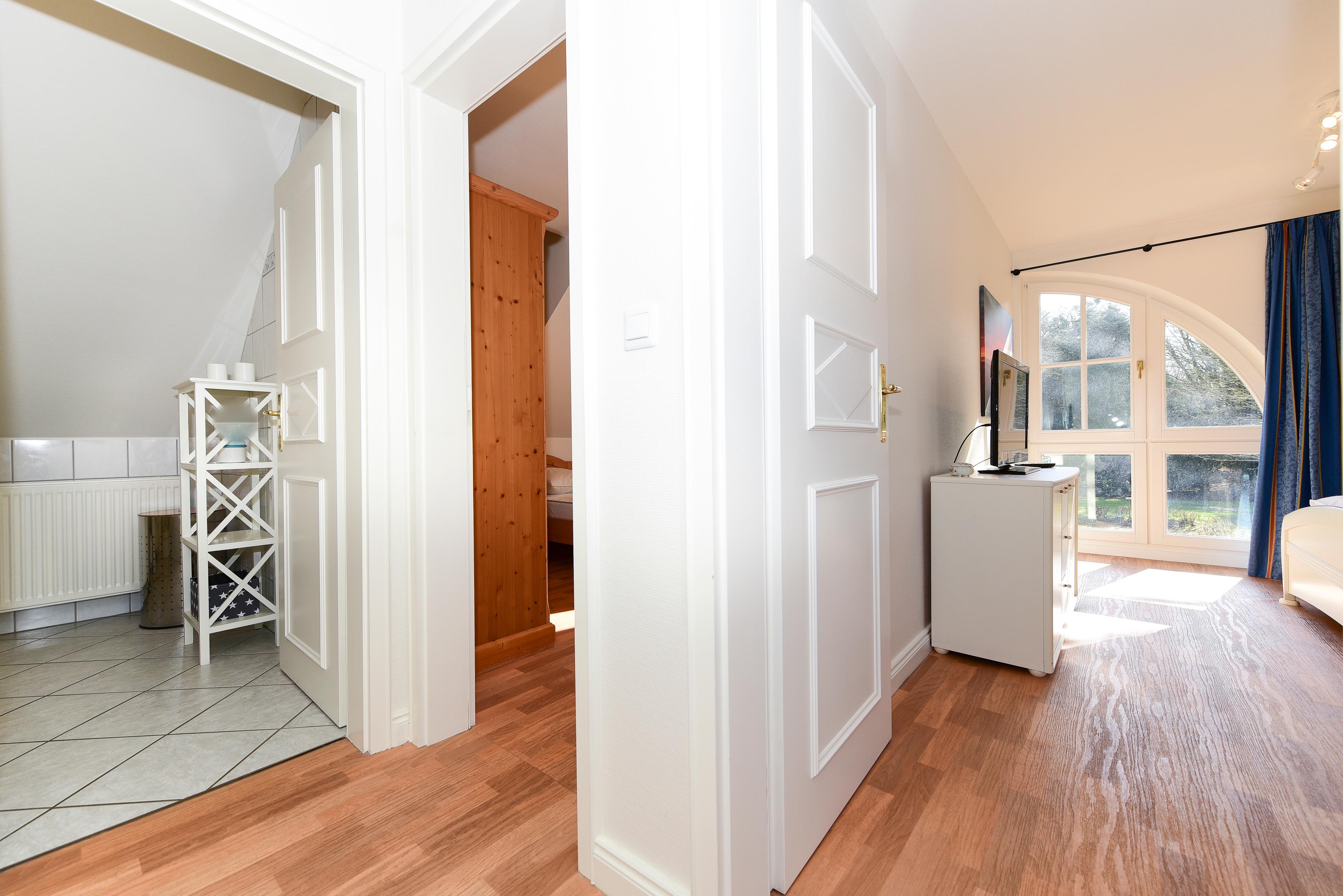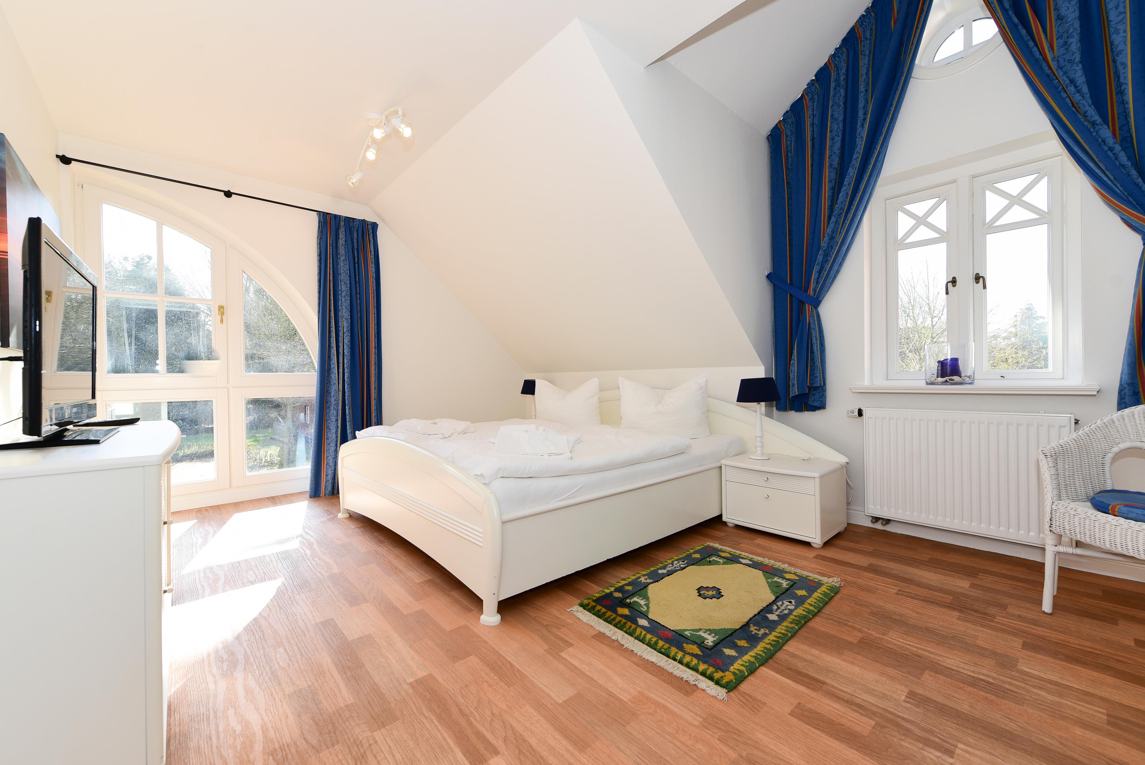 Im Obergeschoss erwarten Sie zwei gemütliche Schlafzimmer - eines mit Doppelbett und das andere mit zwei Einzelbetten. Die jeweiligen halbrunden Fenster spenden viel Tageslicht und bieten eine wohlige Atmosphäre.