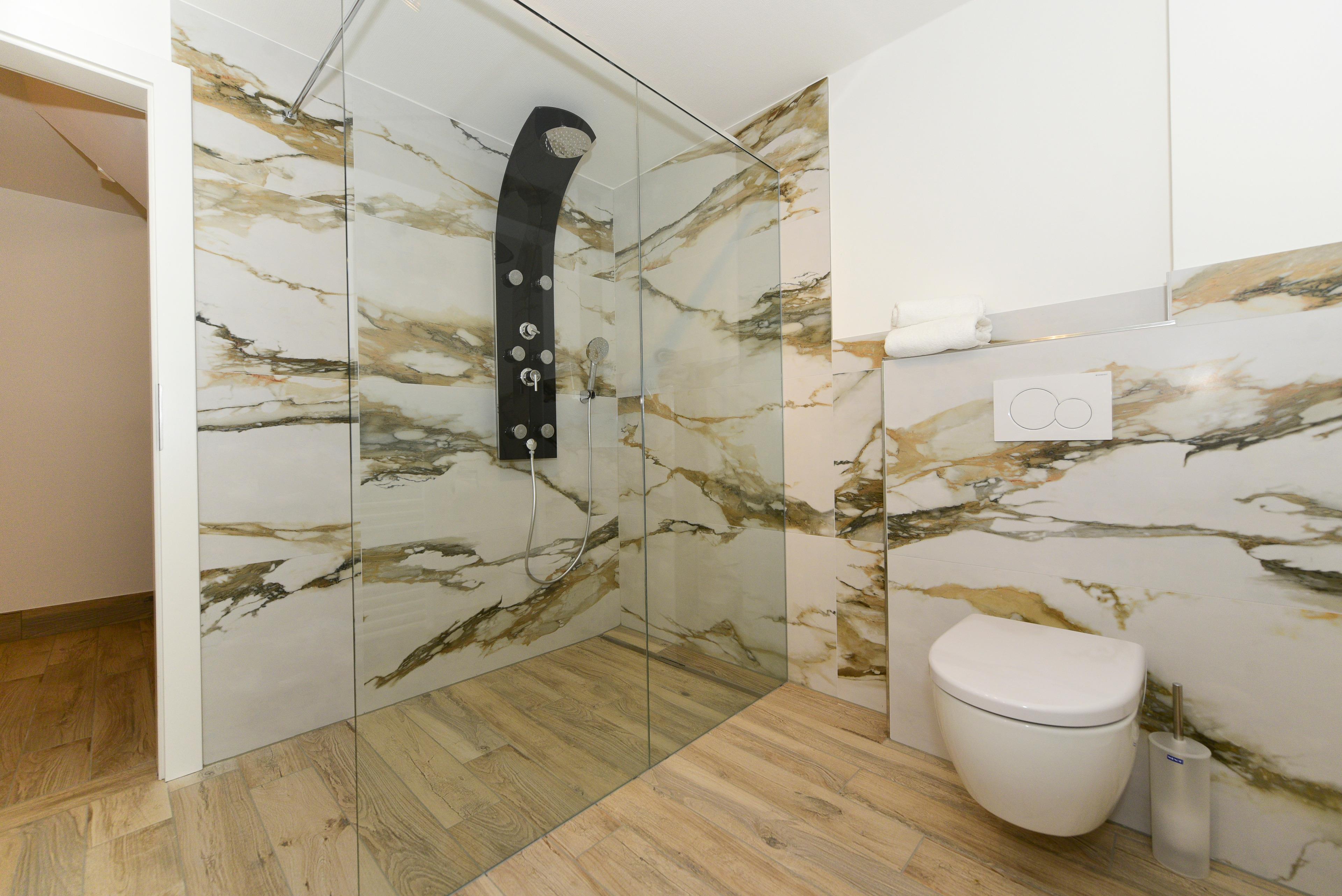Die beiden Duschbäder, eines im Obergeschoss und eines im Souterrain, sowie ein zusätzliches Gäste-WC im Erdgeschoss bieten zusätzlichen Komfort und Privatsphäre.