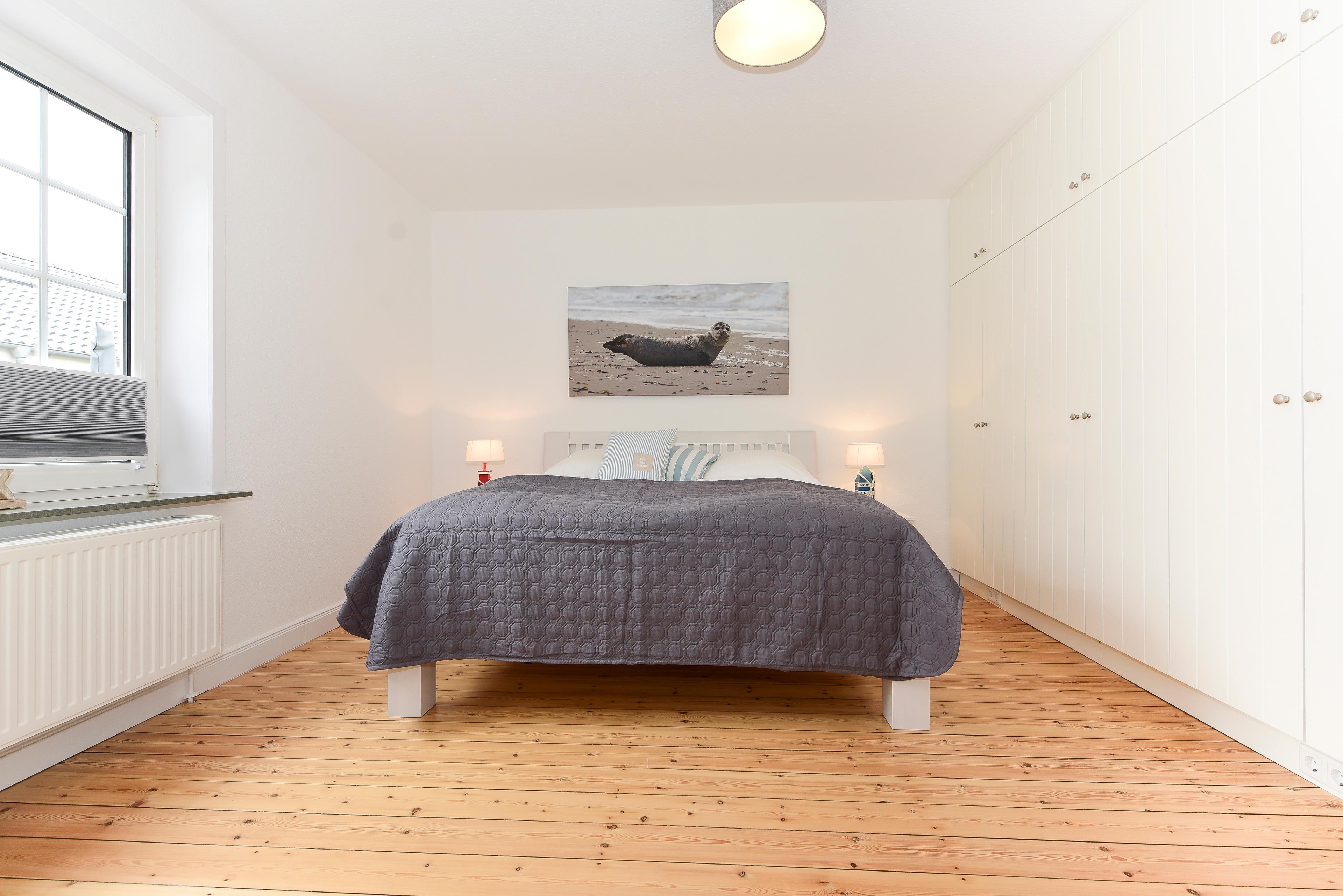 Mit einem großen Einbauschrank und einem komfortablen Doppelbett bietet das Schlafzimmer alles, was Sie für erholsame Nächte benötigen.