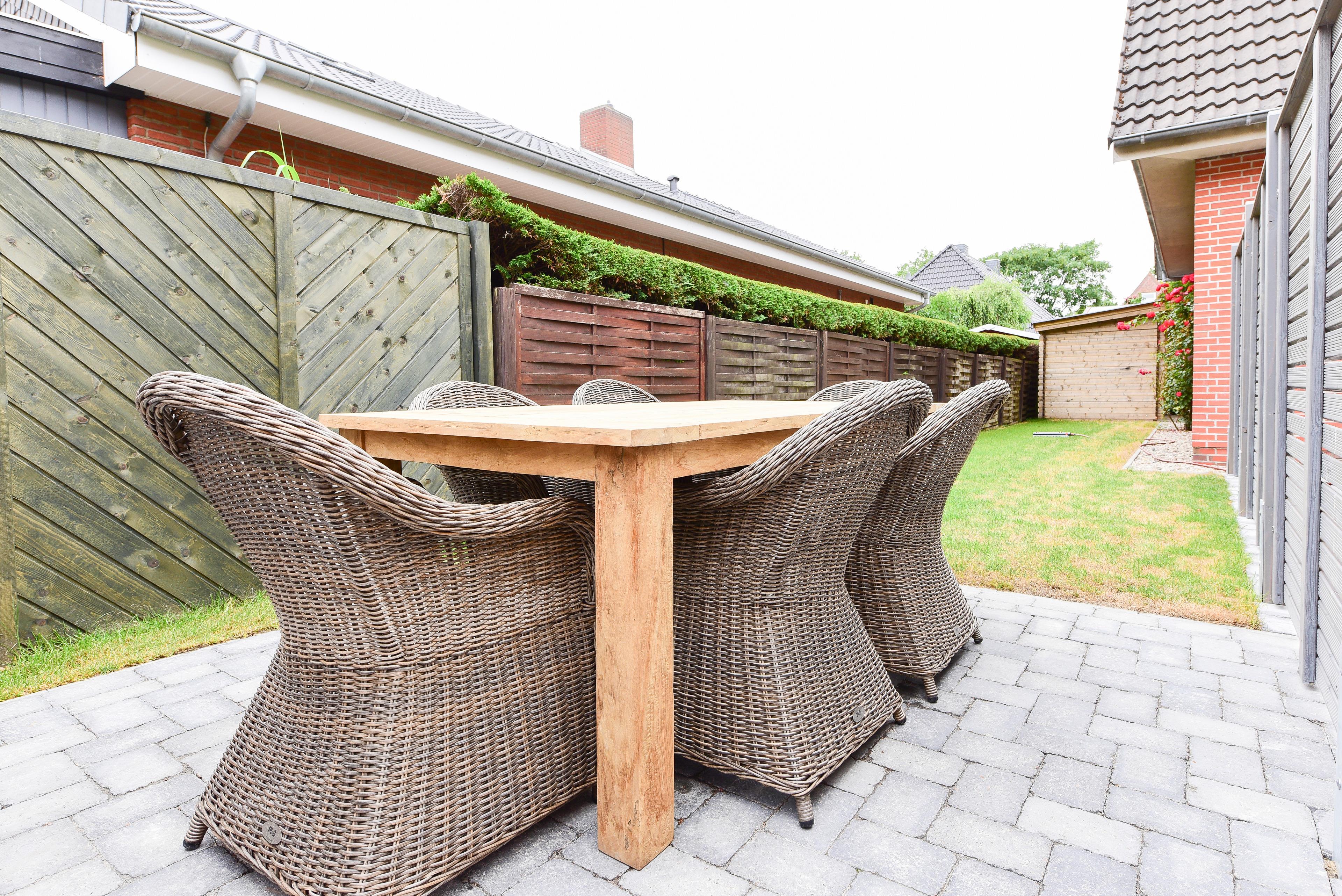 Genießen Sie sonnige Stunden auf der eigenen Terrasse, welche mit hochwertigen Gartenmöbeln und einem Strandkorb ausgestattet ist.