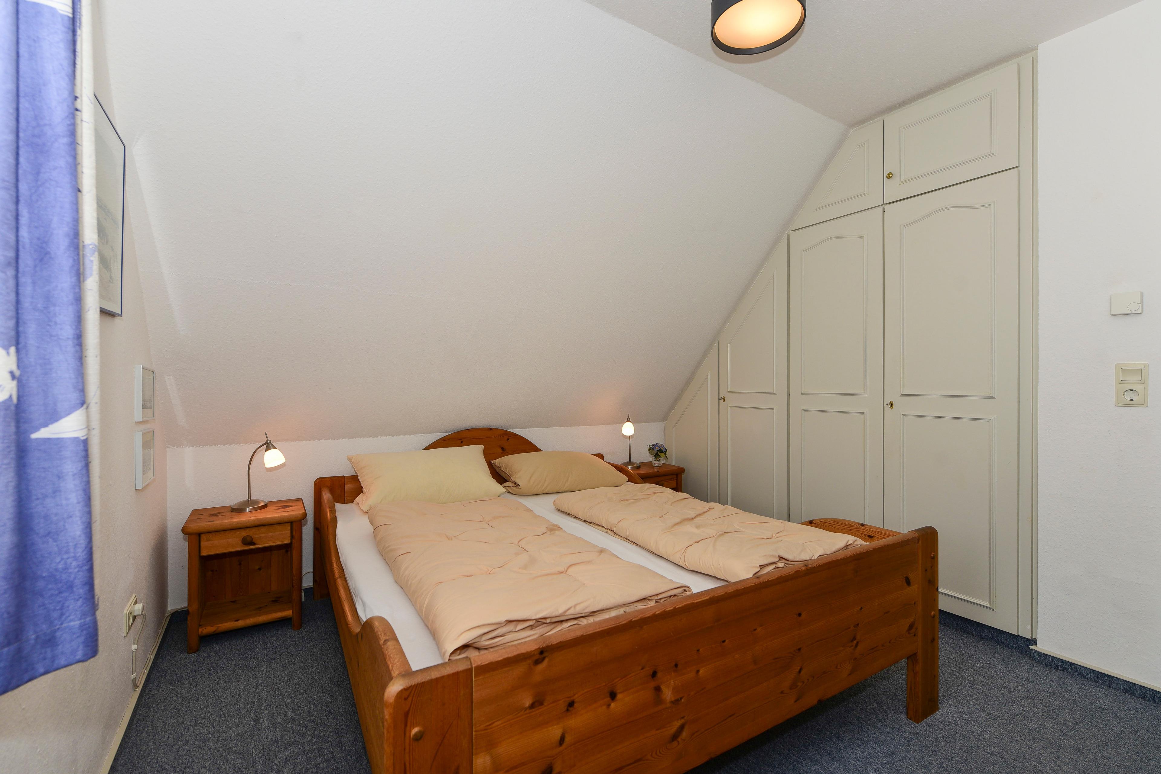Im Schlafzimmer sorgt ein komfortables Doppelbett für erholsamen Schlaf, während eine Kommode und ein Einbauschrank viel Platz für Ihre Urlaubsgarderobe bieten.