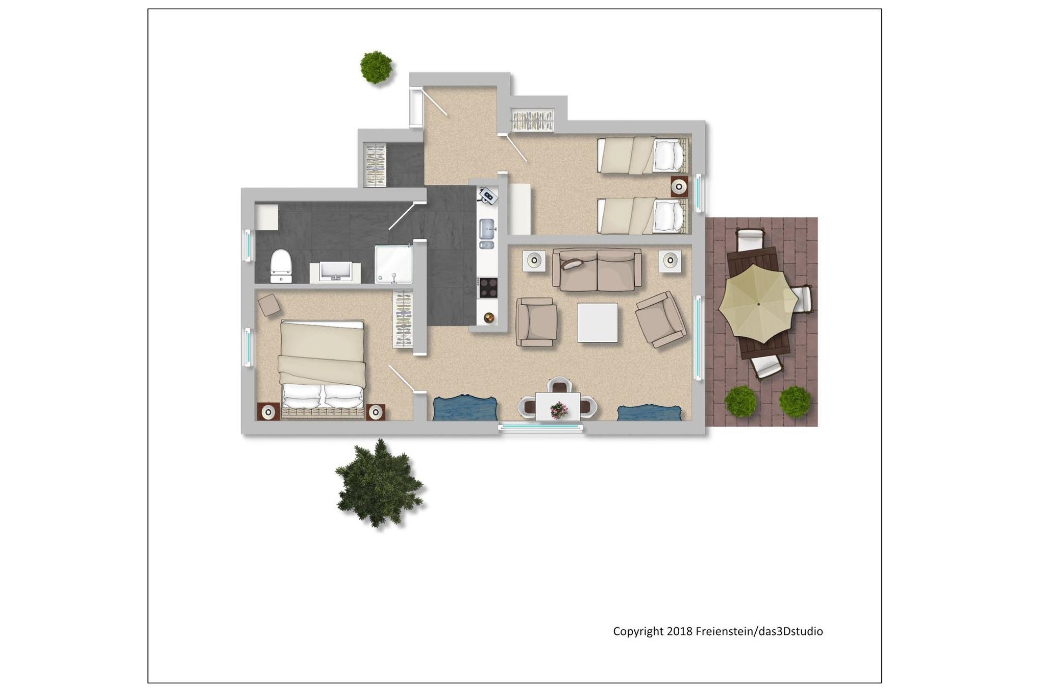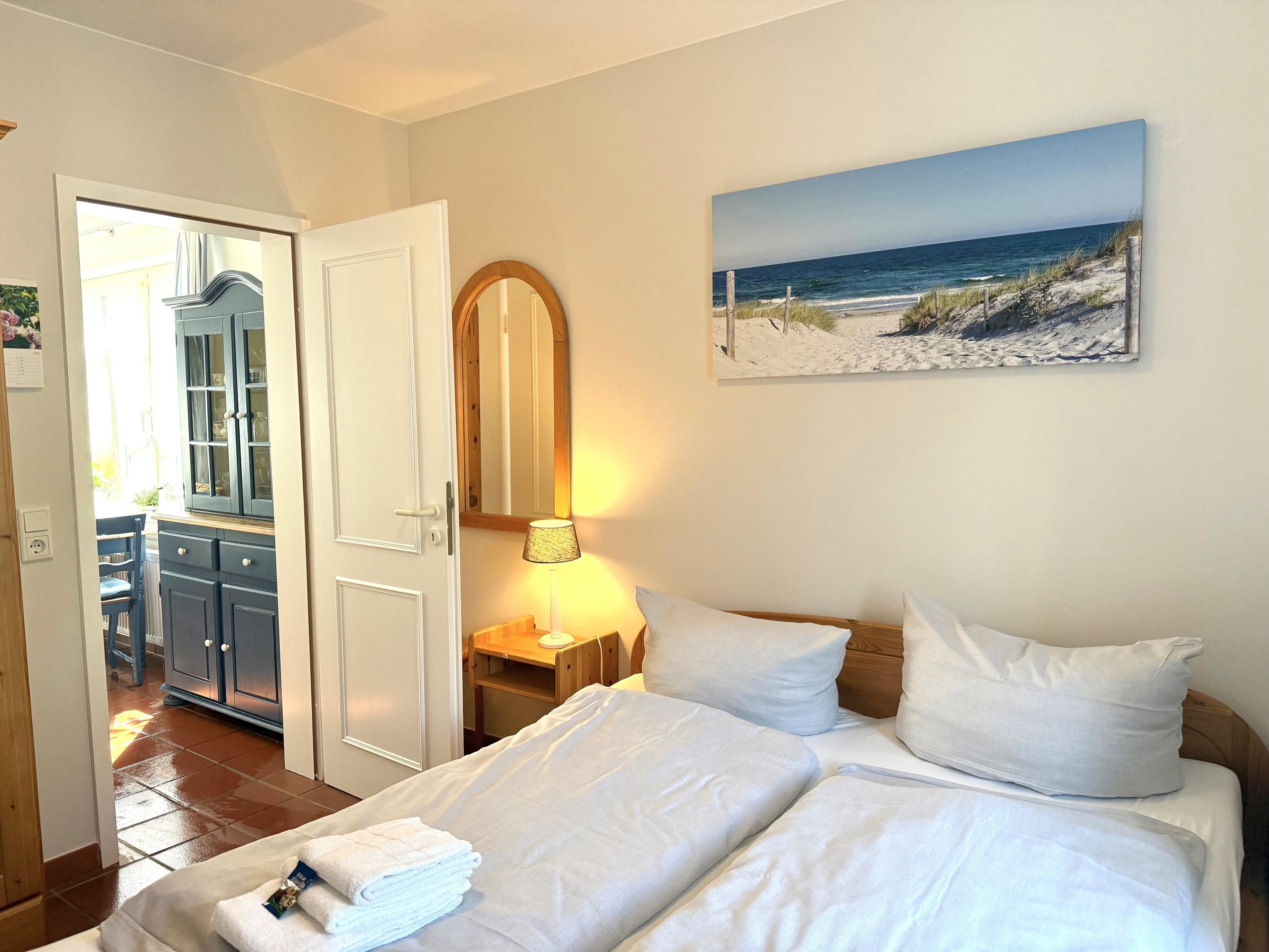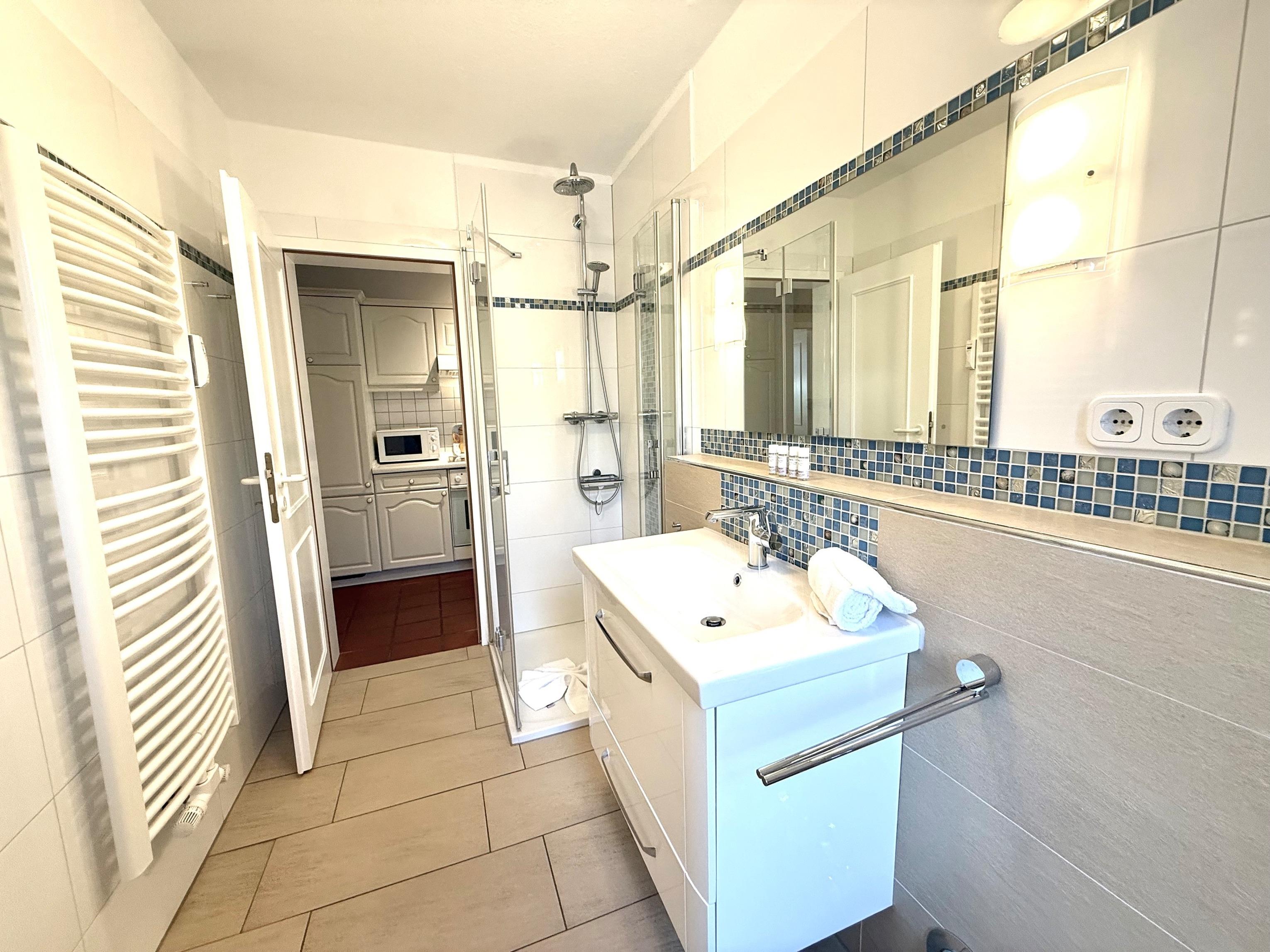 Die Ferienwohnung besitzt 2 Schlafzimmer. Für Sie stehen Einzel - und Doppelbetten bereit. Das Badezimmer ist ausgestattet mit einer Dusche. Die gut ausgestattete Küche besitzt unter anderem einen Kühlschrank, einen Herd zum Kochen und sogar eine Spülmaschine. Natürlich bieten wir Ihnen auch eine Waschmaschine und einen Trockner gegen Gebühr zur Benutzung an. Zudem gehört ein Schwimmbad, Sauna (gegen Gebühr) und ein Fitnessraum mit Crosstrainer, Ergometer und Schrägbank zur Anlage. Für unsere kleinen Gäste befinden sich auf dem Grundstück außerdem Sandkasten, Schaukel und ein Klettergerüst.