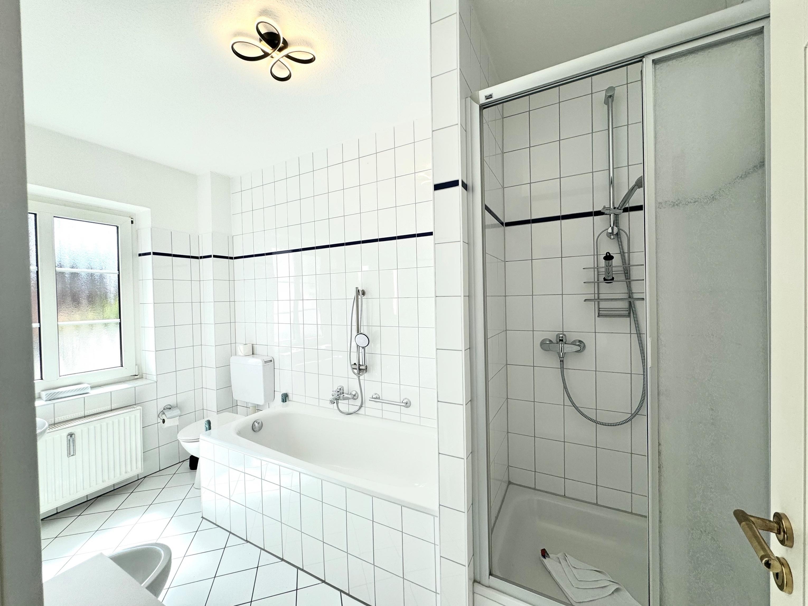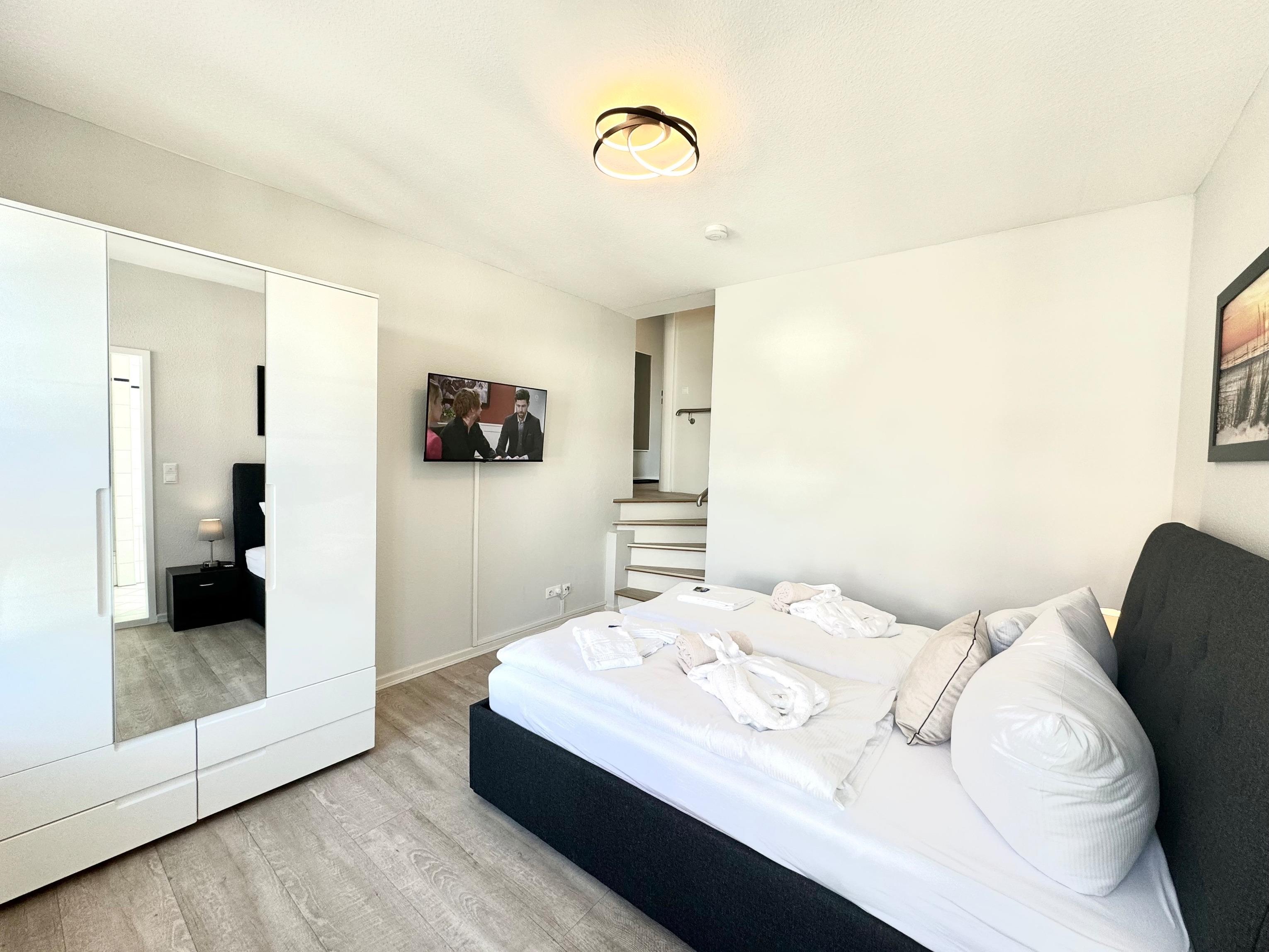 Zwei großzügige Schlafzimmer mit komfortablen Boxspring-Doppelbetten bieten Ihnen erholsame Nächte nach langen Strandspaziergängen. Eines der Schlafzimmer verfügt über ein angeschlossenes Vollbad mit Badewanne, Dusche, WC und Bidet – ein Ort zum Abschalten und Entspannen. Ein weiteres, separates Duschbad sorgt für zusätzlichen Komfort.