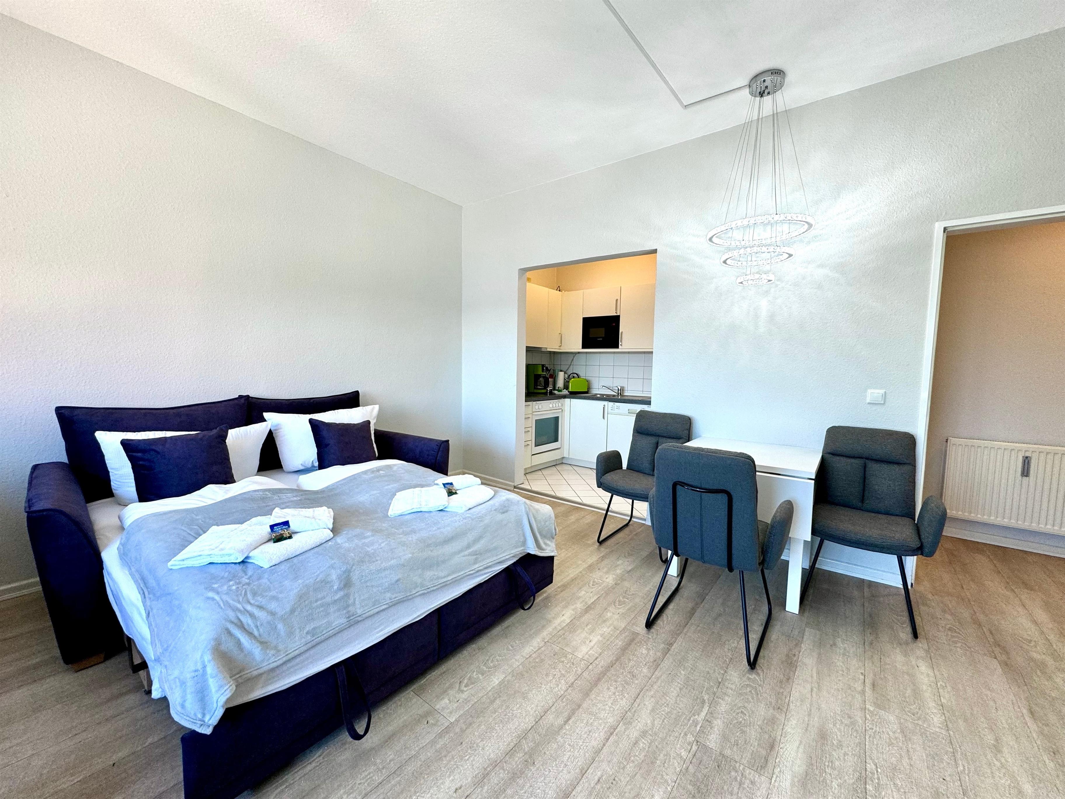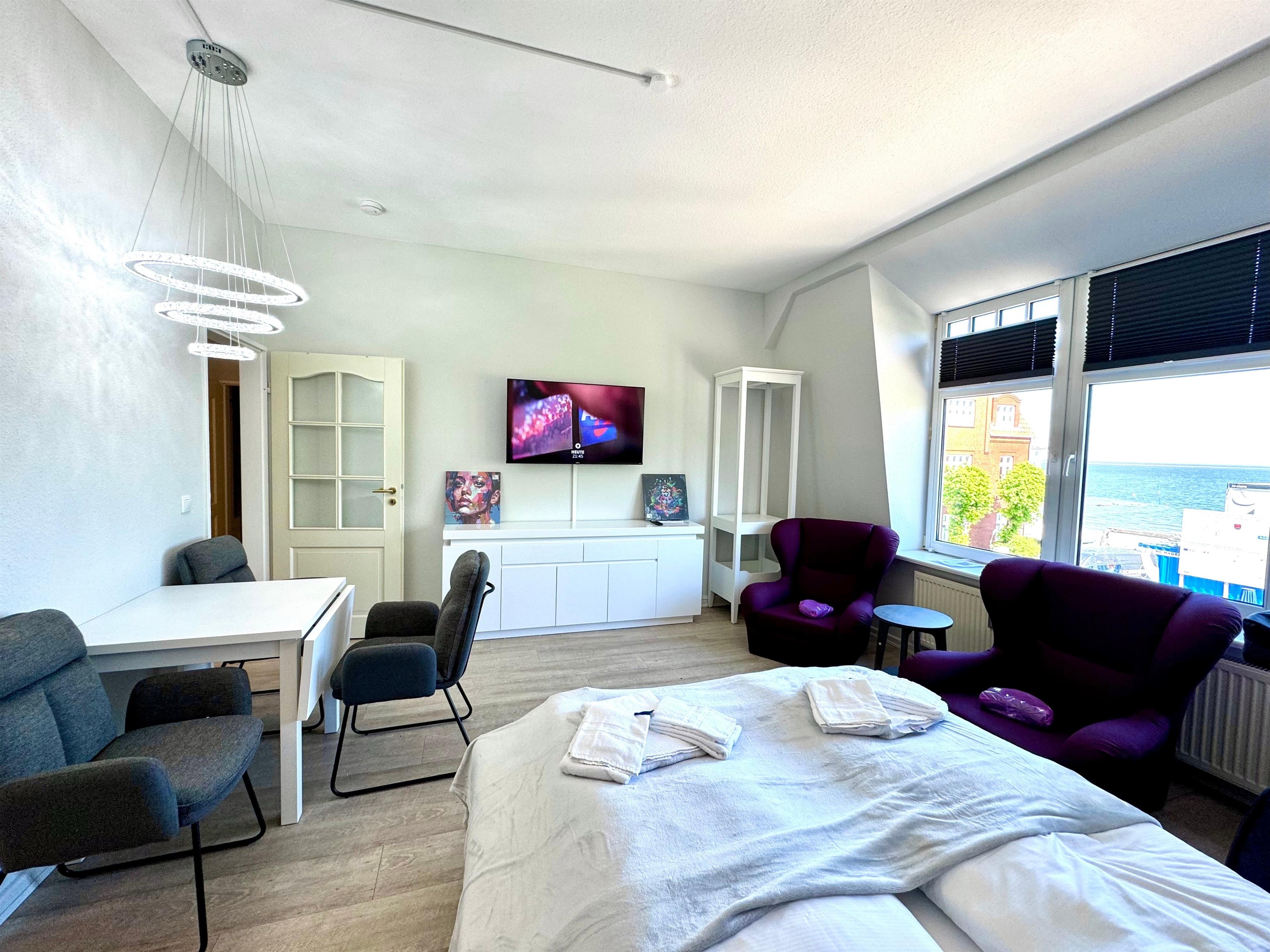 Der großzügige Wohn- und Schlafbereich empfängt Sie hell, modern und mit einer wohltuenden Ruhe. Das hochwertige Federkern-Schlafsofa verspricht erholsame Nächte, während zwei gemütliche Loungesessel der perfekte Platz sind, um den neuen Tag bei einem Kaffee zu begrüßen. Beobachten Sie, wie das Leben langsam erwacht, und genießen Sie die besondere Stimmung der frühen Stunden. Ein kleiner Essbereich sowie Sat-TV runden den Wohnbereich harmonisch ab.