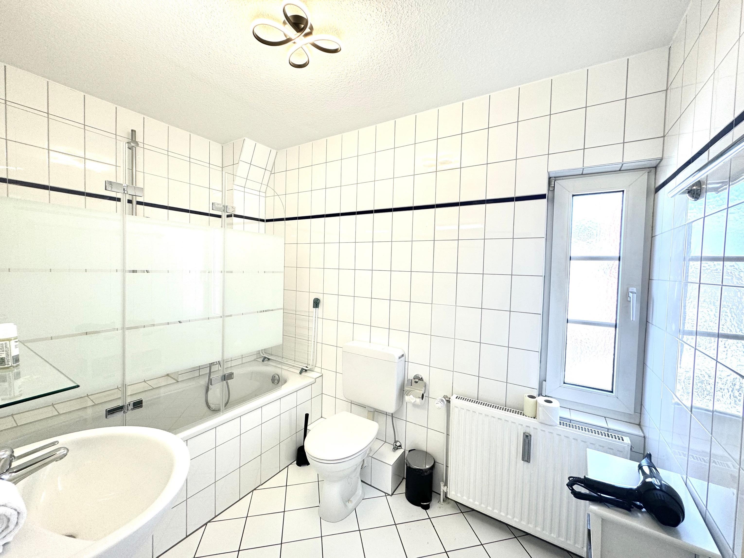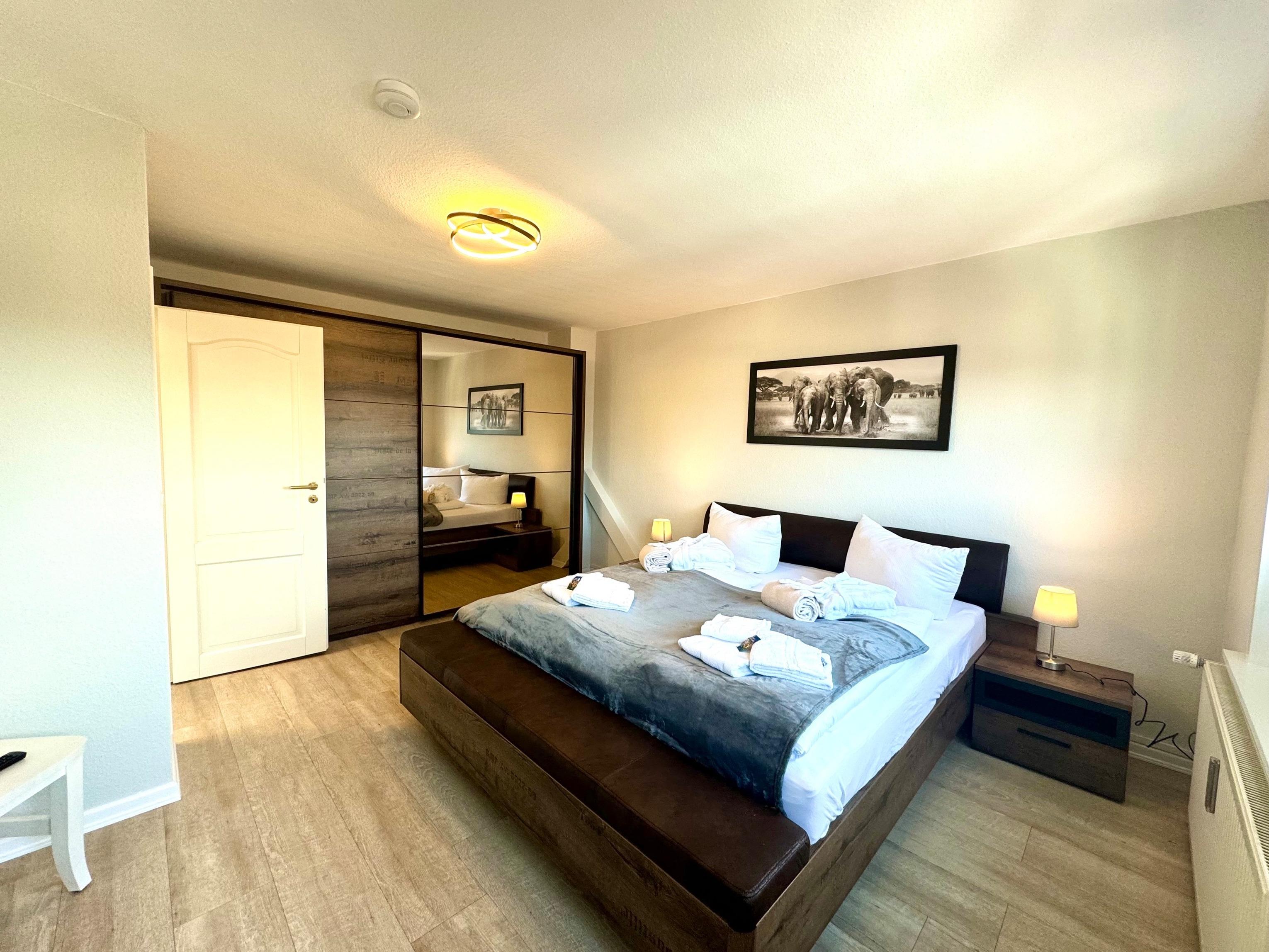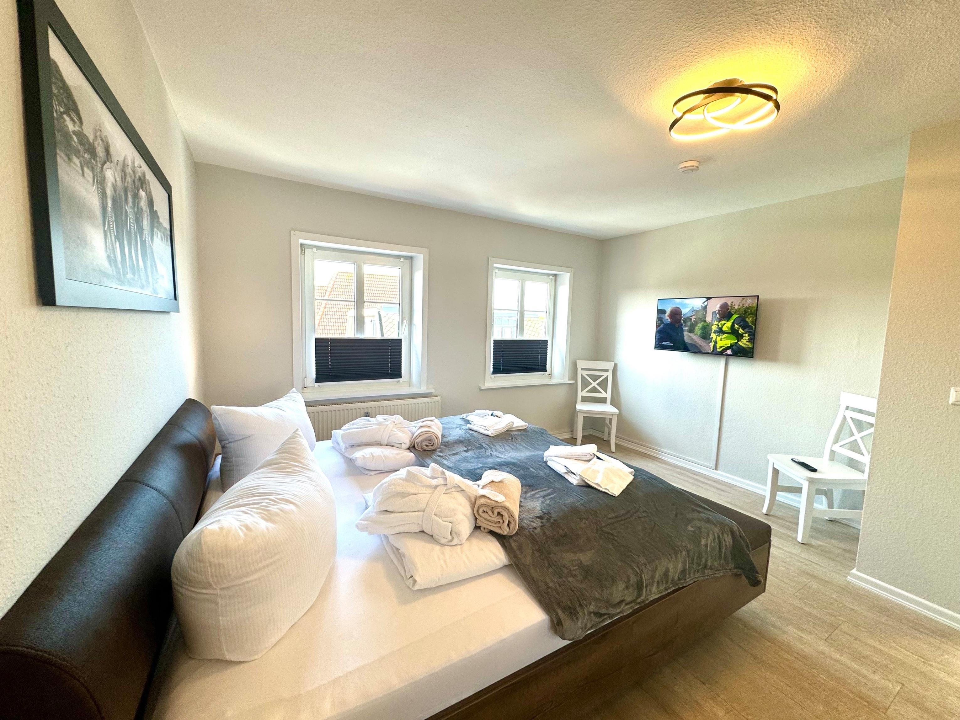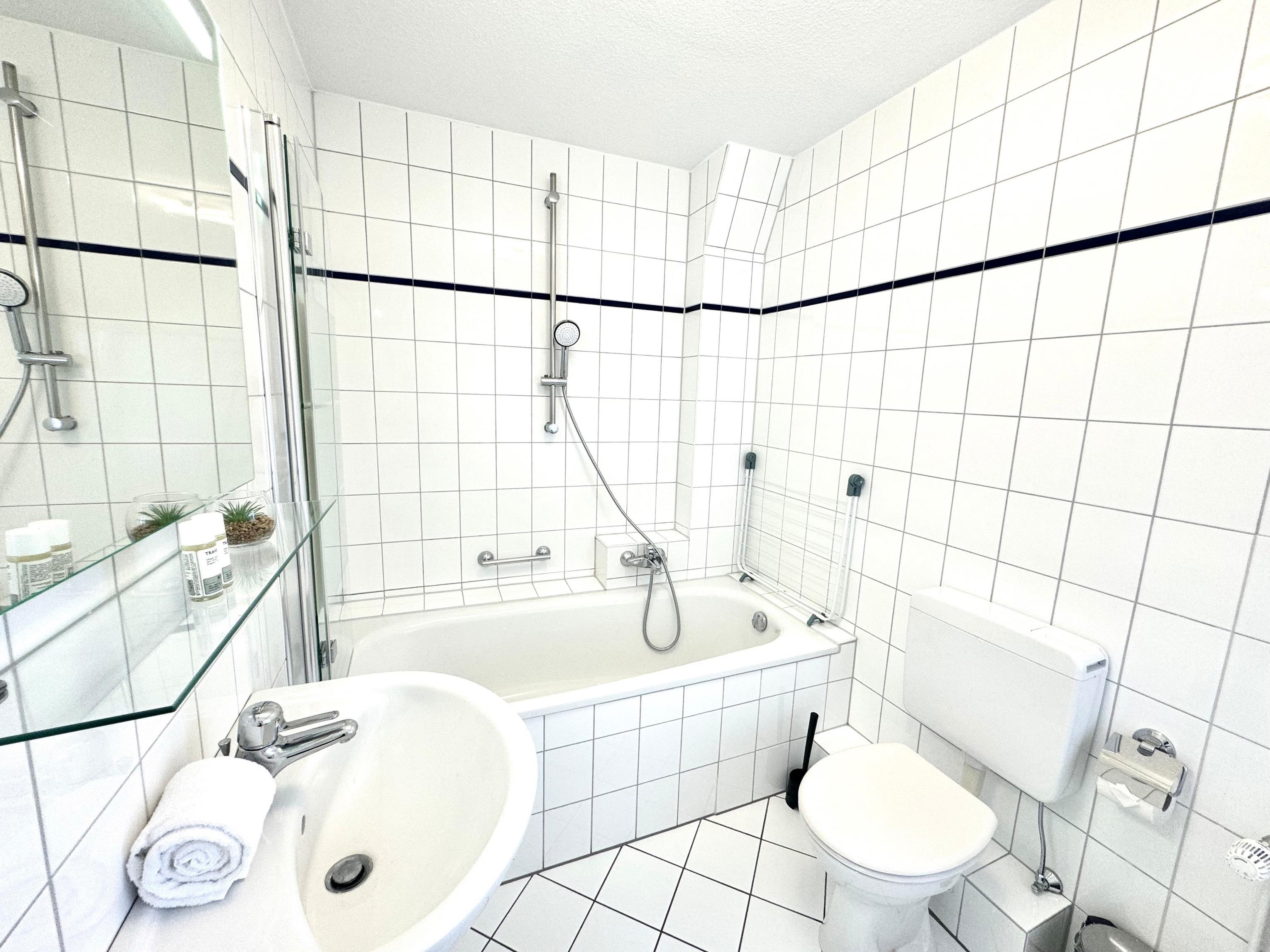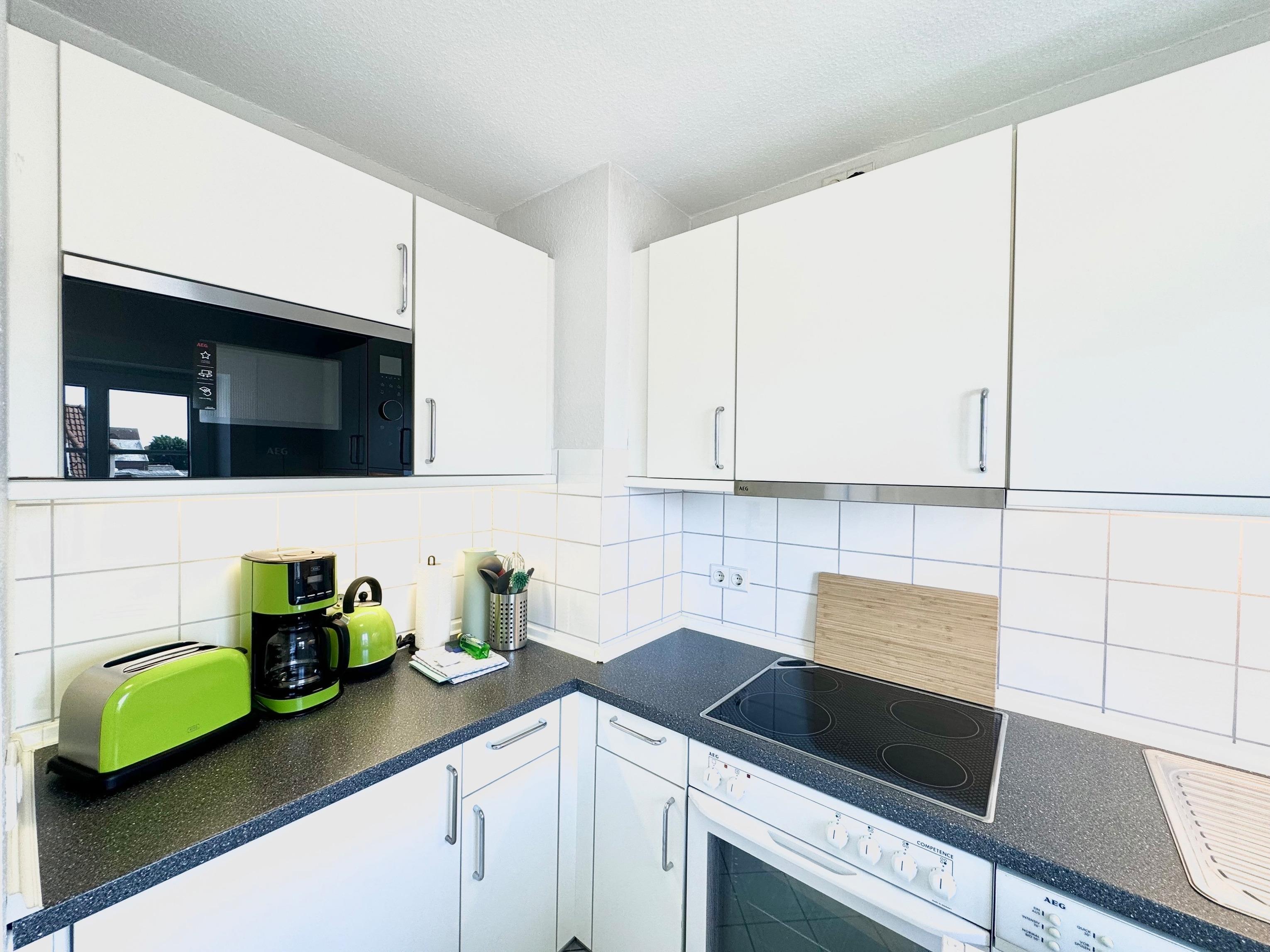 In dieser Ferienwohnung befindet sich ein geräumiges Schlafzimmer mit Boxspring-Doppelbett und SAT-TV. Ebenso vom Flur ausgehend erreichen Sie das helle Wannenbad mit Bade- und Duschamatur und WC. Die Küche bietet neben umfangreichen Kochutensilien, Geschirr und Besteck einen 4-Platten Ceranfeld Herd und Ofen, Kühlschrank mit kleinem Gefrierfach, Kaffeefiltermaschine, Toaster und Wasserkocher, Mikrowelle sowie eine Geschirrspülmaschine.