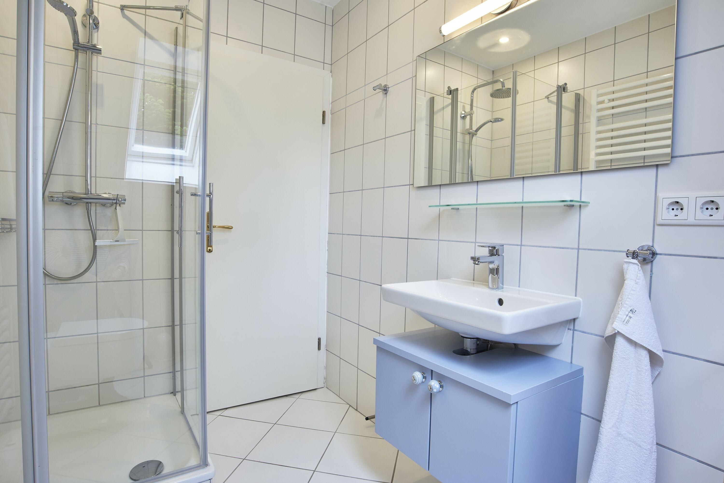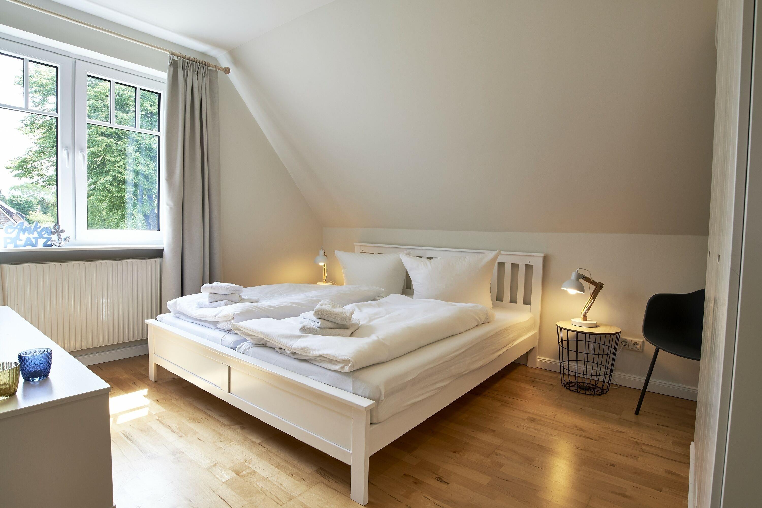 Der kleinere Schlafbereich verfügt über ein behagliches Schlafzimmer mit Doppelbett, ein Bad mit Regendusche sowie einen Flur mit Garderobe. Der größere Schlafbereich bietet neben einem hellen Schlafzimmer mit Doppelbett ein weiteres Schlafzimmer mit zwei Einzelbetten, ein Duschbad mit Regendusche und Waschtrockner.