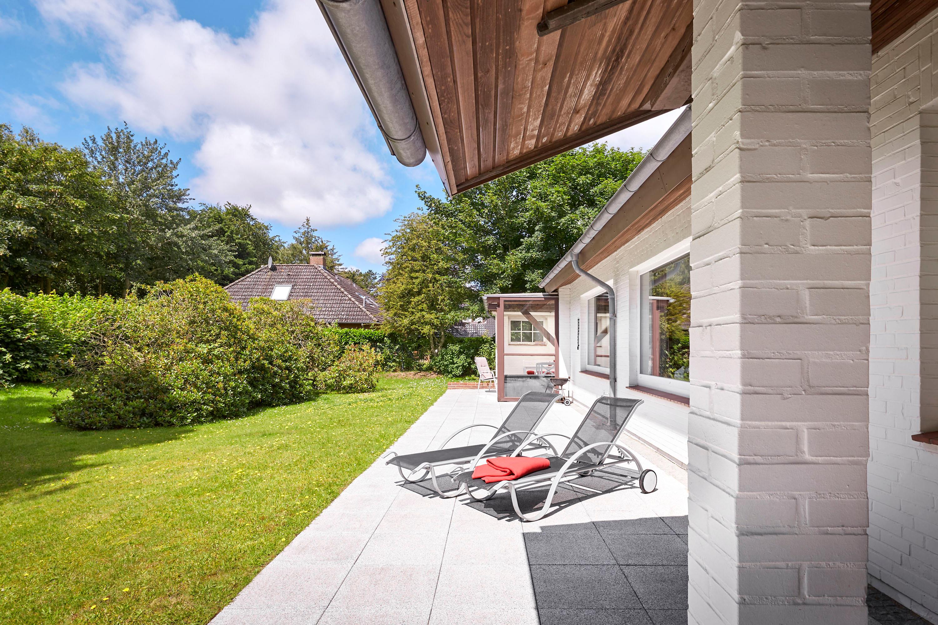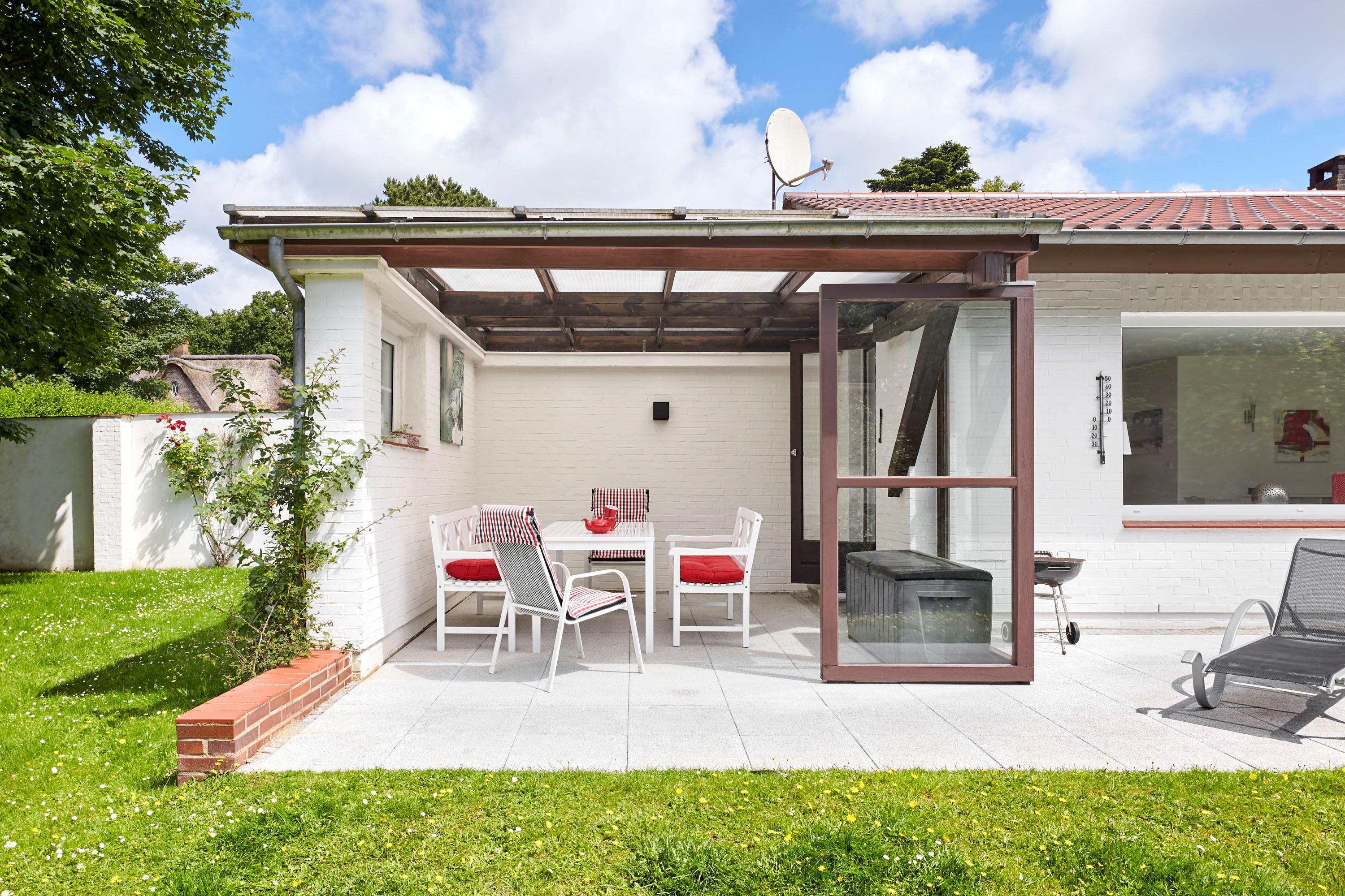 In diesem Einzelhaus im Bungalowstil werden Sie einen wunderbaren Urlaub genießen. Vom großen Wohn-Esszimmer gelangen Sie über eine überdachte Terrasse direkt in den Garten. Sollte also mal ein kurzer Schauer das Grillvergnügen trüben, sitzen Sie geschützt im Freien. Möchten Sie den Tag nicht im eigenen Garten verbringen, machen Sie sich auf den Weg zur Strandpromenade. In nur wenigen Minuten gelangen Sie zu Fuß oder auch per Rad zum Wasser. Angelehnt ist der Grünstreifen an einen Wald, welcher mit wunderschönen Wegen zum Spazierengehen einlädt.