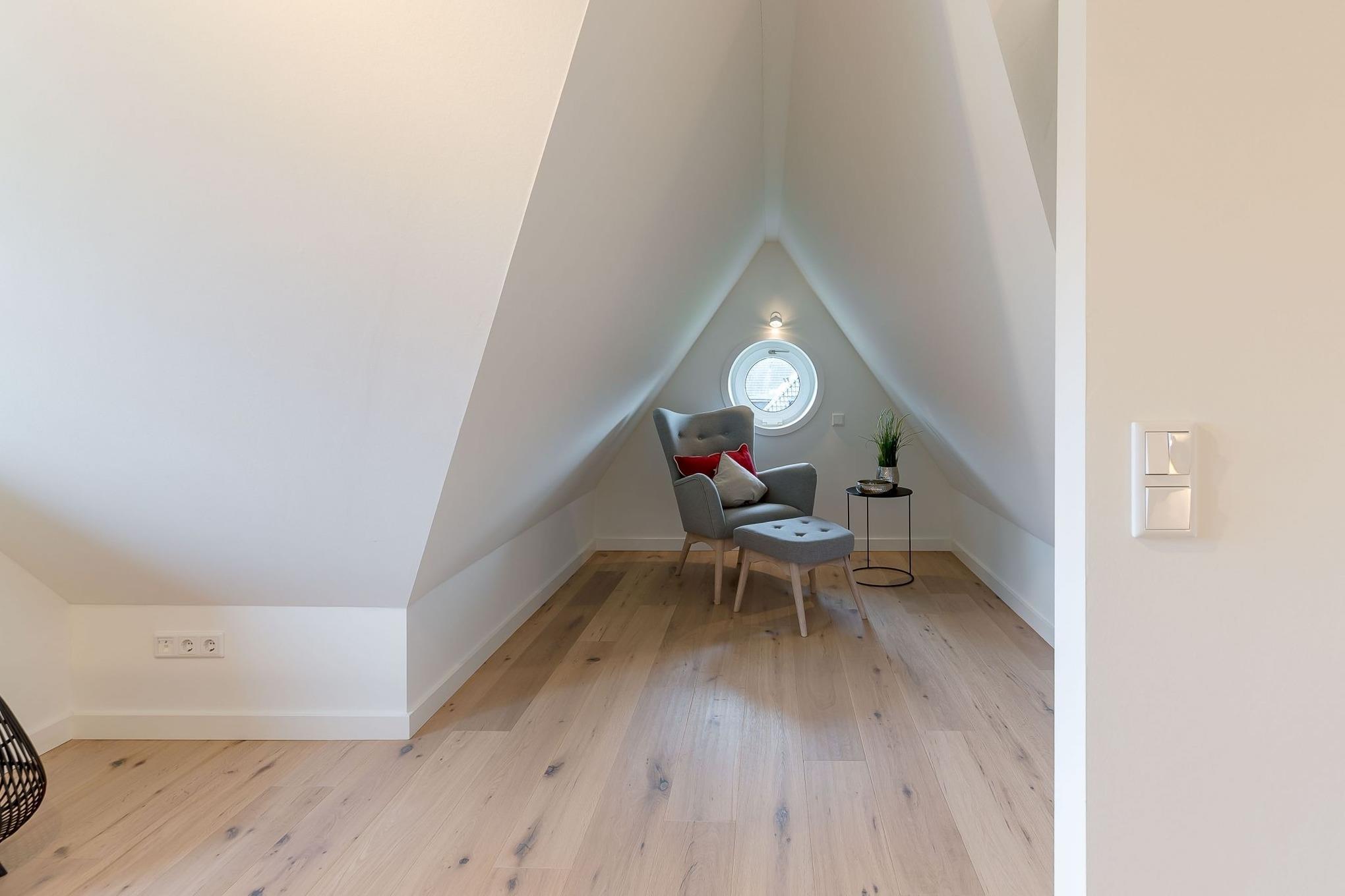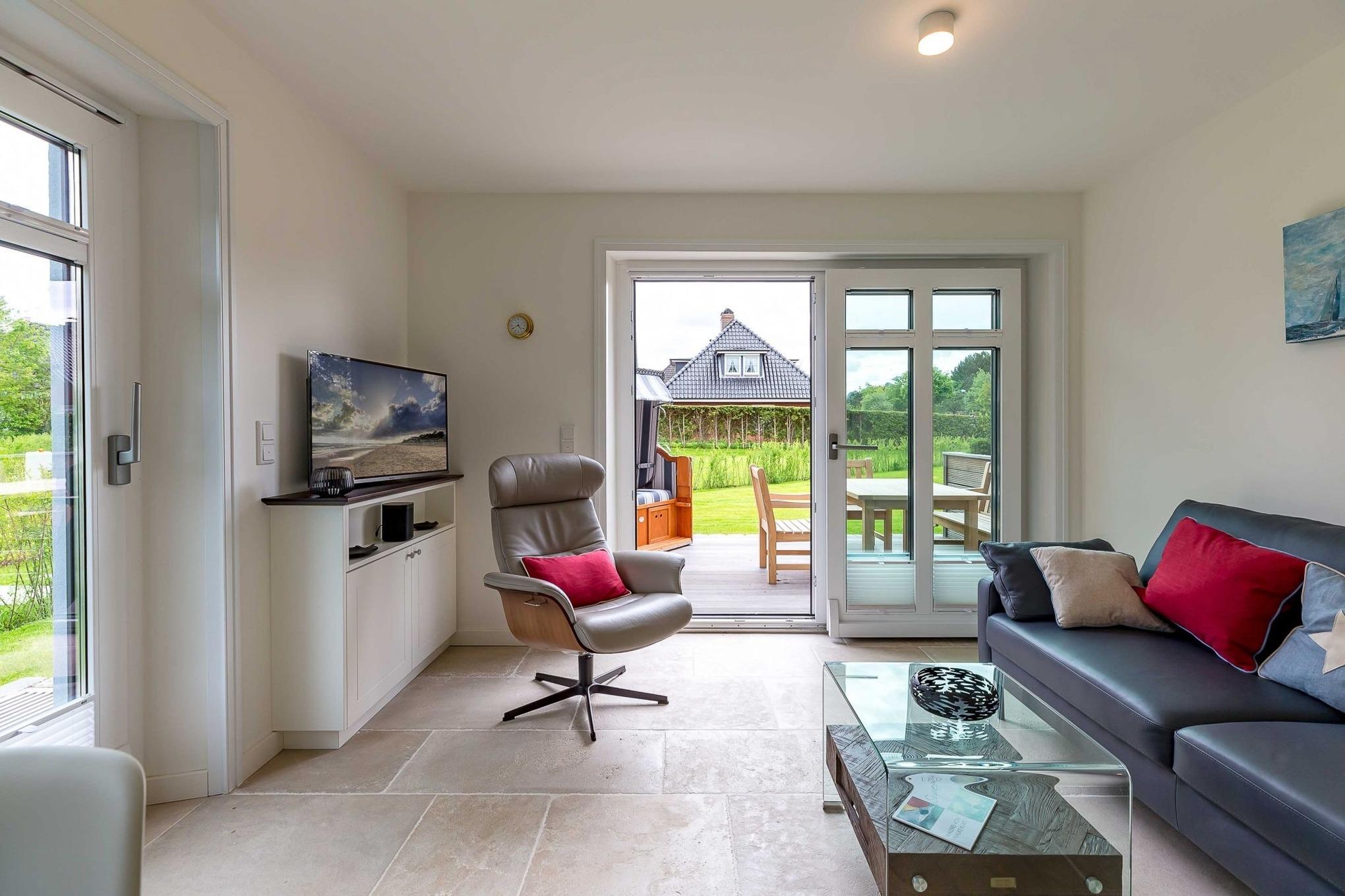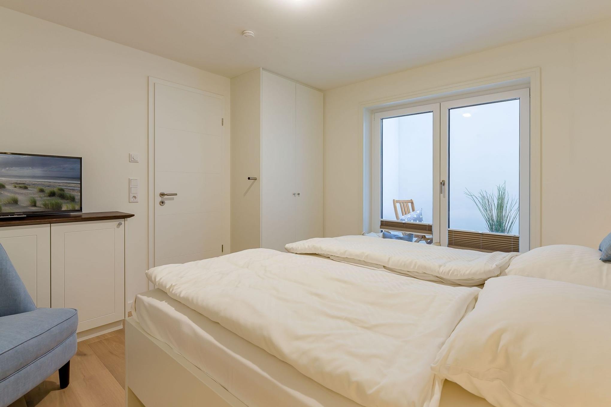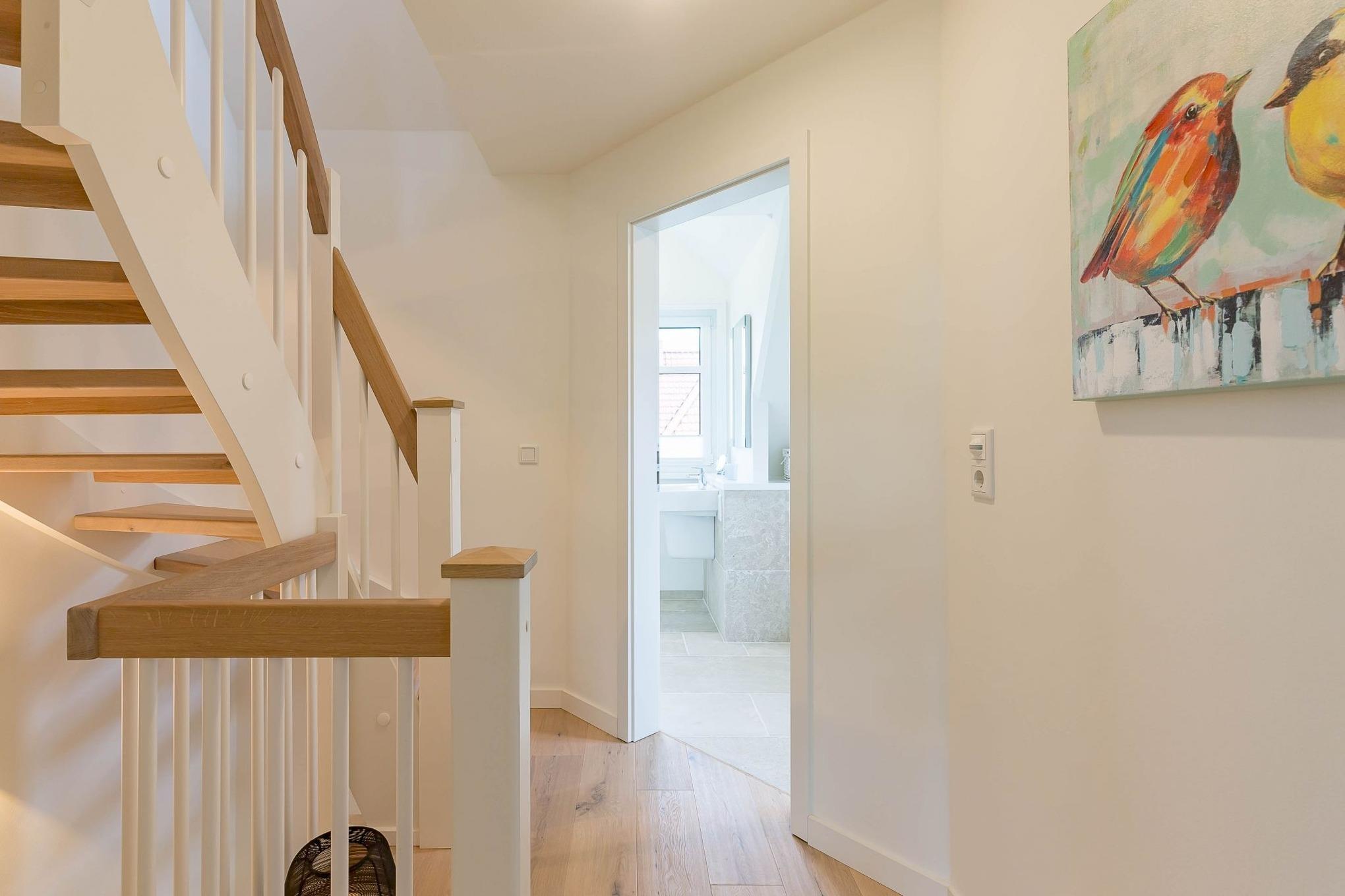 Von dort gelangen Sie über die zu gemütlichen Sonnenstunden einladende Terrasse in den Garten, wo Ihnen ein eigener Strandkorb zur Verfügung steht. Im Untergeschoss schaffen ein individuell von einer örtlichen Tischlerei eingerichtetes Doppelschlafzimmer sowie ein Bad mit bodentiefer Dusche und eine Sauna eine wohlige Atmosphäre. Der zweite ebenso hochwertig ausgestattete Doppelschlafraum befindet sich im Obergeschoss. Auch hier steht ein separates Bad mit bodentiefer Natursteindusche zur Verfügung.