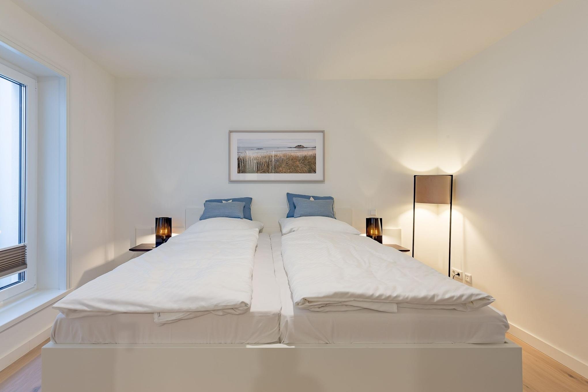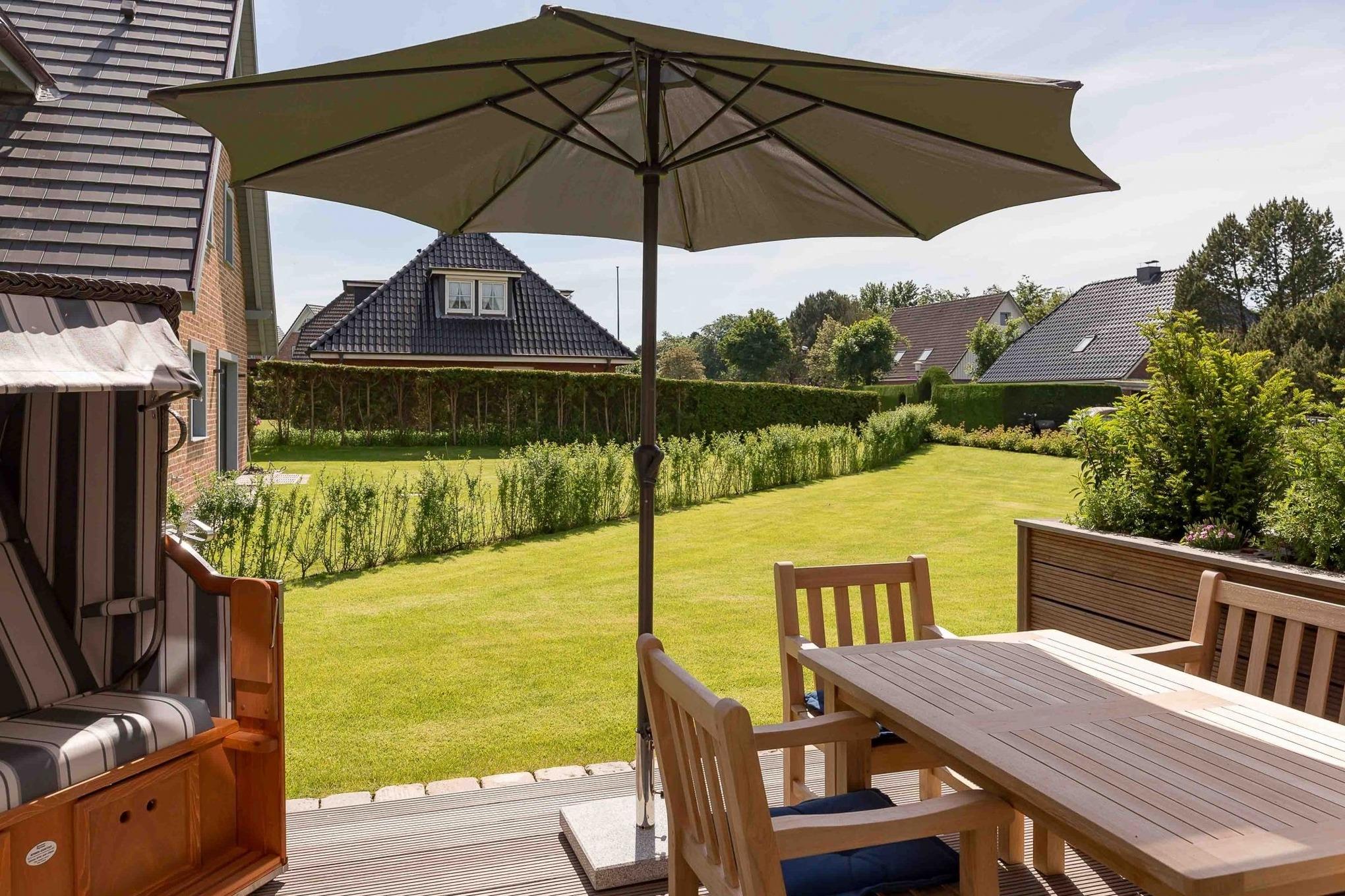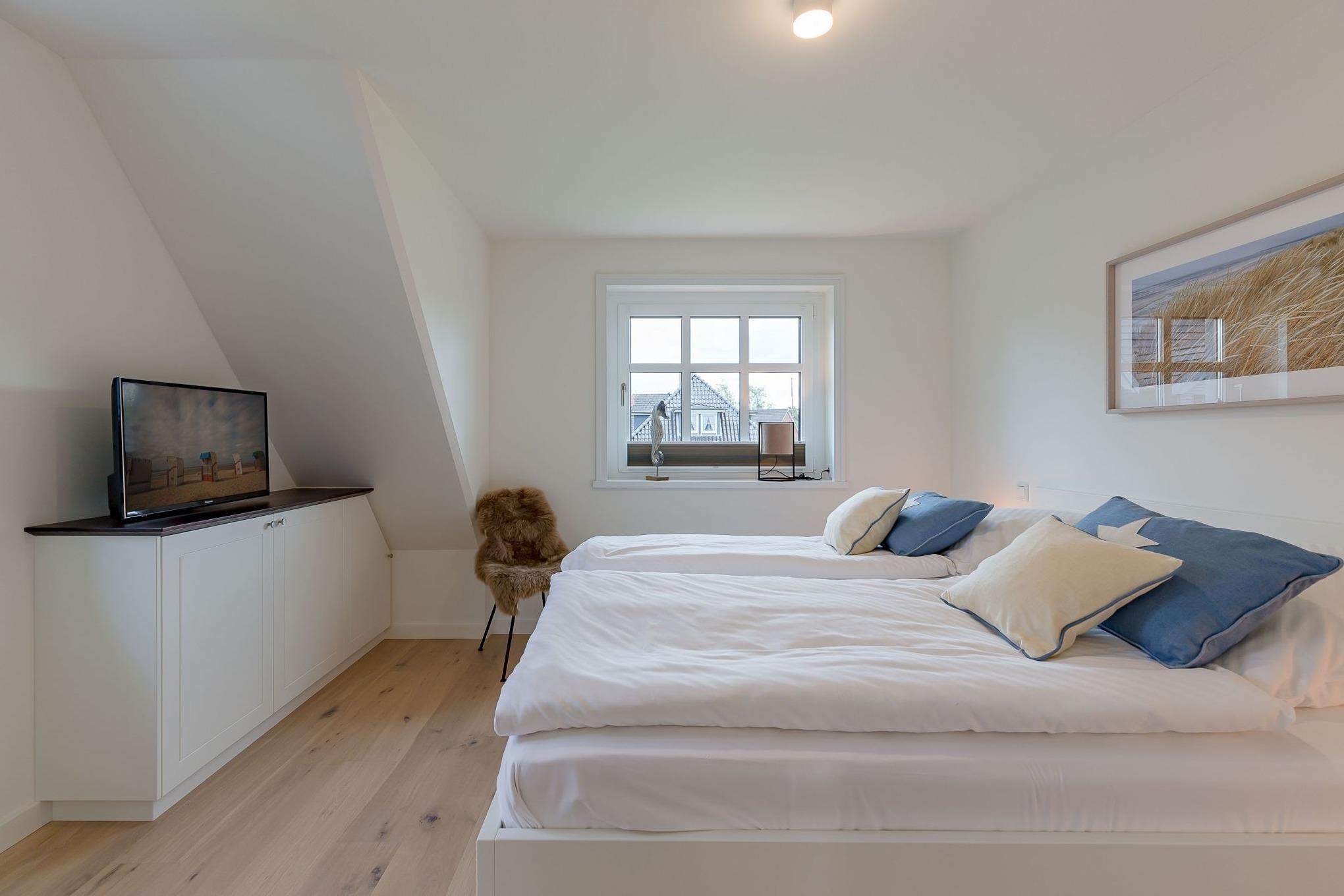Von dort gelangen Sie über die zu gemütlichen Sonnenstunden einladende Terrasse in den Garten, wo Ihnen ein eigener Strandkorb zur Verfügung steht. Im Untergeschoss schaffen ein individuell von einer örtlichen Tischlerei eingerichtetes Doppelschlafzimmer sowie ein Bad mit bodentiefer Dusche und eine Sauna eine wohlige Atmosphäre. Der zweite ebenso hochwertig ausgestattete Doppelschlafraum befindet sich im Obergeschoss. Auch hier steht ein separates Bad mit bodentiefer Natursteindusche zur Verfügung.