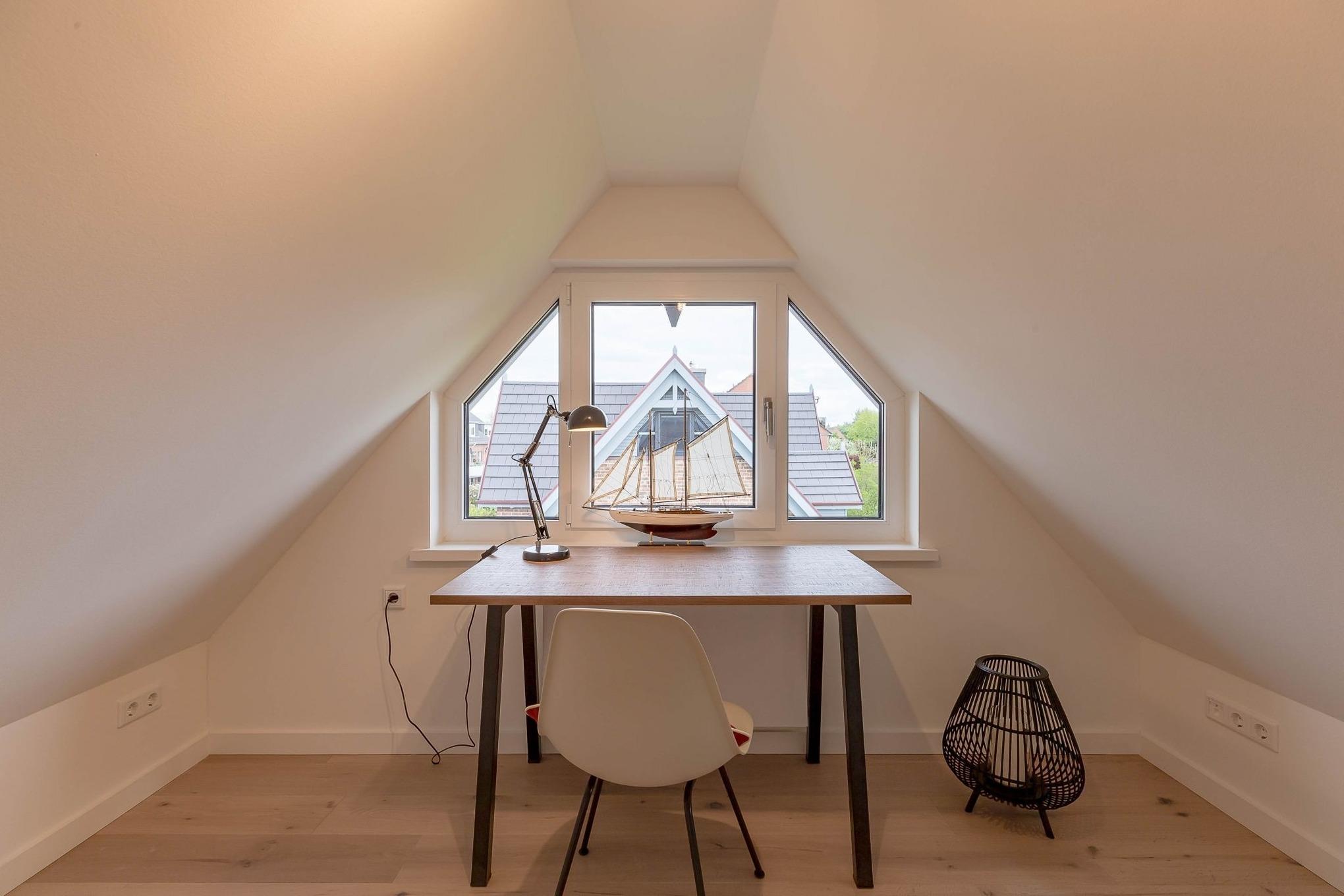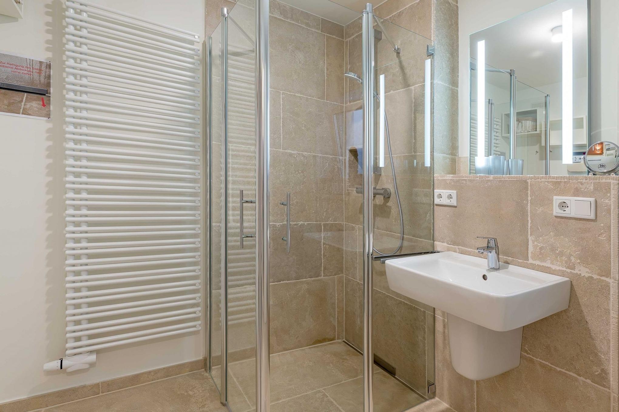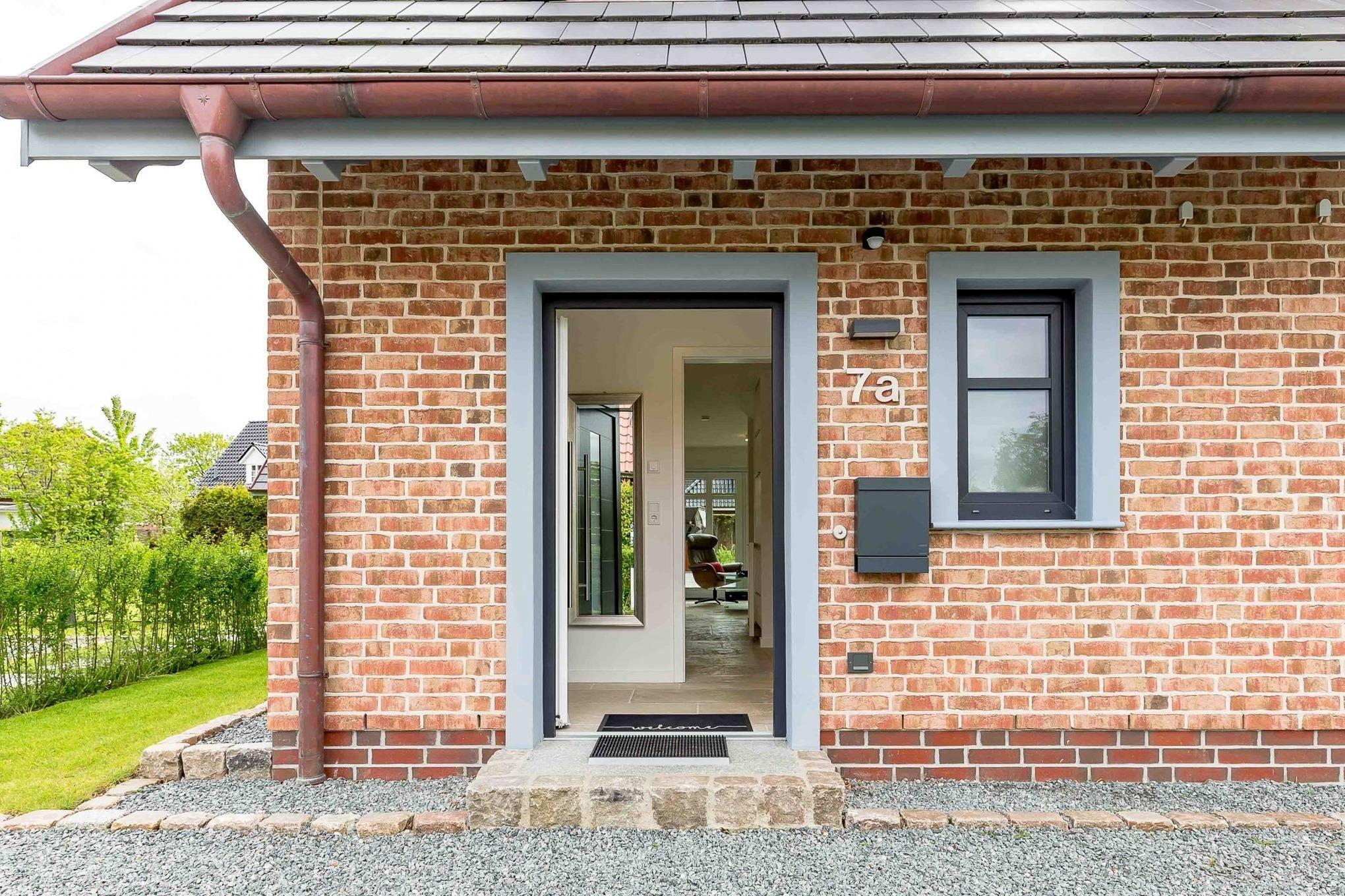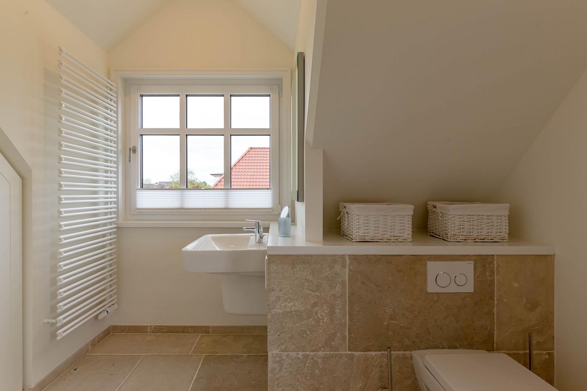 Von dort gelangen Sie über die zu gemütlichen Sonnenstunden einladende Terrasse in den Garten, wo Ihnen ein eigener Strandkorb zur Verfügung steht. Im Untergeschoss schaffen ein individuell von einer örtlichen Tischlerei eingerichtetes Doppelschlafzimmer sowie ein Bad mit bodentiefer Dusche und eine Sauna eine wohlige Atmosphäre. Der zweite ebenso hochwertig ausgestattete Doppelschlafraum befindet sich im Obergeschoss. Auch hier steht ein separates Bad mit bodentiefer Natursteindusche zur Verfügung.