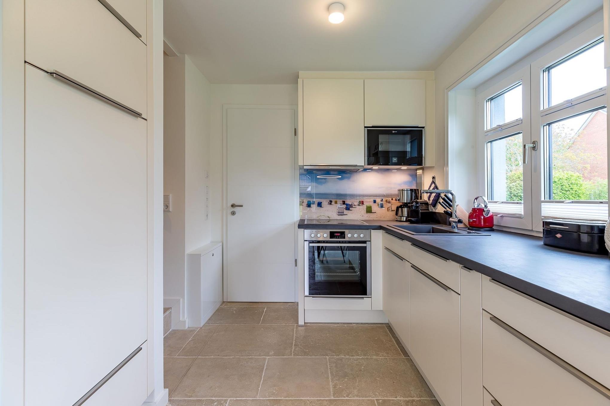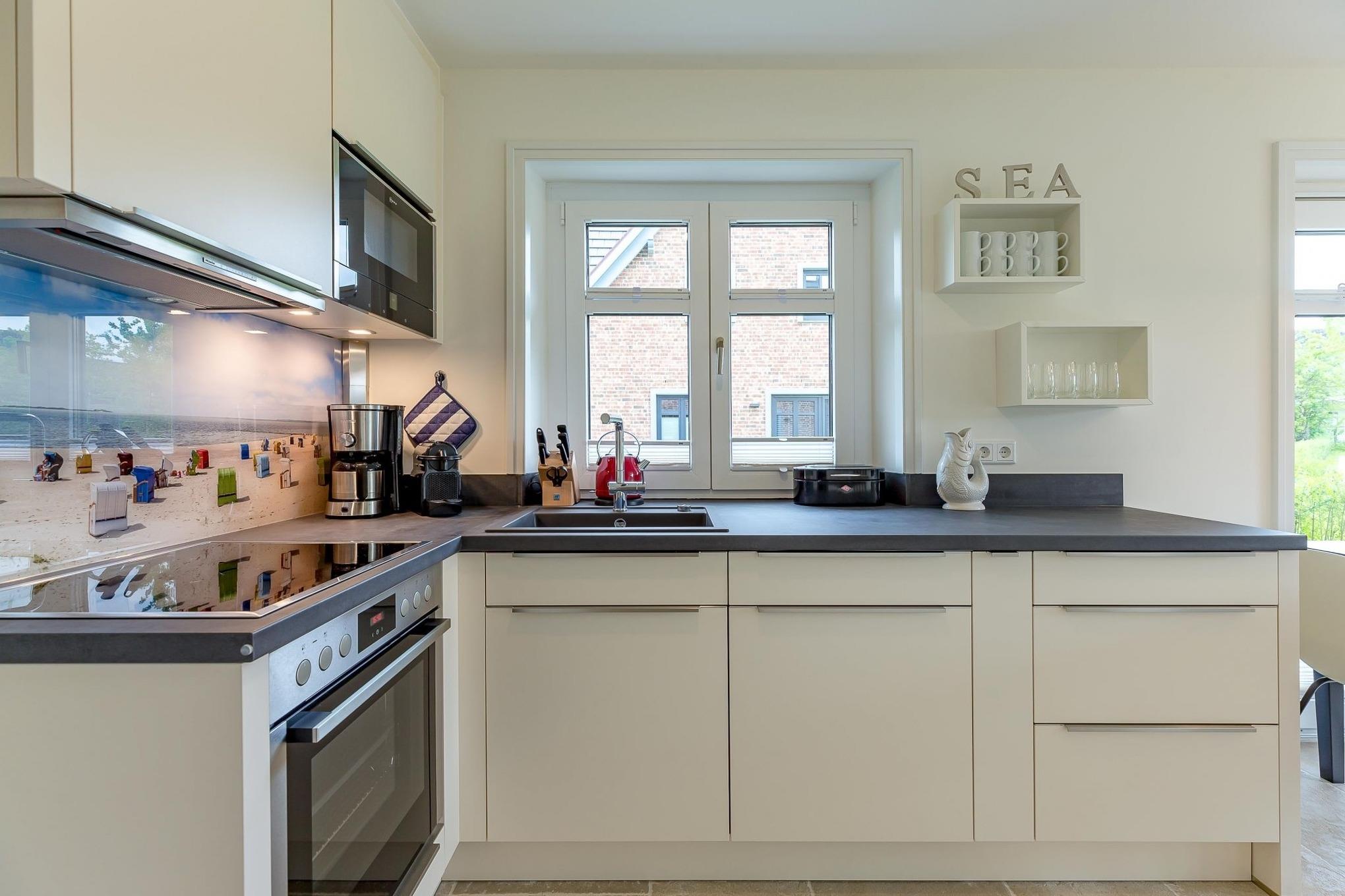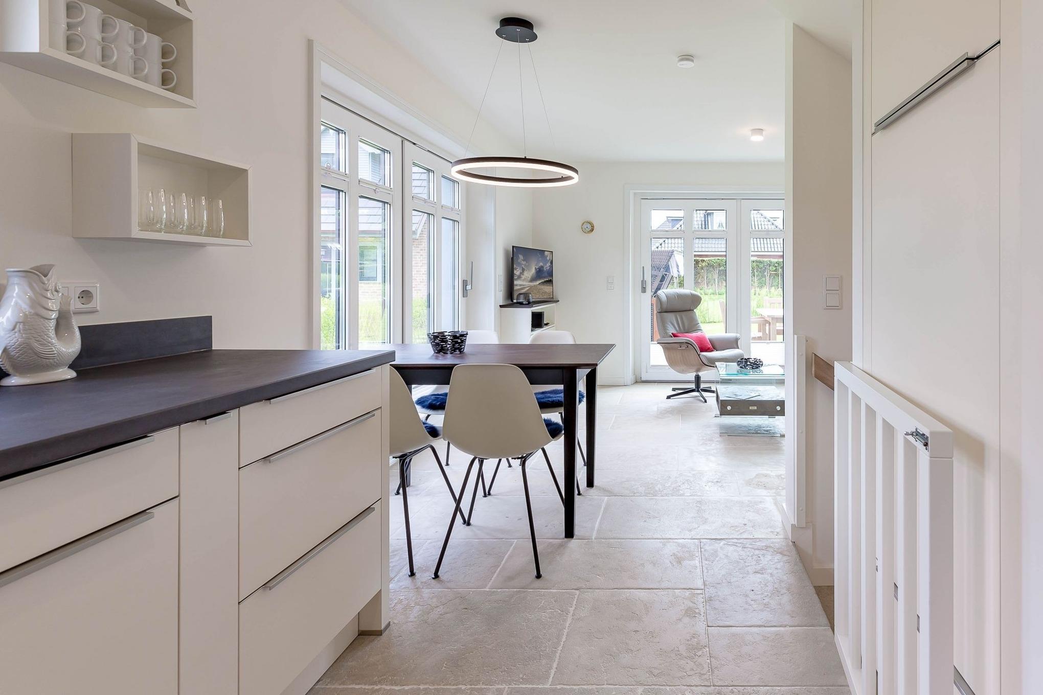 Im Erdgeschoss Ihres Feriendomizils befindet sich neben der Garderobe und der Gästetoilette der offene Wohn-/Essbereich mit komfortabel ausgestatteter Küche.
