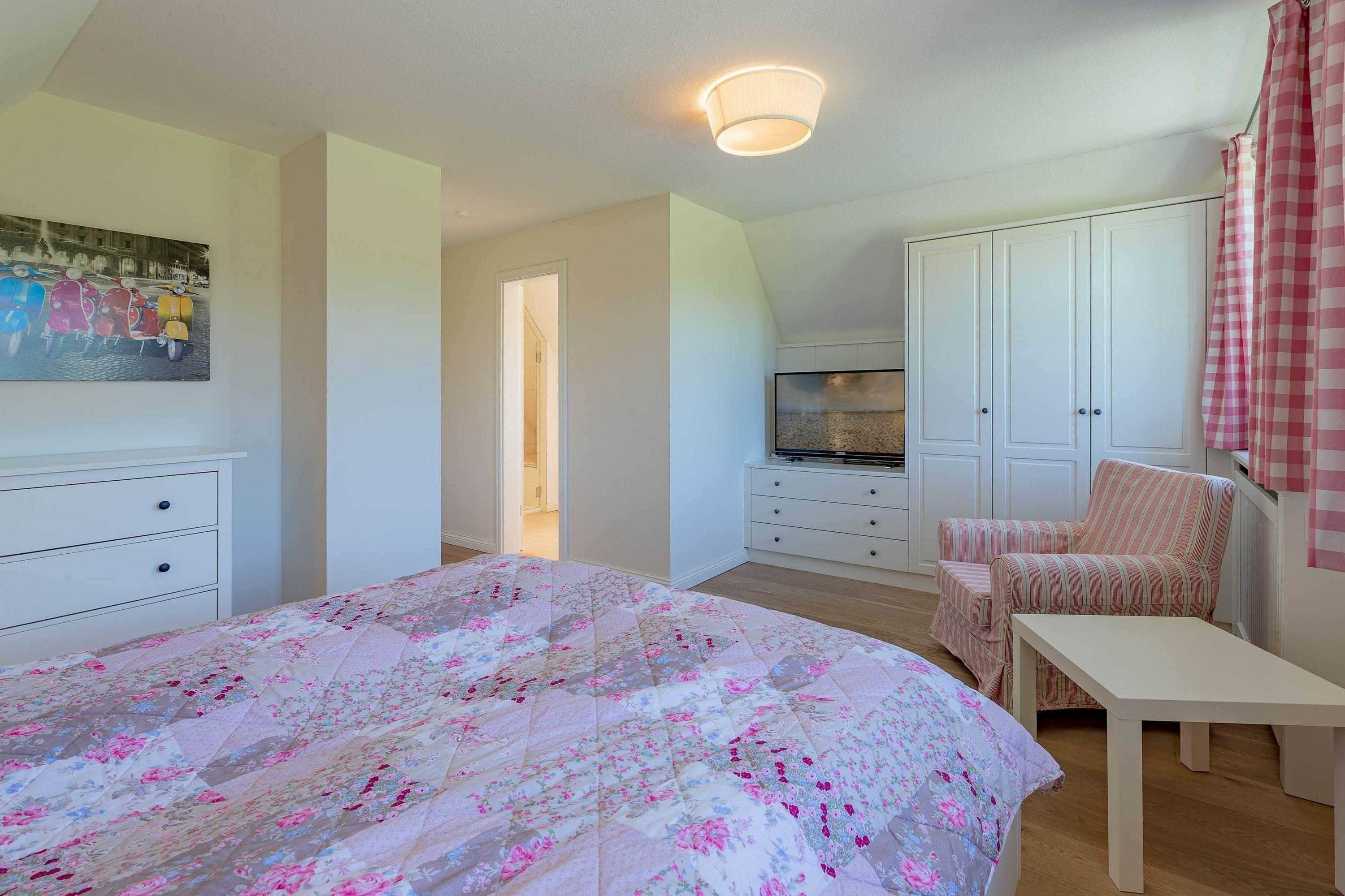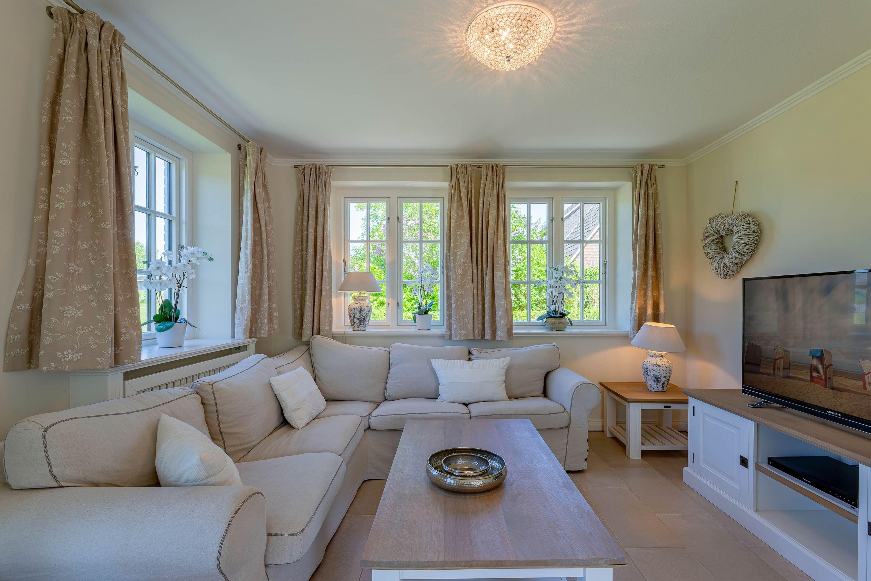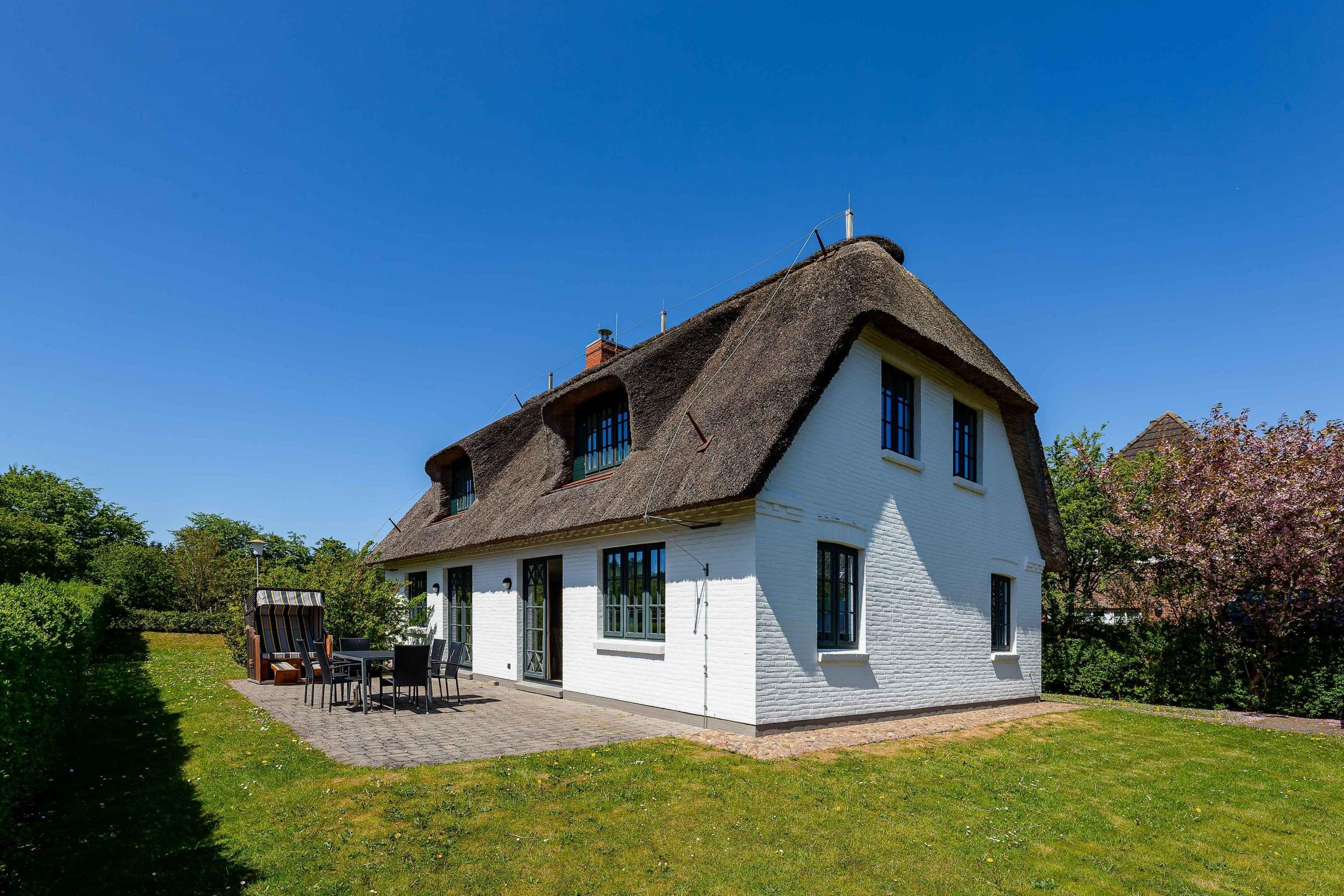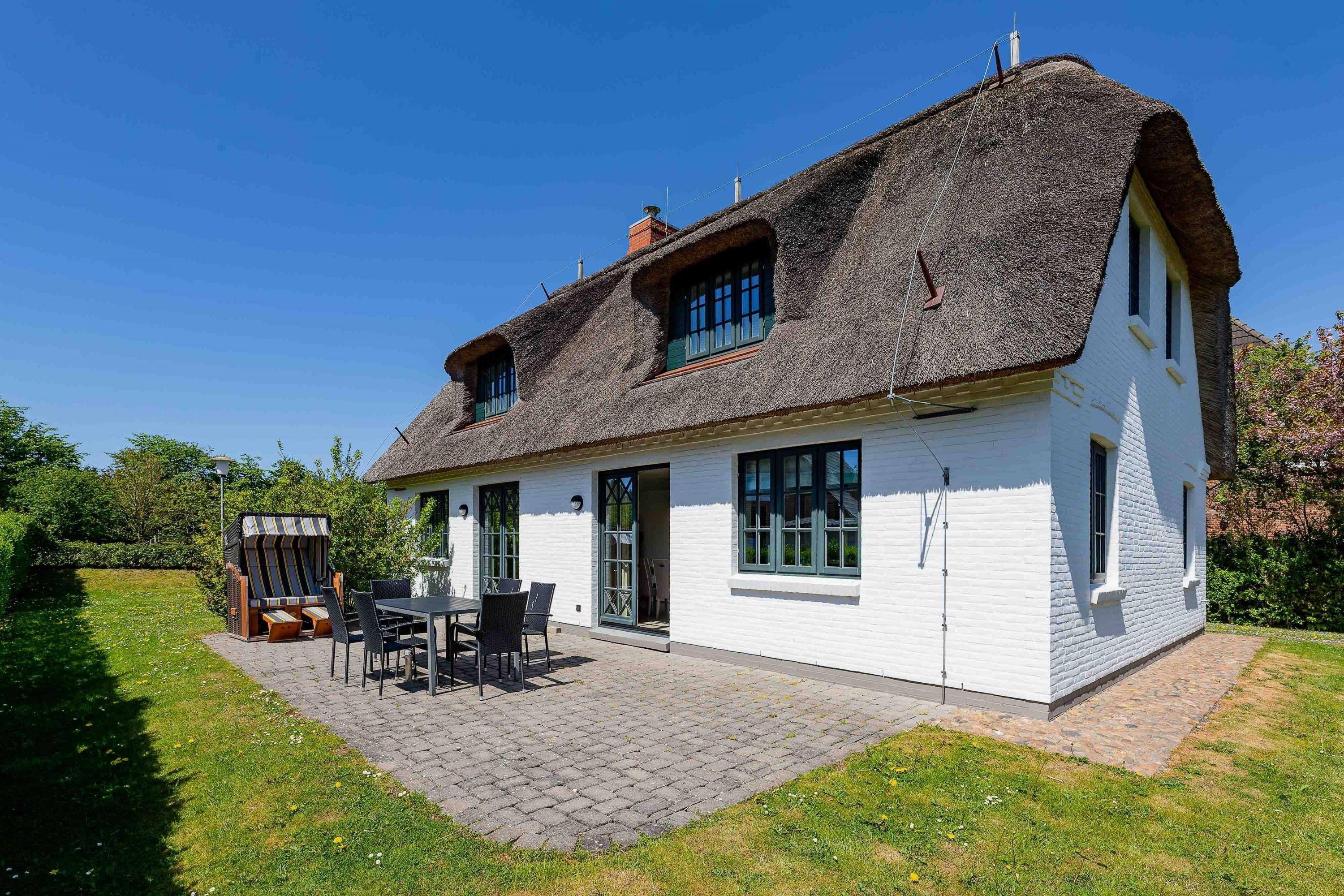 Ein typisches Friesenhaus mit sehr schöner Architektur. Die Summe schöner Details – Holzsprossenfenster, Reetdach, schöne Fliesen und Holzarbeiten - schafft eine wunderbare Atmosphäre. Im Erdgeschoss befindet sich ein großes, modern eingerichtetes Wohnzimmer mit Essplatz, von welchem Sie direkt auf die ca. 36 qm große Terrasse gelangen. Desweiteren eine moderne Küche, ein Schlafraum, sowie Diele, Bad und HWR. Im Obergeschoss sind zwei Schlafzimmer mit integrierten Bädern und die hauseigene Sauna. In nur wenigen Gehminuten gelangen Sie zum Südstrand, oder Golfplatz. Waldspaziergänge können direkt vor der Tür starten. Alle Erholungs- und Einkaufsmöglichkeiten sowie Cafés und Restaurants liegen ca. 1,5 km entfernt.