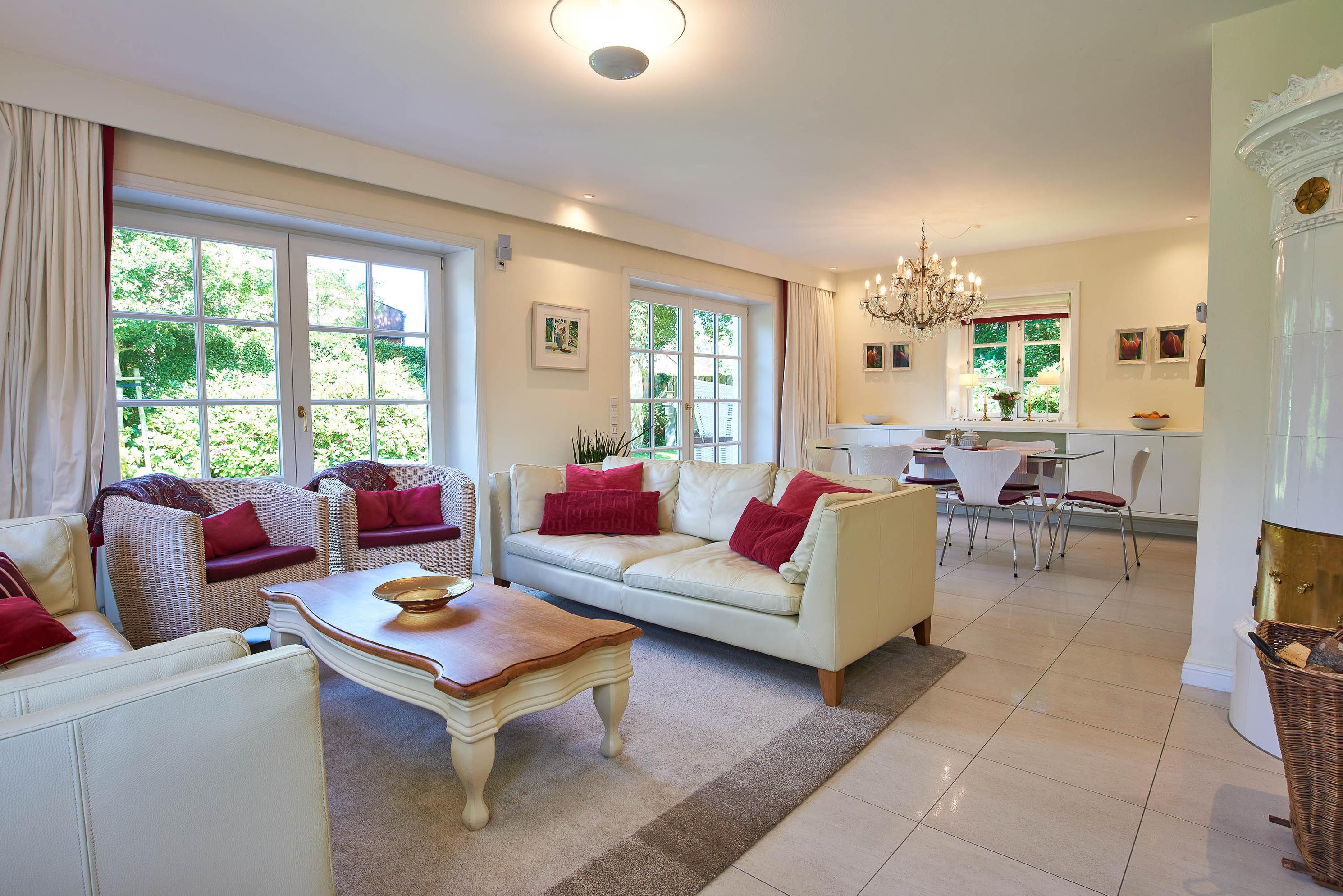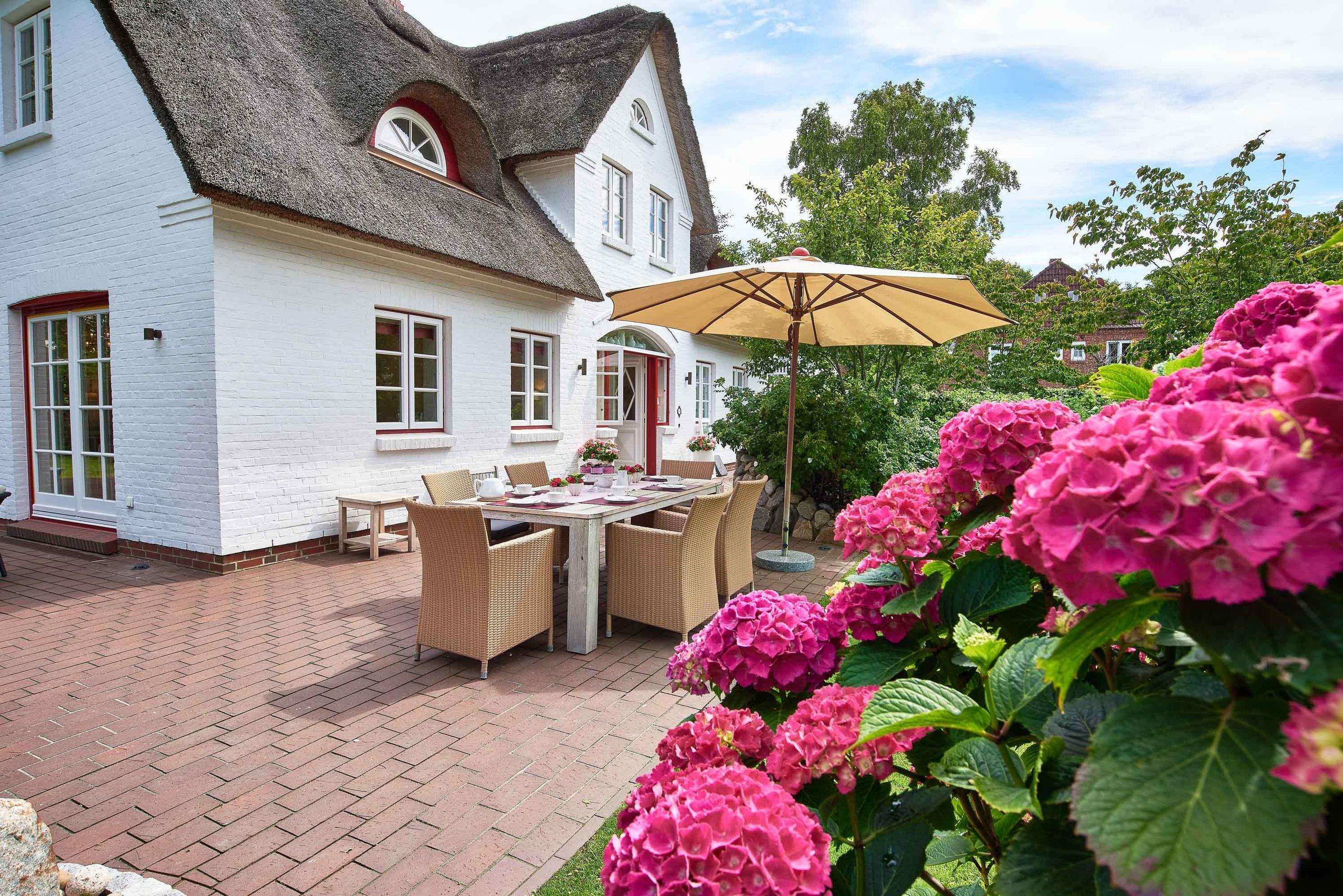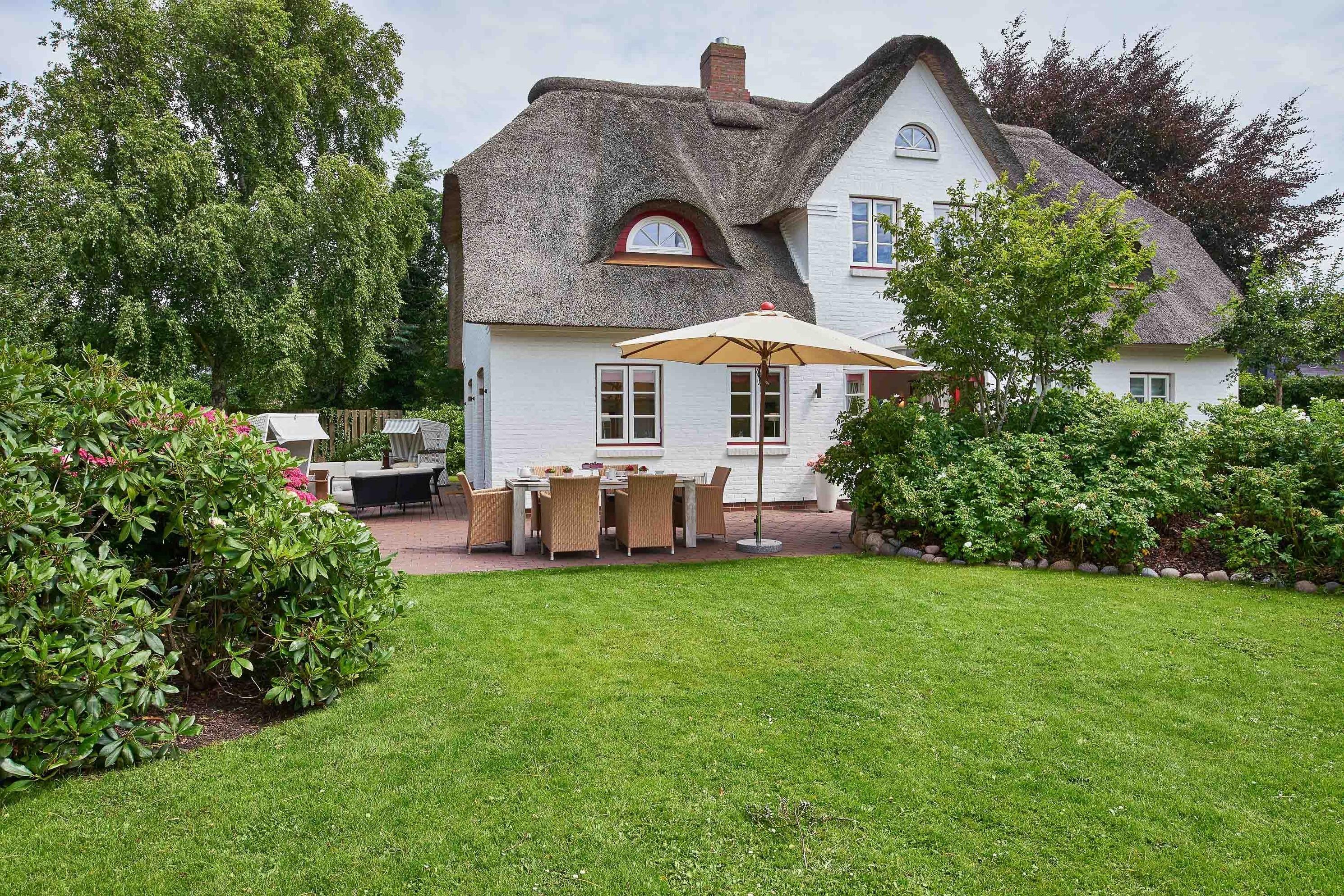Entdecken Sie das versteckte, märchenhaft im Herzen von Wyk gelegene Einzelhaus unter Reet, das idyllisch und sehr ruhig in zweiter Reihe nur von Gärten umsäumt auf einem ca. 1.000 m2 großen, eingewachsenen Grundstück liegt. Der wunderschön angelegte Garten bietet durch innere Friesenwälle viel Privatsphäre und durch Illumination am Abend eine außergewöhnliche Atmosphäre. Die stilvolle Einrichtung der Villa ist ein stimmiger Mix aus modernen Möbeln und antiken Einzelstücken. Genießen Sie die exklusiven Bäder und den Besuch in der geräumigen Gartensauna. Sie werden sich sicher gern an die gemütlichen Abende vor dem historischen Kachelofen im Wohnzimmer erinnern. Auch zwei der geräumigen Schlafräume sind mit je einem Panoramaofen ausgestattet. Nur ein kurzer Fußweg führt Sie zu den Einkaufsmöglichkeiten und der Promenade mit Badestrand, Bars und Cafes.