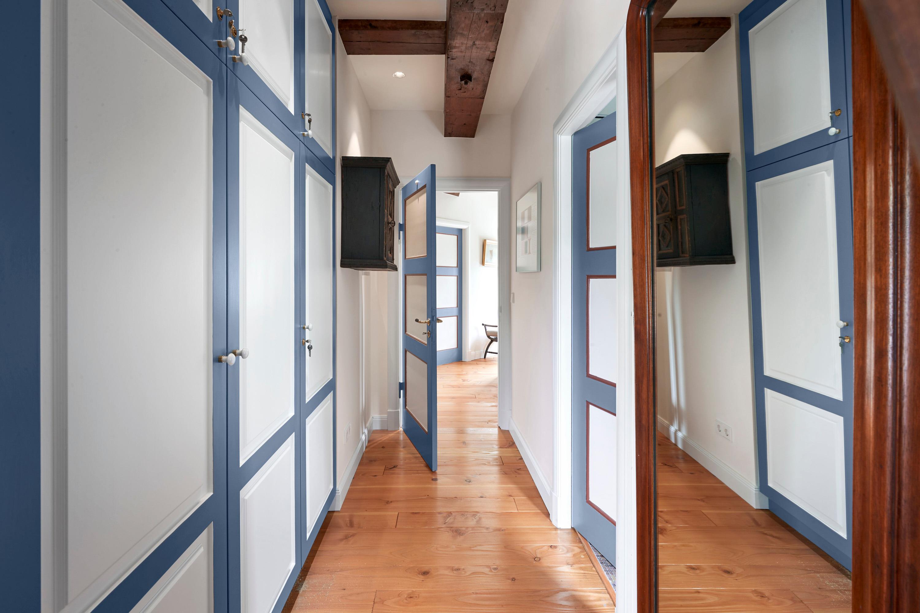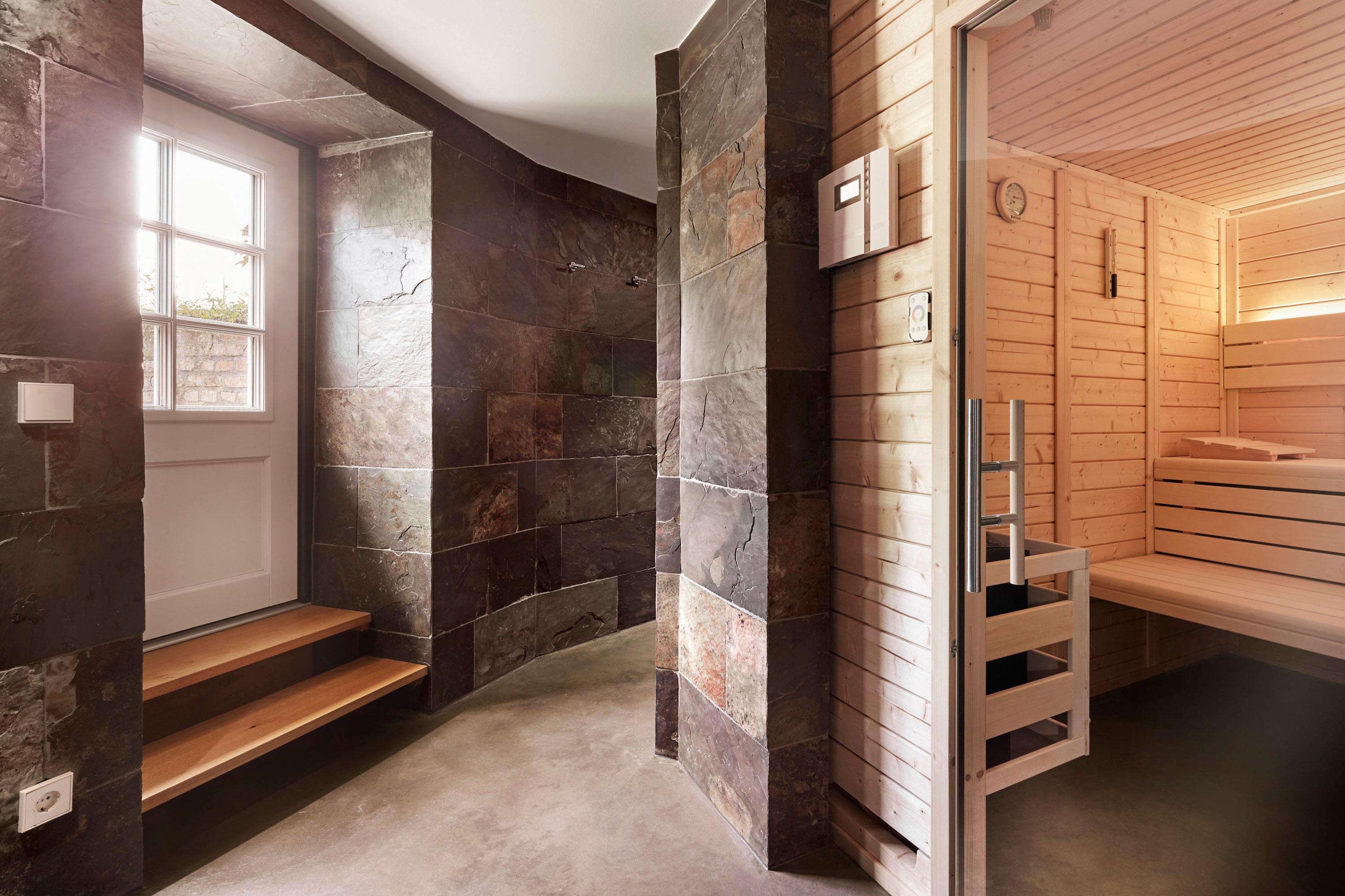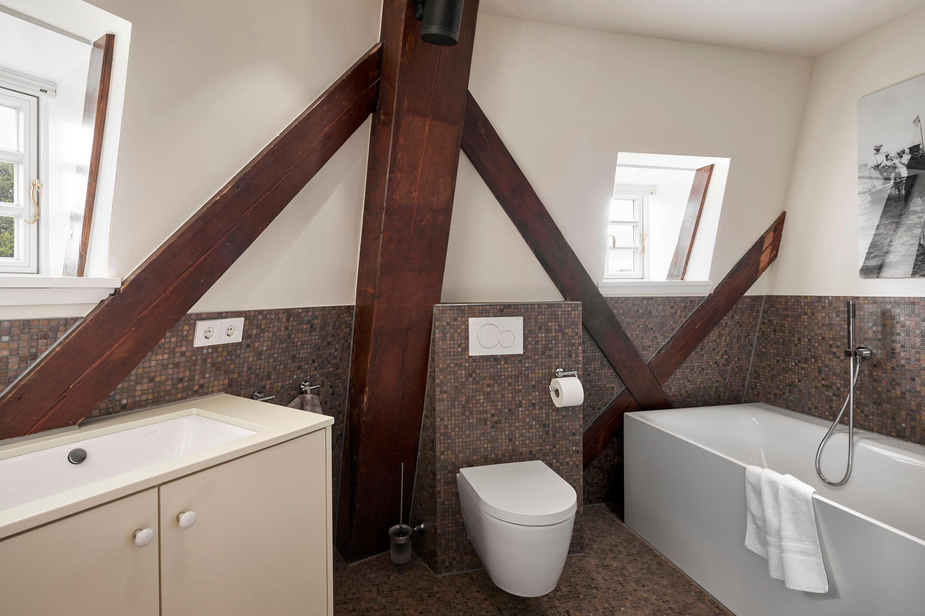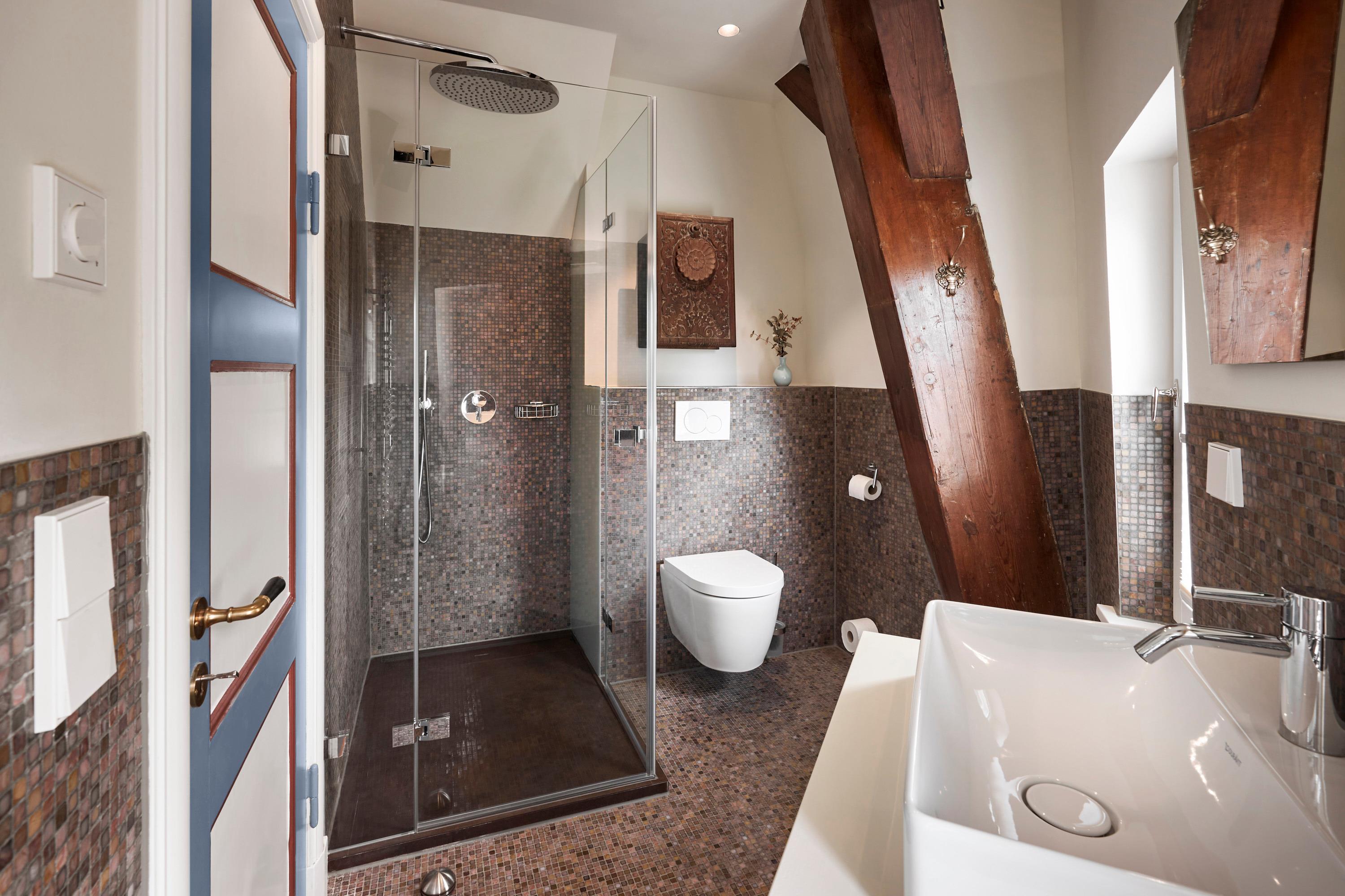 Dazu gehört natürlich auch eine Fußbodenheizung auf allen Etagen, beheizt über Erdwärme, ein state-of-the-art Soundsystem in allen Wohn- und Schlafräumen sowie in den Bädern, der Küche und im Sauna-Ruhebereich. Die Armaturen in Bädern und Küche sind von Dornbracht, die durch Hochwertigkeit und minimalistisches Design bestechen und so den Mix aus historisch und modern unterstreichen.
