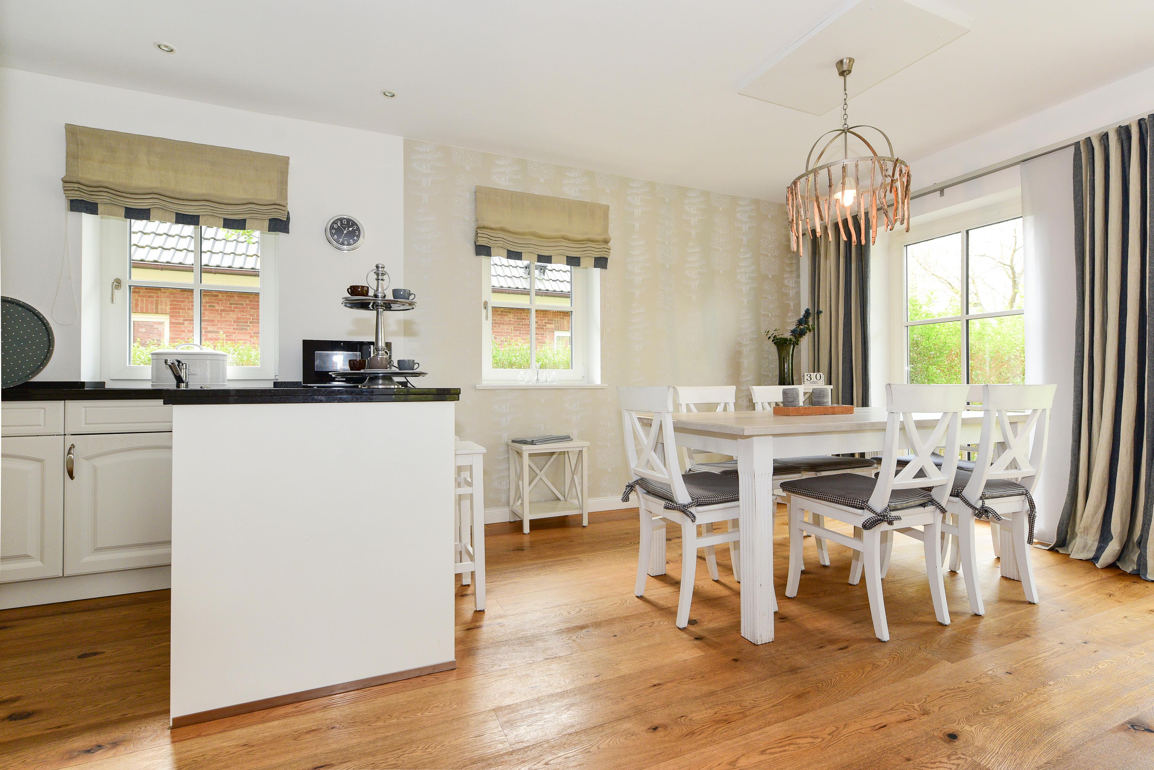 Der großzügige, lichtdurchflutete Wohn- und Essbereich wird durch eine sonnige Südterrasse ergänzt und lädt zum Entspannen ein. Der dänische Ofen sorgt an kühleren Tagen für behagliche Wärme, während die bodentiefen Fenster den Raum mit Tageslicht durchfluten. Der Esstisch ist ideal für gesellige Runden, und die offene, modern ausgestattete Küche begeistert Hobbyköche.