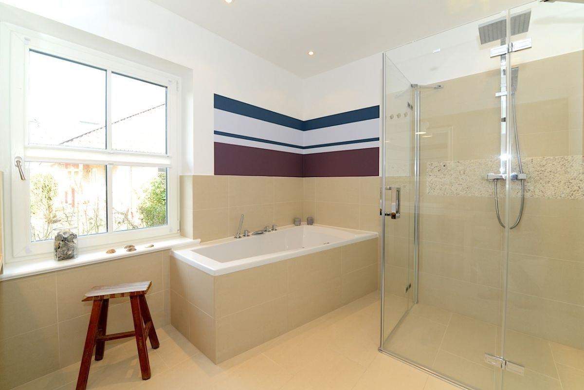 Das großzügige Badezimmer im Erdgeschoss, mit einer Badewanne, die mit Lichttherapie für zusätzliche Entspannung sorgt, und einer Regendusche bietet den perfekten Rückzugsort.