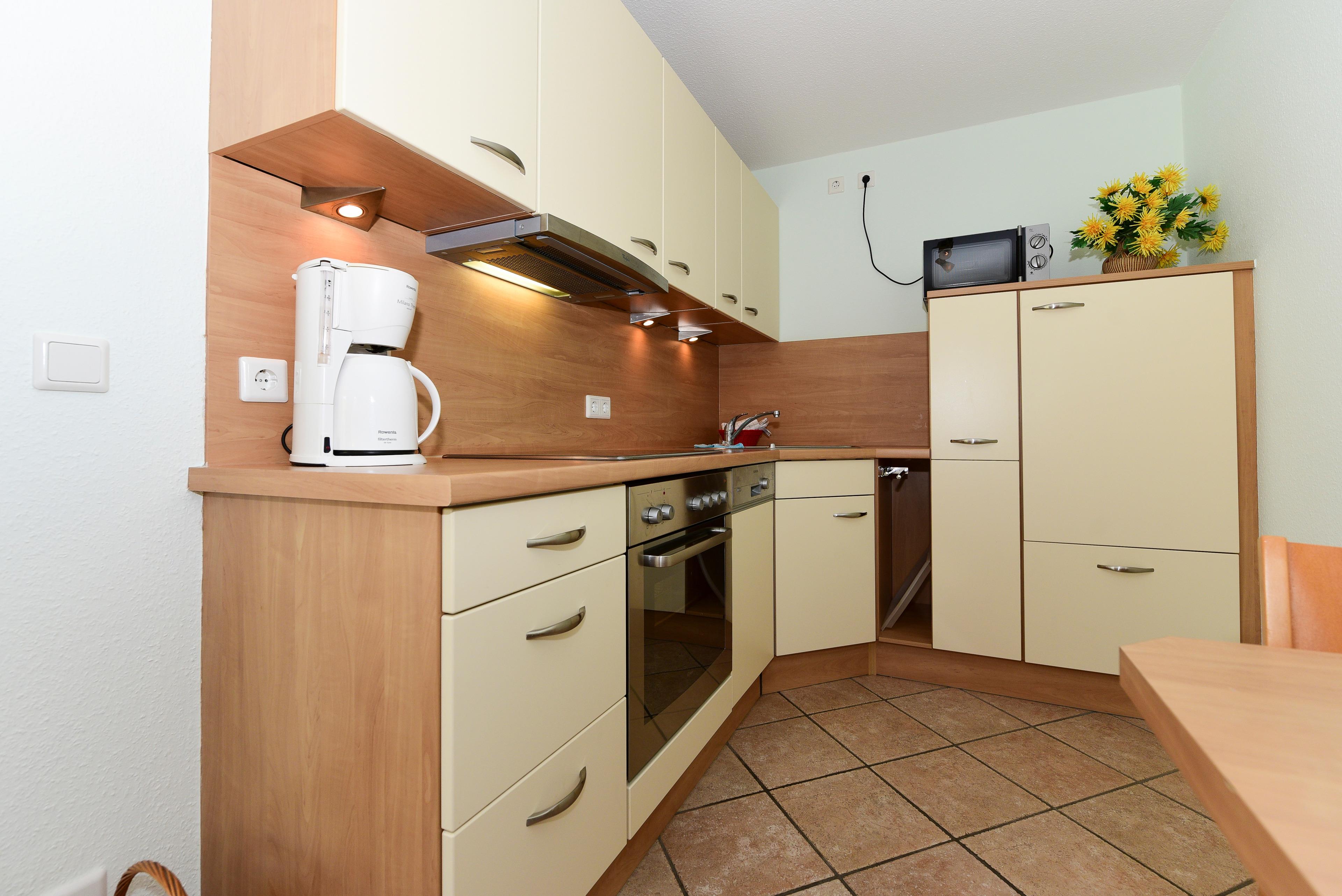 Die Wohnung 02 bietet ein helles und einladendes Wohnzimmer, das mit mehreren Sitzmöglichkeiten ausgestattet ist. Hier können Sie sich entspannen oder den seitlichen Balkon genießen, der zusätzlichen Raum zum Erholen bietet. Die moderne Einbauküche ist vollständig ausgestattet und verfügt über einen Essplatz für zwei Personen – perfekt für gemütliche Mahlzeiten zu zweit.