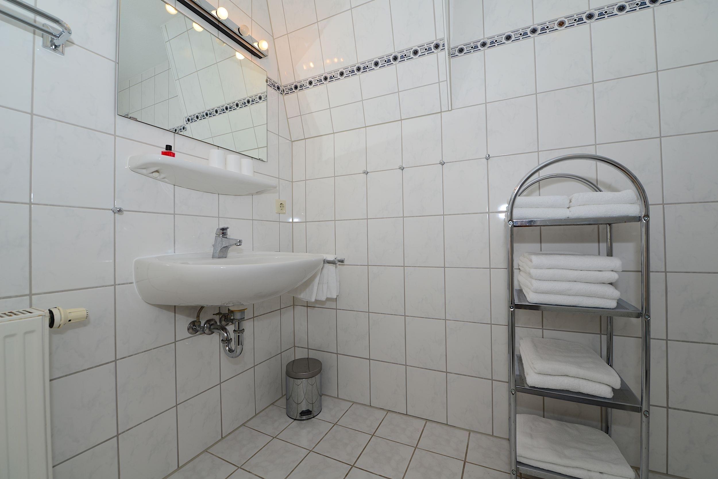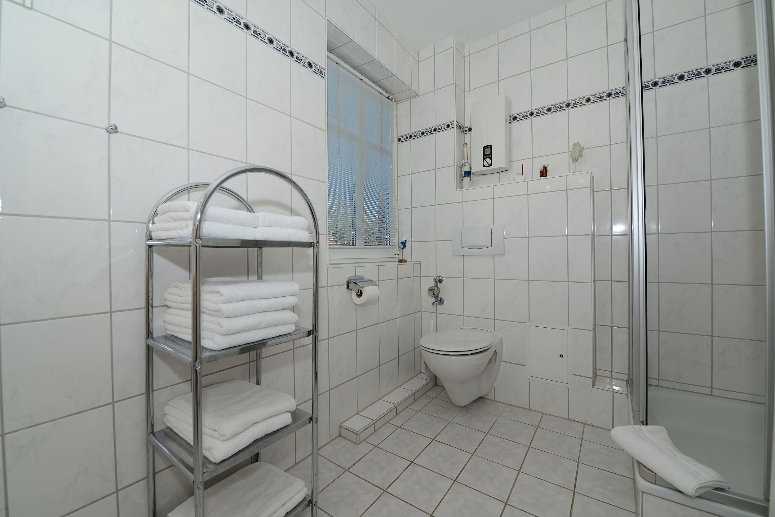 Das hell geflieste Badezimmer mit Dusch und Fenster ist durch seine längliche Form angenehm geräumig und bietet Ihnen Platz für eine entspannte Auszeit.