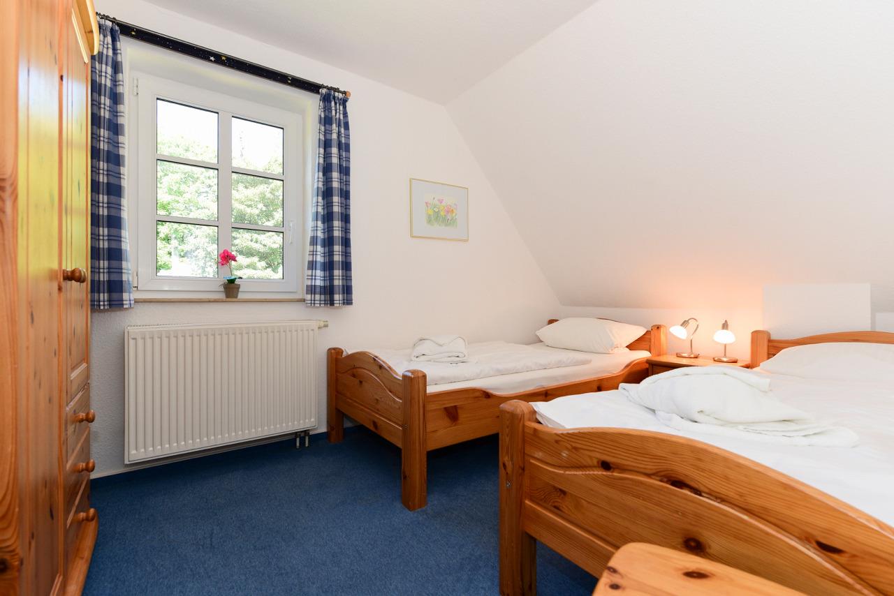 ein Zimmer mit Doppelbett und zwei weitere mit je zwei Einzelbetten.