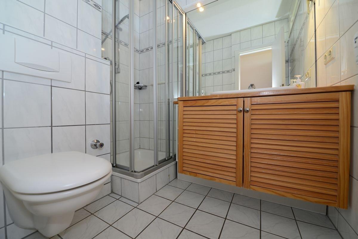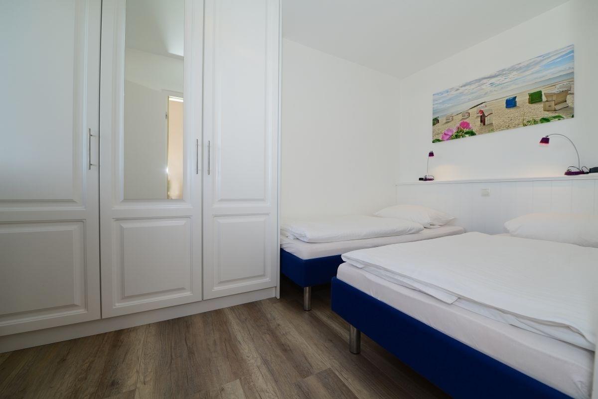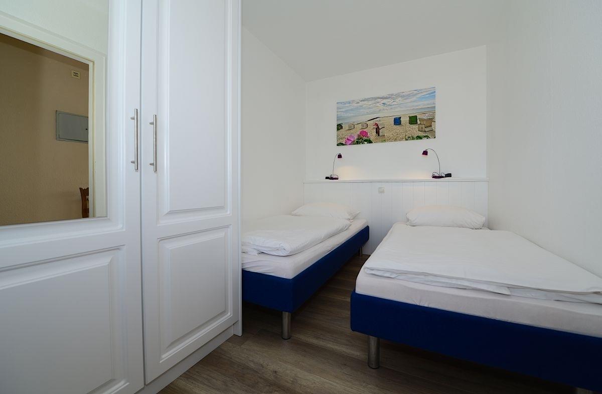 Im separaten Schlafzimmer mit Doppelbett können Sie sich nach einem ereignisreichen Tag erholen. Der Kleiderschrank bietet ausreichend Stauraum für Ihr Gepäck, und vom Fenster aus haben Sie einen tollen Blick auf die Stadt Wyk und die historische Wyker Mühle. Das helle Bad ist mit einer Dusche und einem praktischen Waschtisch ausgestattet.