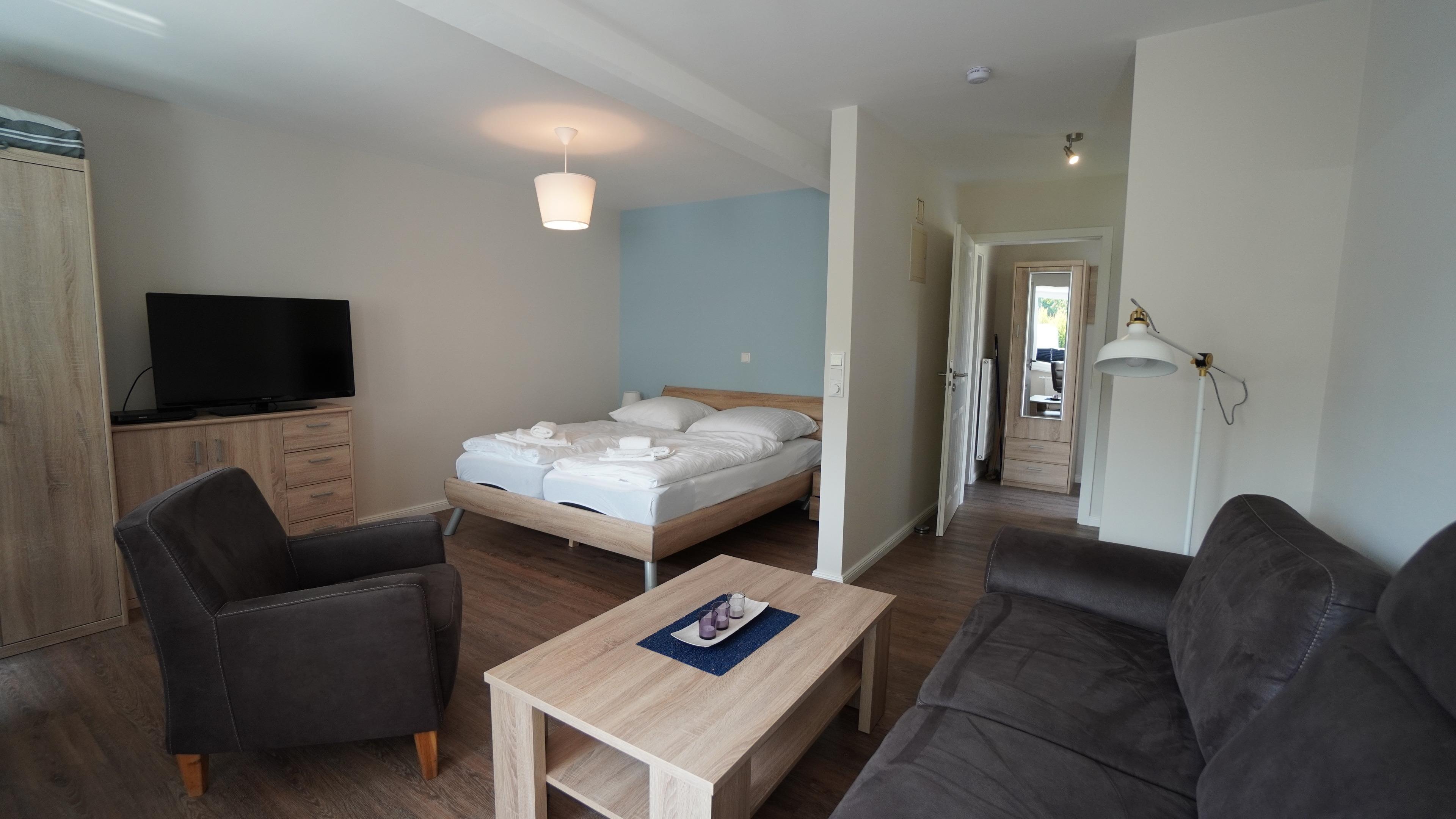 Mit etwa 35 m² bietet diese Einraumwohnung einen perfekten Rückzugsort für Alleinreisende oder verliebte Paare. Der durchdachte Wohn- und Schlafbereich ist harmonisch gestaltet und sorgt für eine entspannte Atmosphäre.