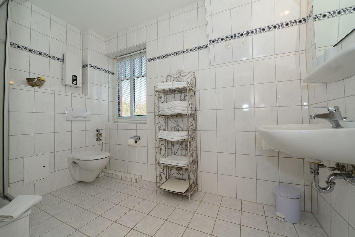Das weiß geflieste Badezimmer mit Duschkabine überzeugt mit viel Platz für Sie und Ihre Pflegeprodukte.