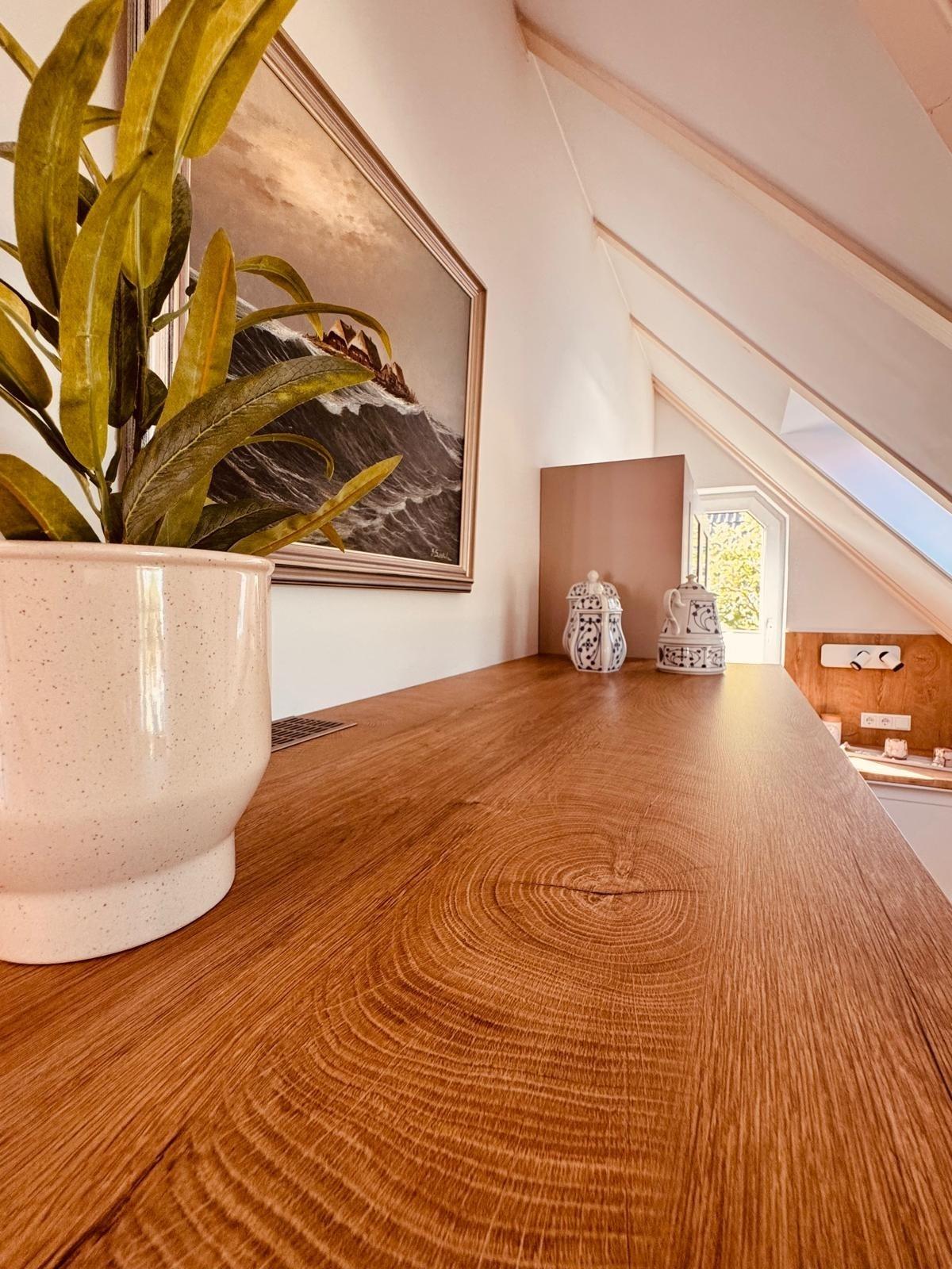 Die obere Etage beeindruckt mit einer offenen und hellen Architektur. Der großzügige Wohnbereich bietet saisonabhängig einen Blick auf die Nordsee und führt zu den beiden Balkonen, die zum Entspannen einladen. Der Wohnbereich teilt sich in zwei gemütliche Zonen: eine mit Ledersofas, ideal zum Entspannen oder für ein Nickerchen, und eine weitere mit bequemen Stühlen, um TV zu schauen oder ein gutes Buch zu lesen. Die Bose-Soundtouch-Anlage sorgt für musikalische Untermalung und macht den Aufenthalt noch angenehmer.